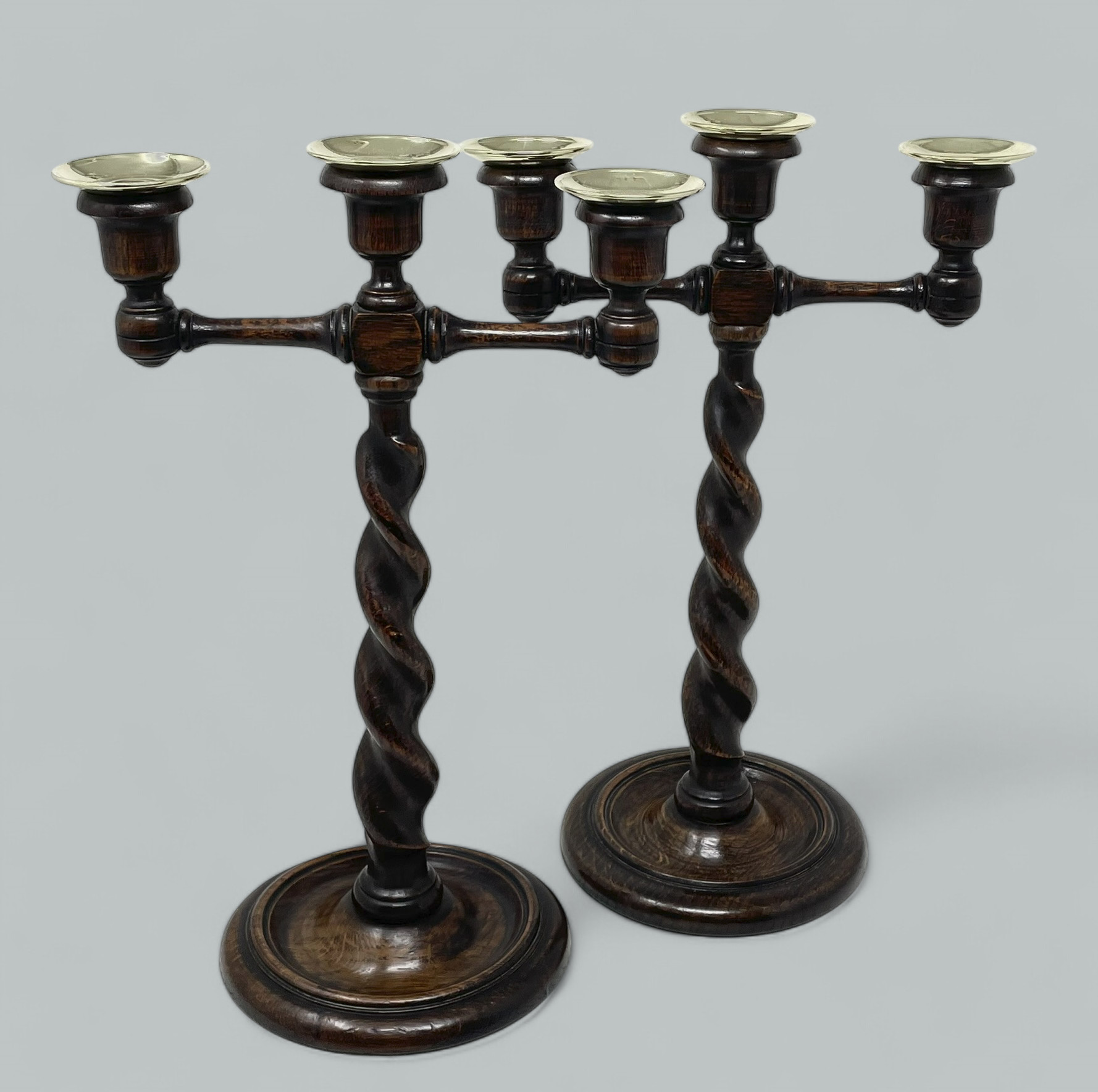This magnificent pair of Candelabra with twin outswept decorative arms, complete with their original drip pans. The central support barley twist cast ending on circular bases with ring turned decorative detailling.
