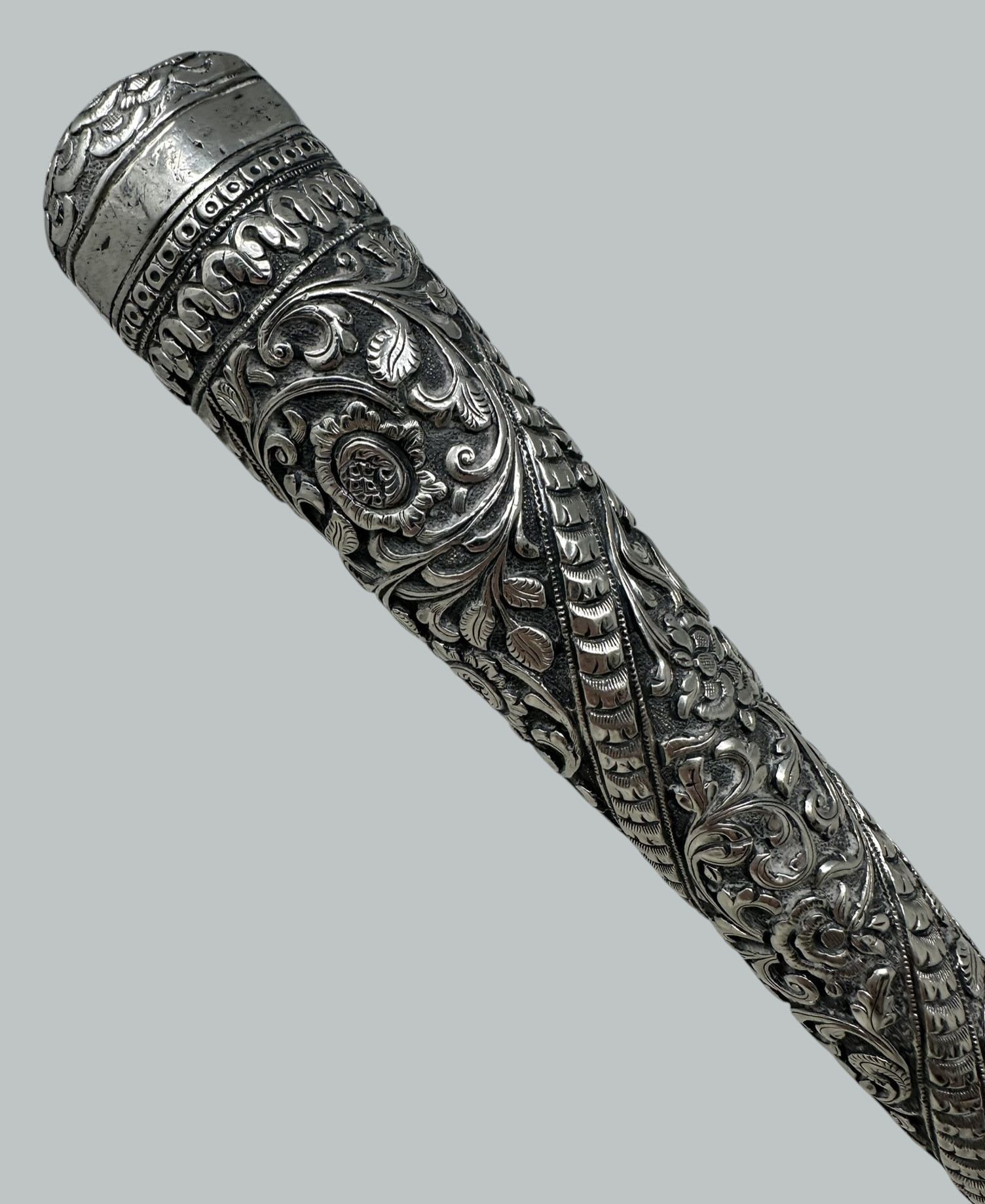 Fine Quality Anglo Indian Raj French polished Ebony Lady’s or Gentleman’s Walking Cane with a highly decorative embossed floral and scroll Sterling Silver Grip.