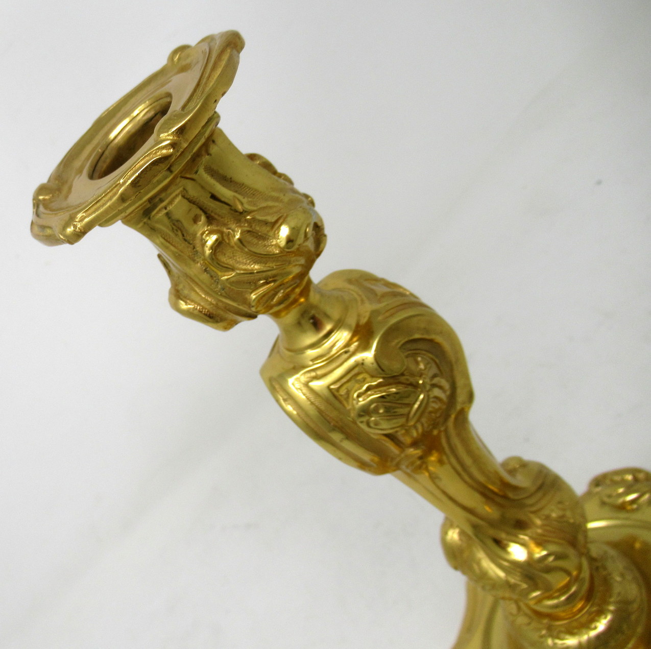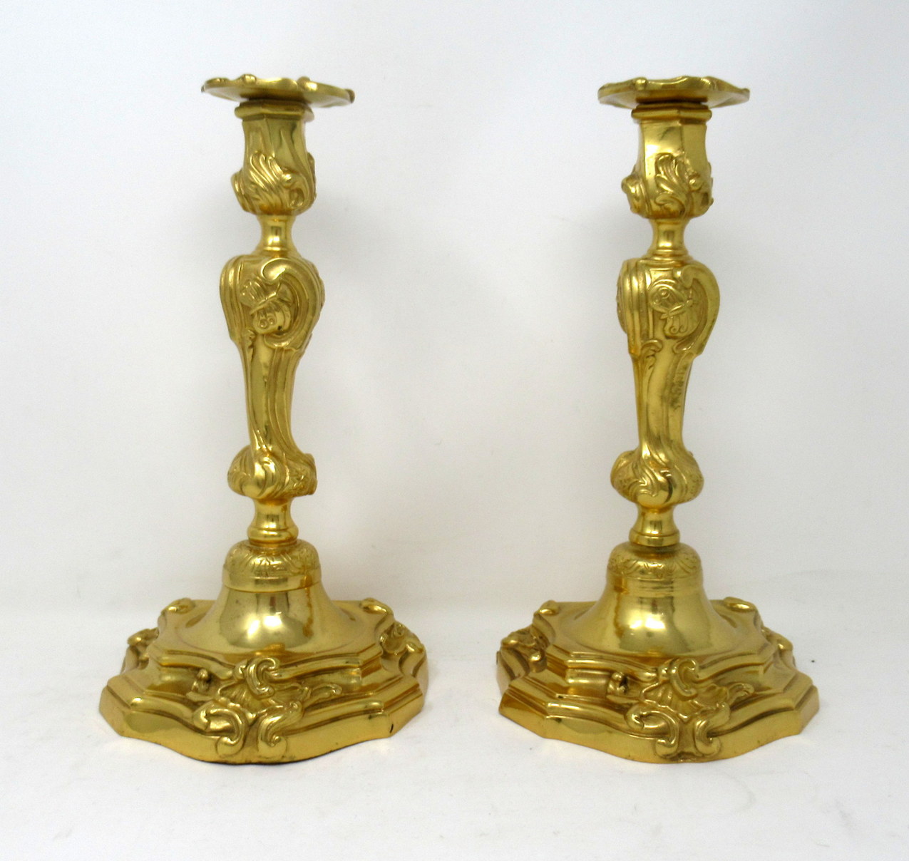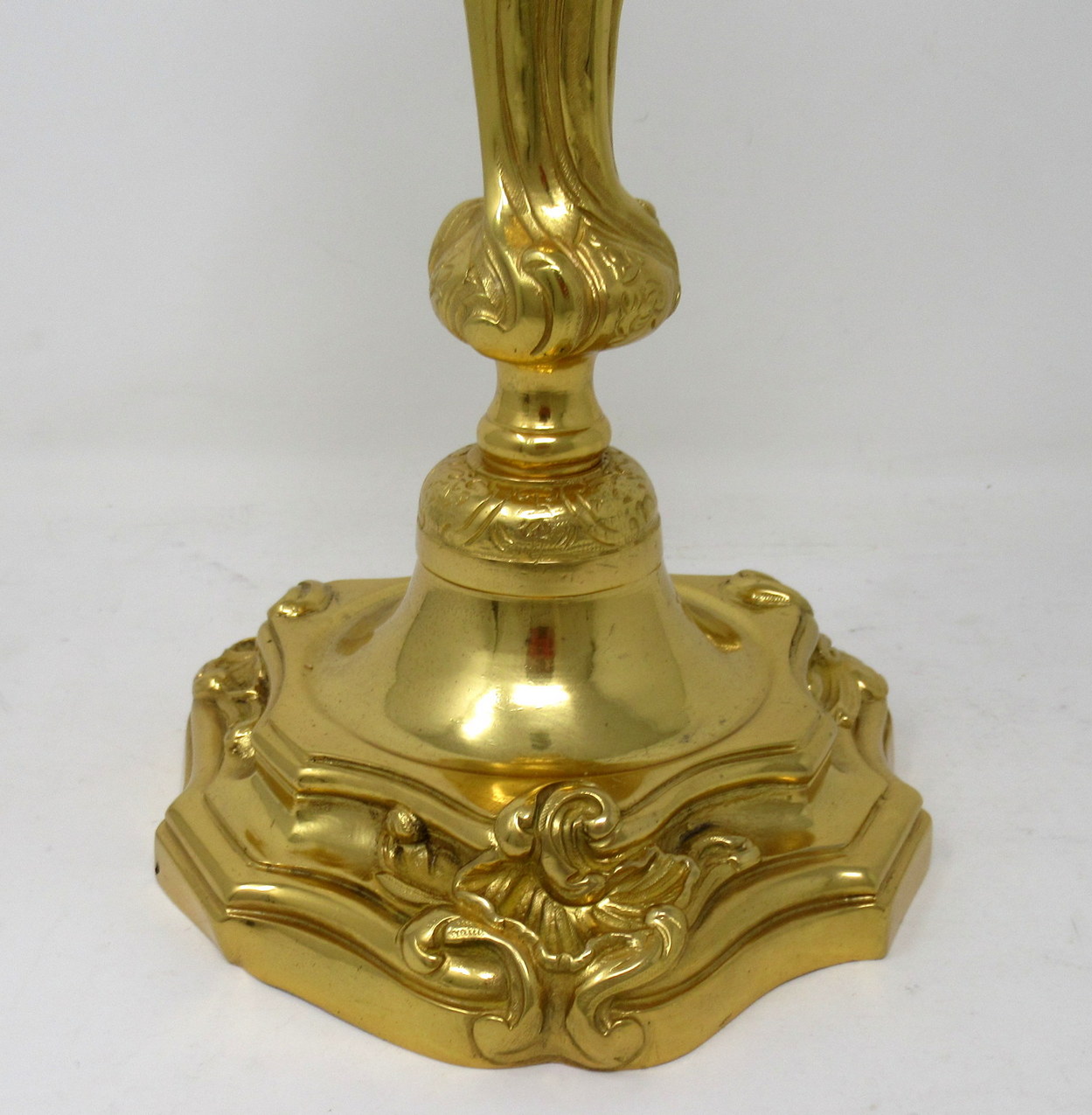 Each having a fluted tulip-form candle socket over a very ornate waisted central stem ending on domed circular lavish cast bases depicting insects, scroll and shell detail. Last half of the Nineteenth Century.
