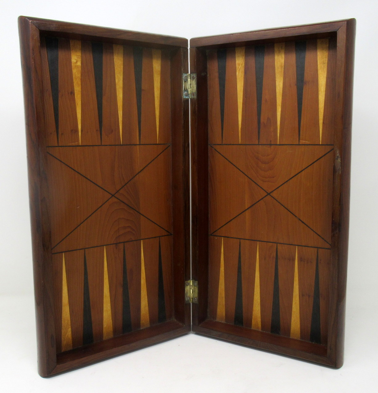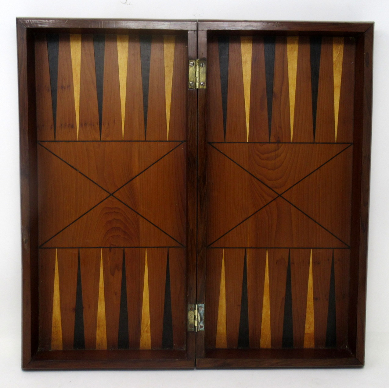 The main parquetry chess game area enclosed by an alternating border inside a plain wider border opening to reveal a traditional backgammon board.