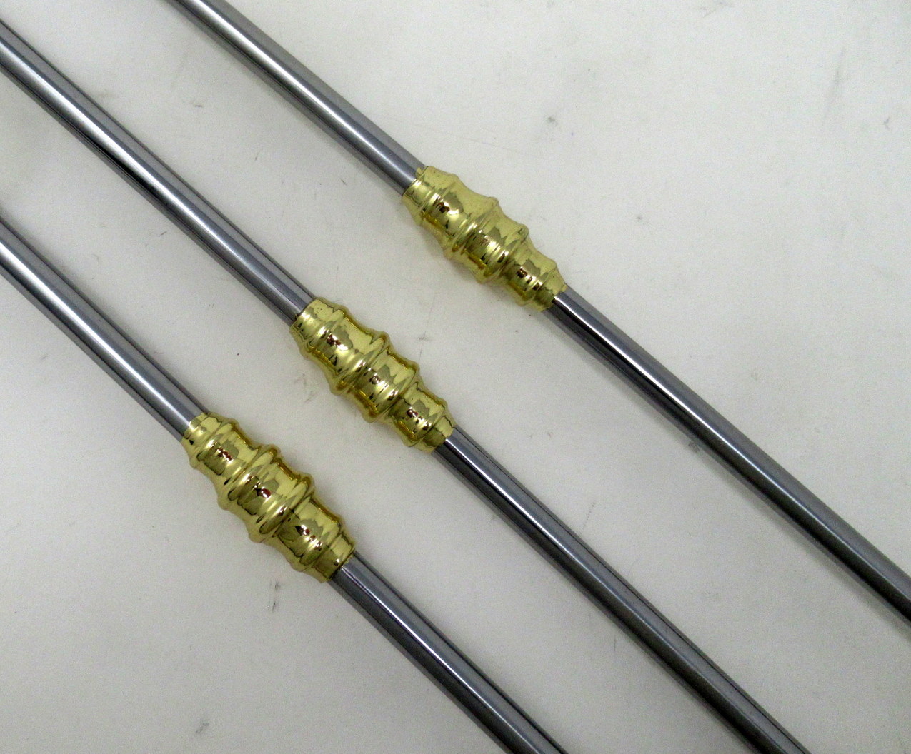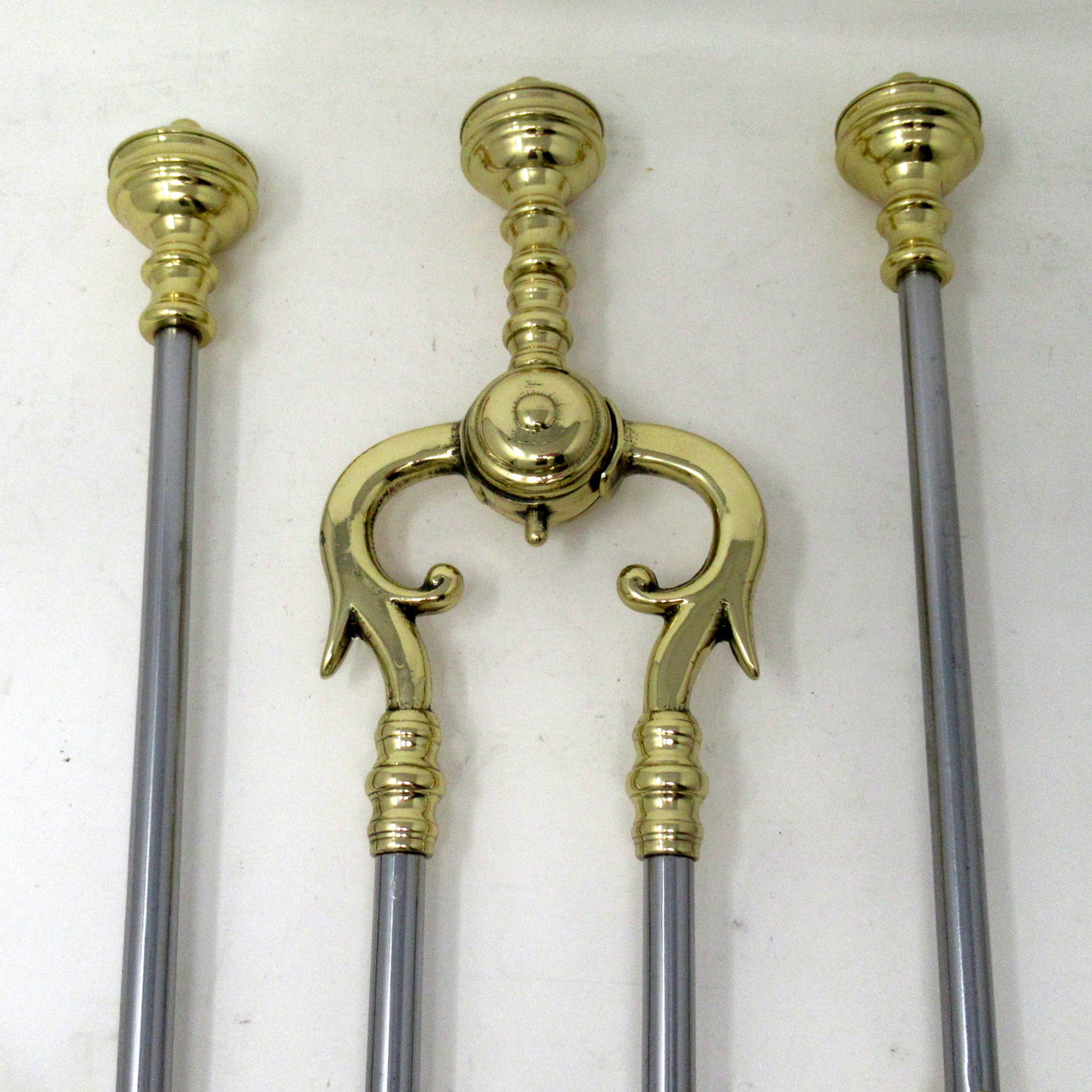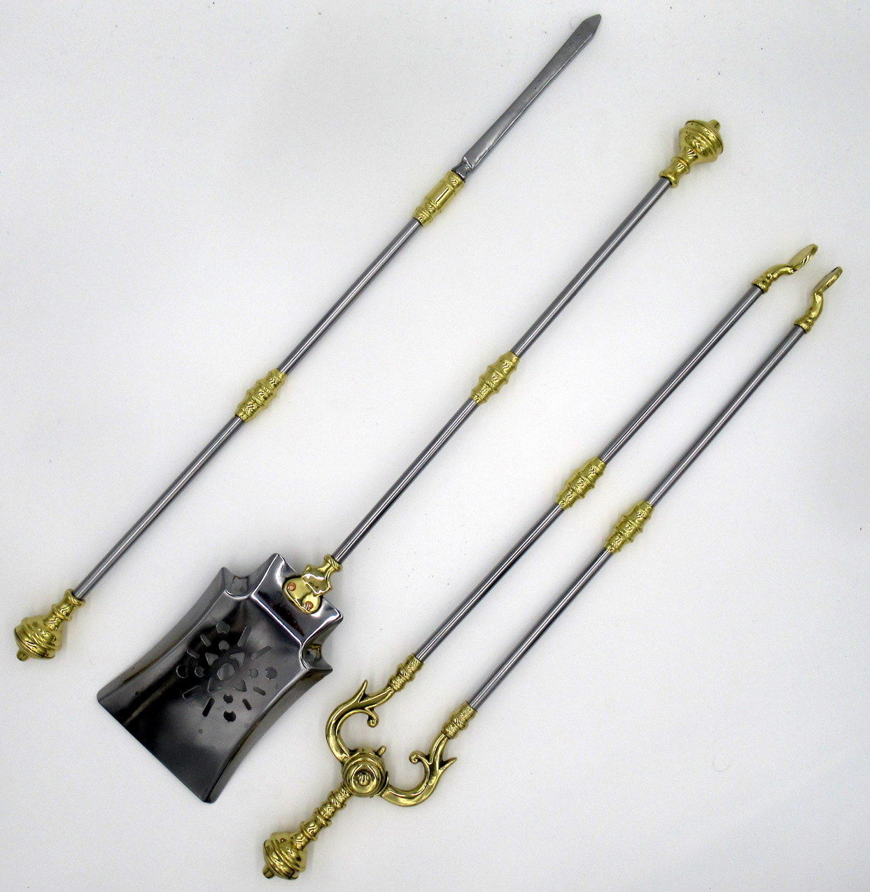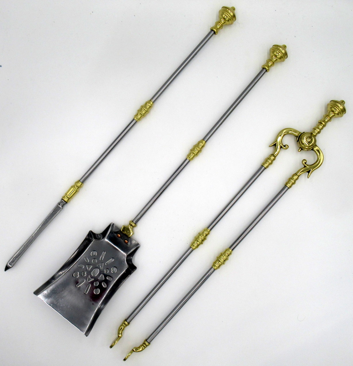 Comprising a poker, tongs and finely pierced flair tipped shovel all with stylish circular steel shafts with applied ring turned brass detailing, all pieces mounted with a brass circular and ring turned ornate handle with plain finial