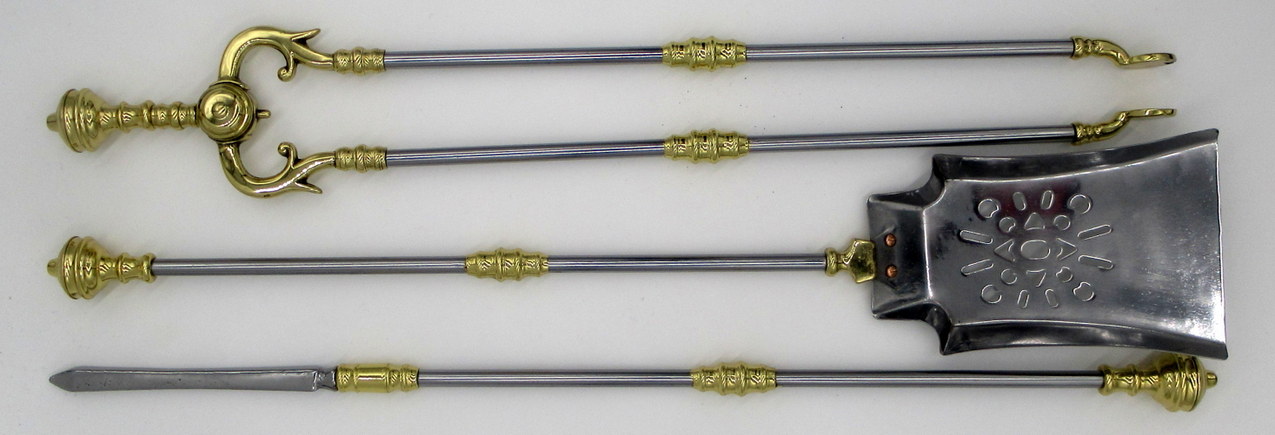 A Very Fine Original Set of Early English Victorian Polished Steel and Brass Fireplace Fire Tools of outstanding workmanship and quality. Mid Nineteenth Century. Circa 1860
