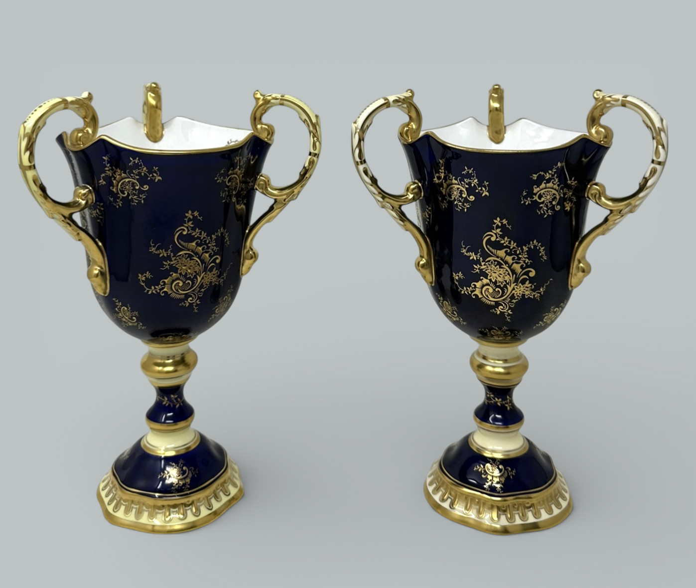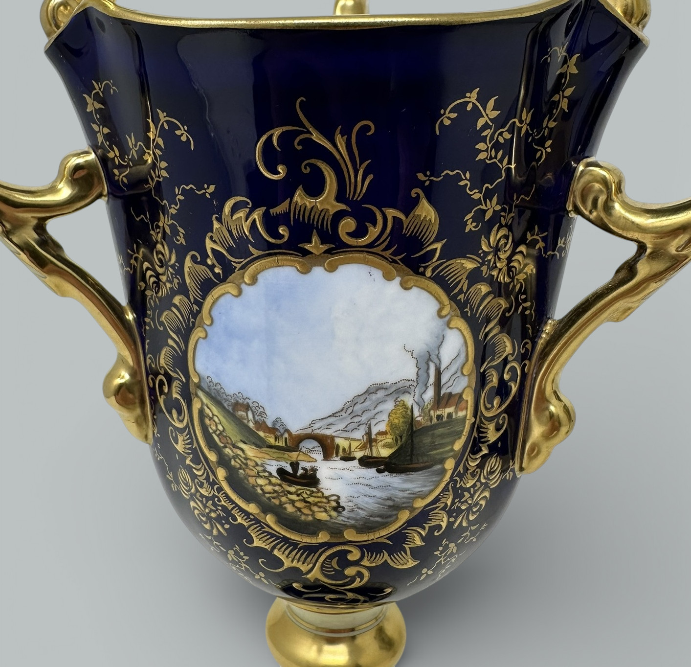 NOTE: One Vase depicting the Works at Ironbridge Gorge in Shropshire Numbered 39 out of 500 pieces, the urn with gold, blue, cream and gilt colouring, with three delicate handles, and a scene on one side of Ironbridge Gorge, Shropshire, with boats on the river, and smoke rising from the factory chimneys, with elaborate gilt patterns to the rest of the urn. and The second Vase numbered 39 out of 100 (1986) depicting Westminister Abbey (limited to 100 only) commemorating the marriage of Andrew Mountbatten Windsor to Sarah Ferguson with identical decoration.