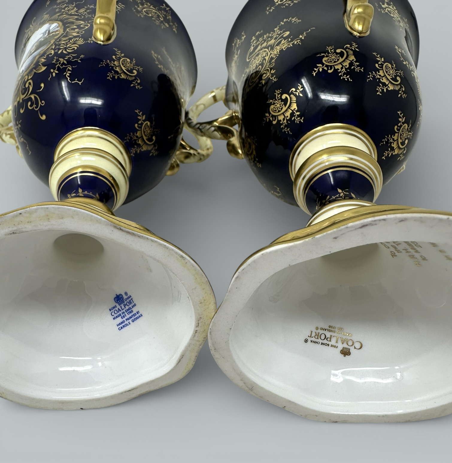 An Exceptionally fine and quite rare pair of hand painted Three Handle Coalport Trophy or Loving Cups Urns Vases often referred to as Tygs of Campana outline, early Twentieth Century.