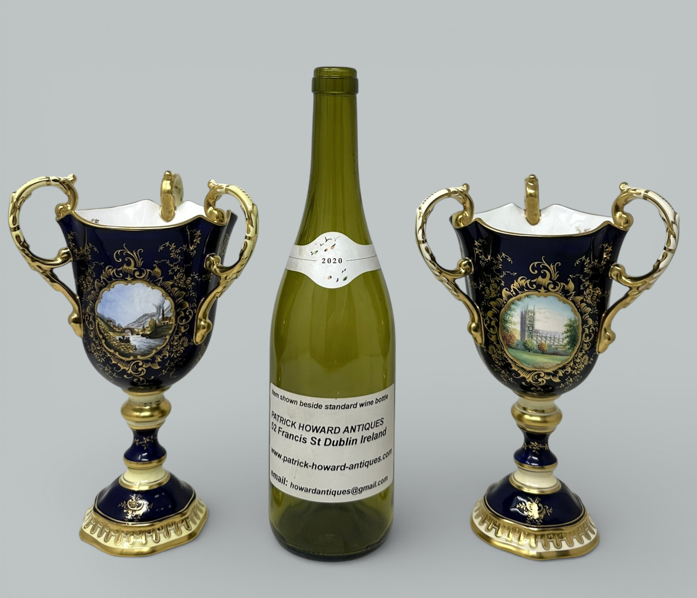 664. Antique Pair English Coalport Three Handle Loving Trophy Cups Porcelain Urns