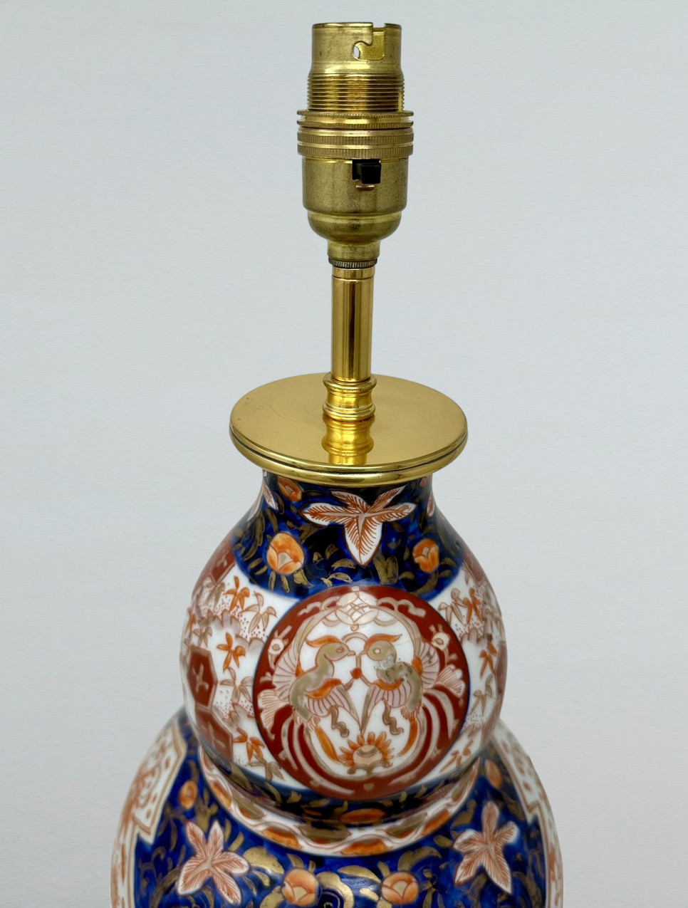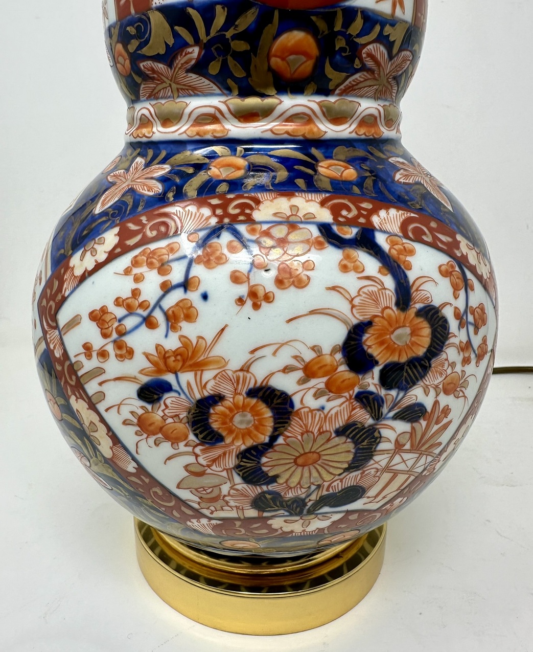 Stunning Traditional Japanese Imari hand decorated Porcelain Vase of seldom seen double gourd form glazed porcelain, of generous proportions, now converted to an Electric Table Lamp, complete with later plain heavy-duty Ormolu circular stepped base. Third quarter of the Nineteenth Century.