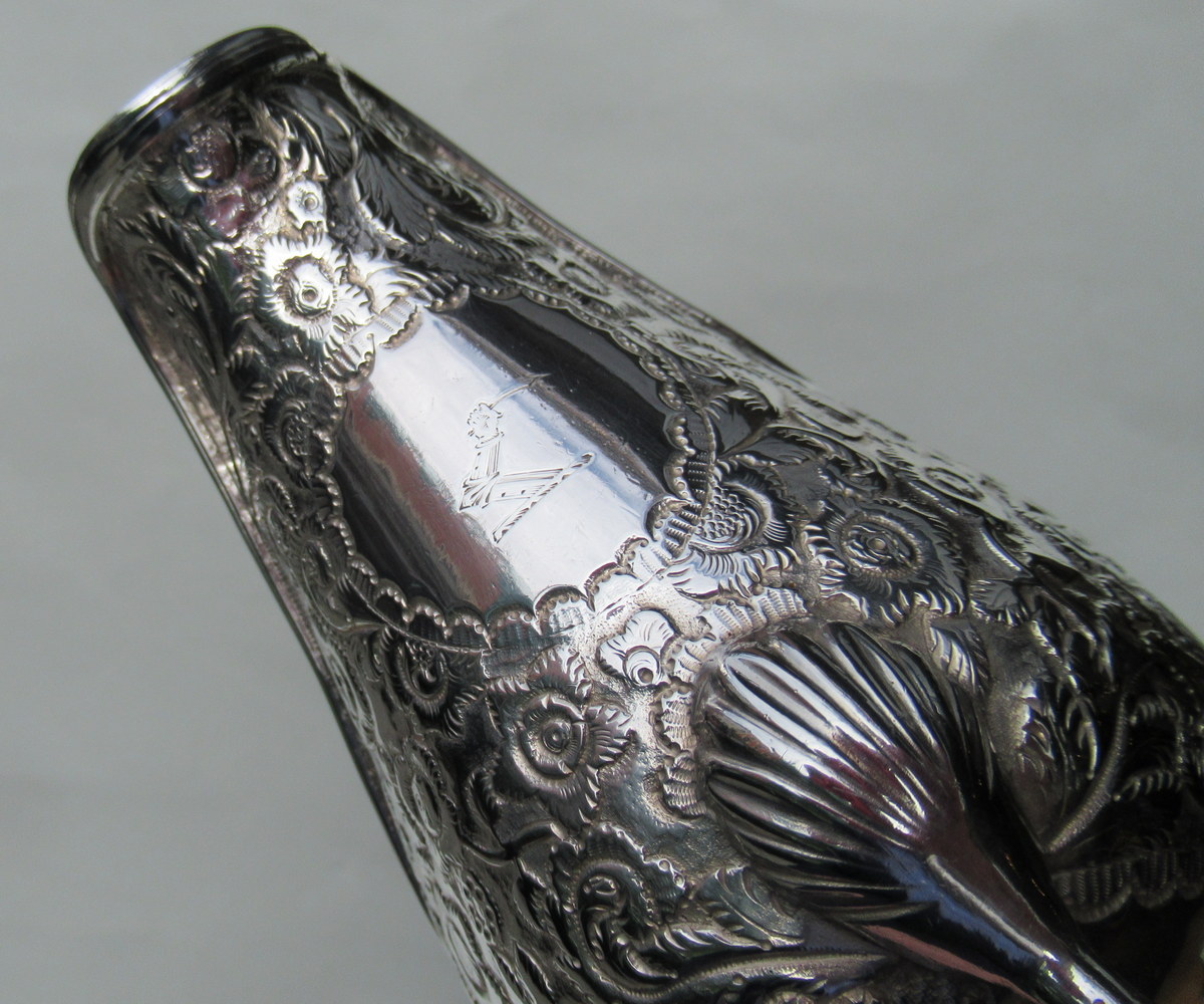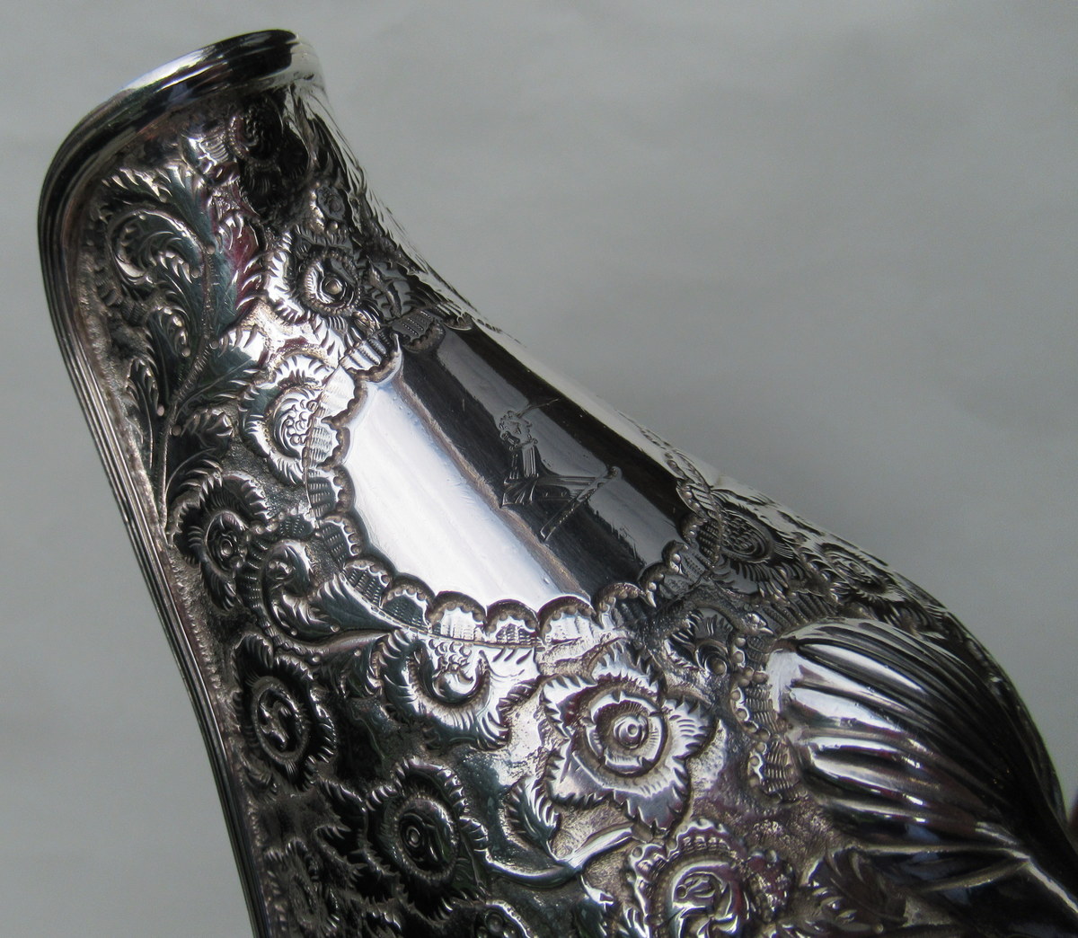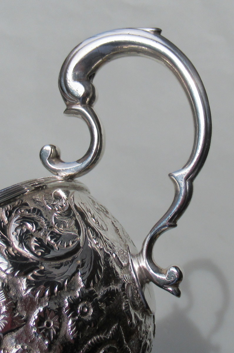 With fine reeded rim and leaf capped treble scroll handle, the main outer body with engraved foliate and floral decoration, crested and raised on three elegant shell and pad feet.