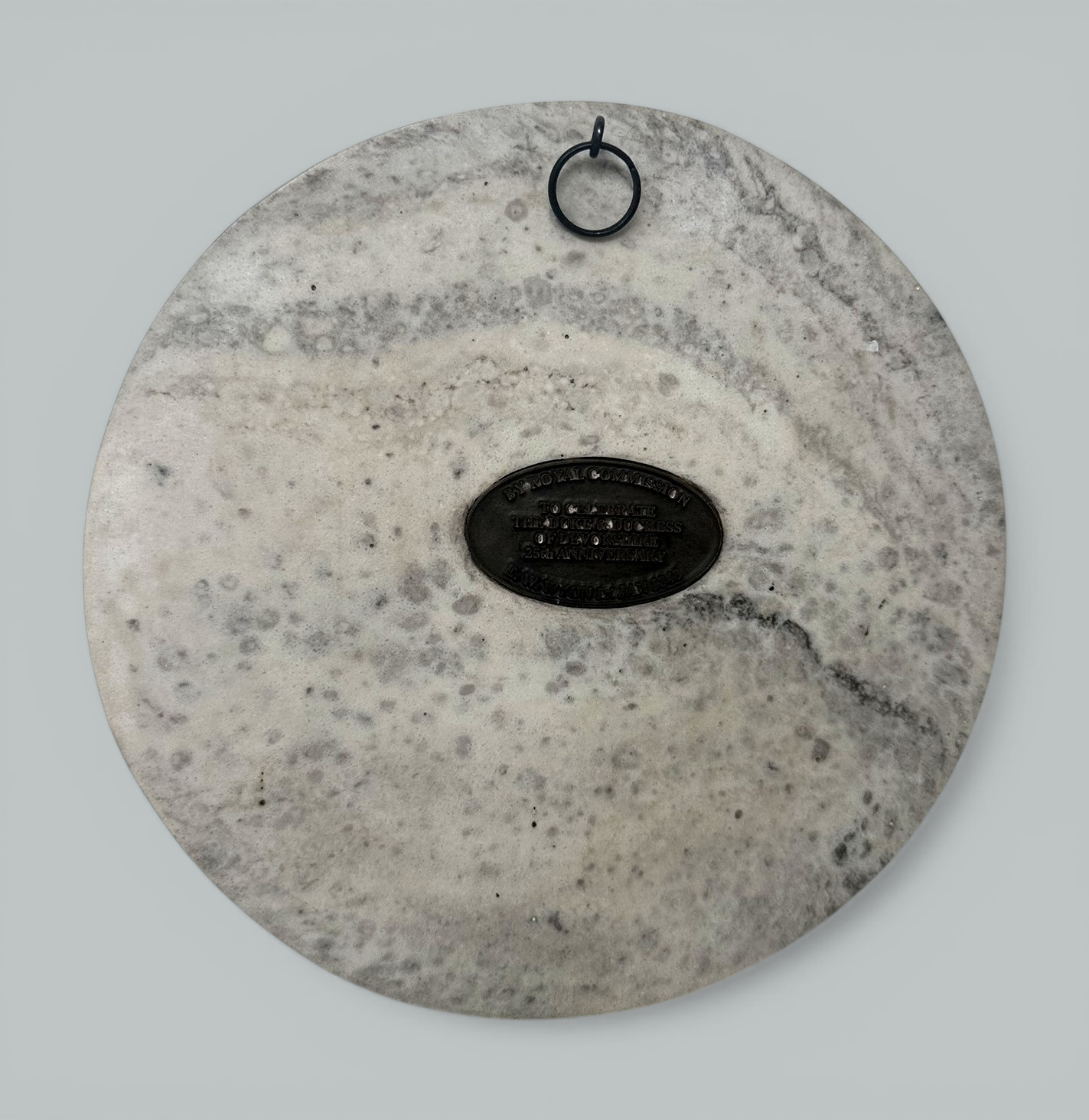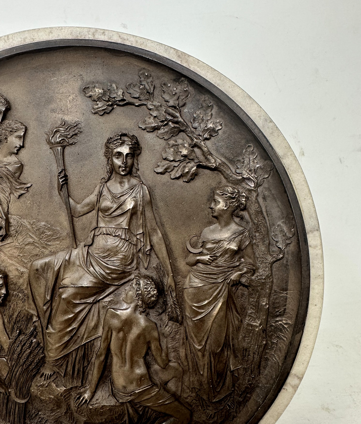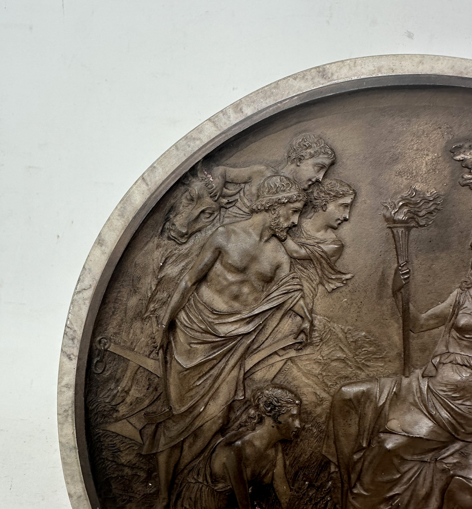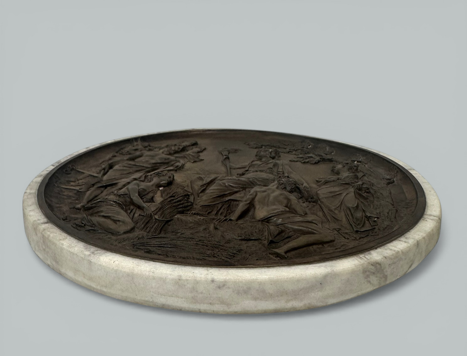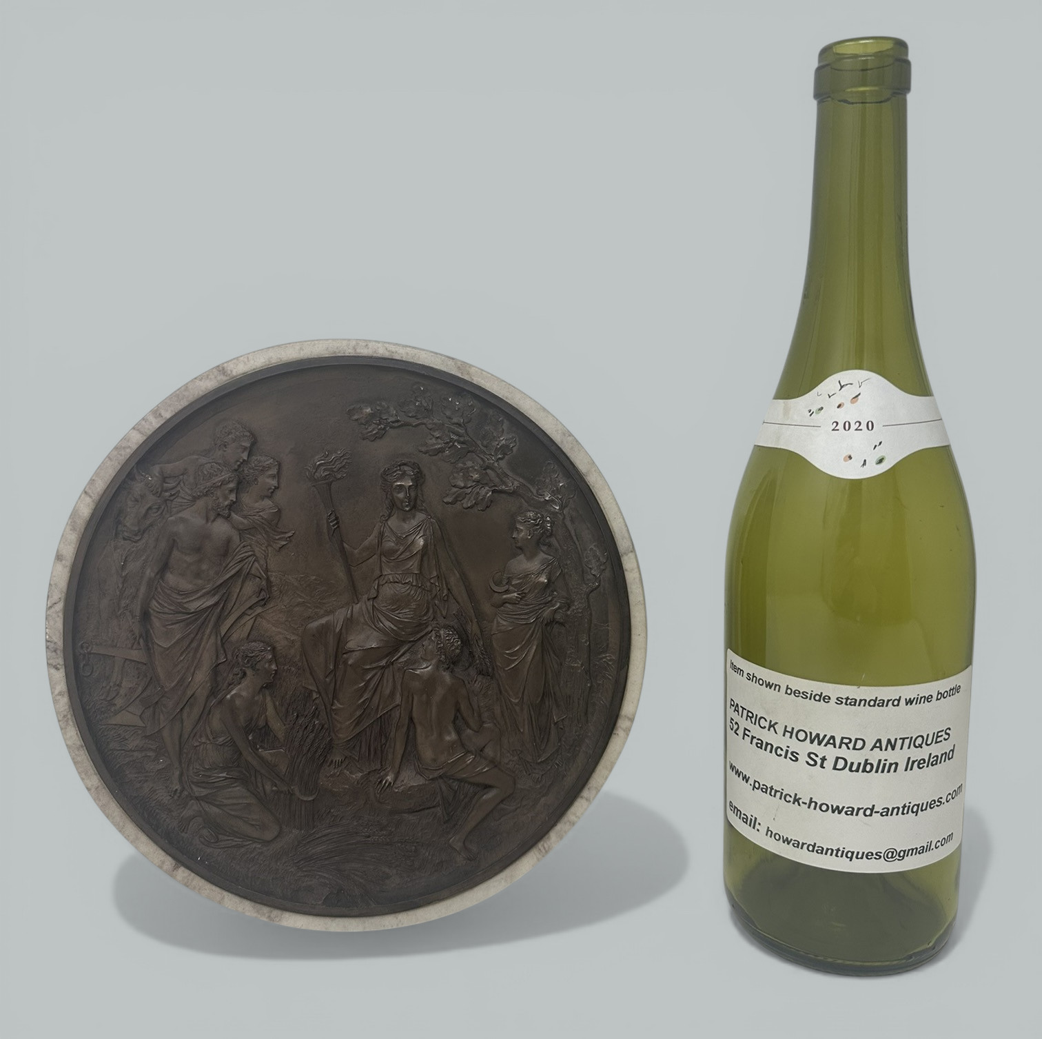Stunning Example of a Neoclassical Bronze Roundel Plaque of Irish interest, superbly cast in high relief, complete with its original cream marble frame surround. Depicting the seated goddess Demeter, goddess of the Harvest & Agriculture, holding a flame torch and surrounded by farm workers. Last half of the Nineteenth Century