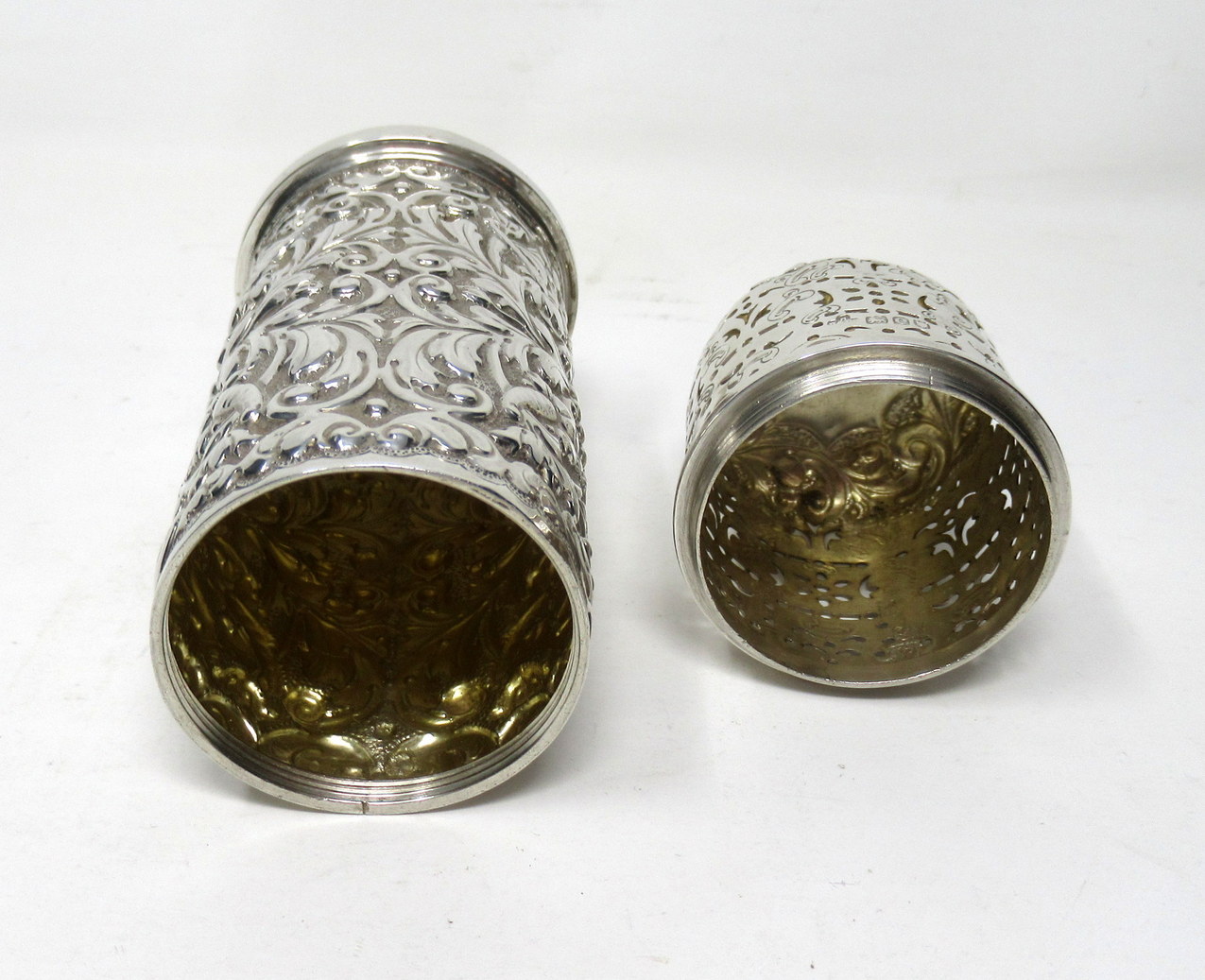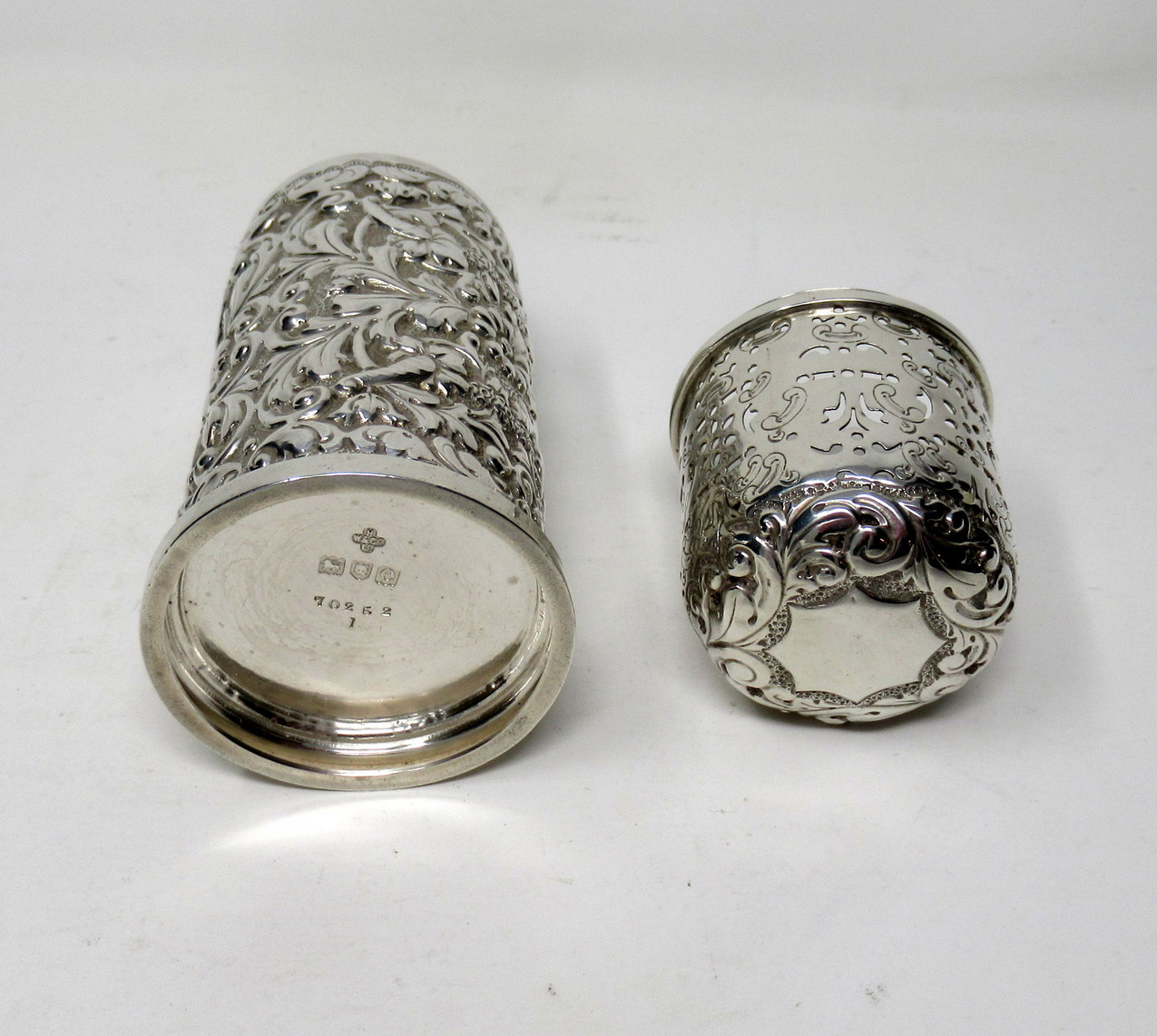 Stunning English Sterling Silver Two Part Table Sugar Caster Muffineer of cylindrical form ending on a circular spreading base.