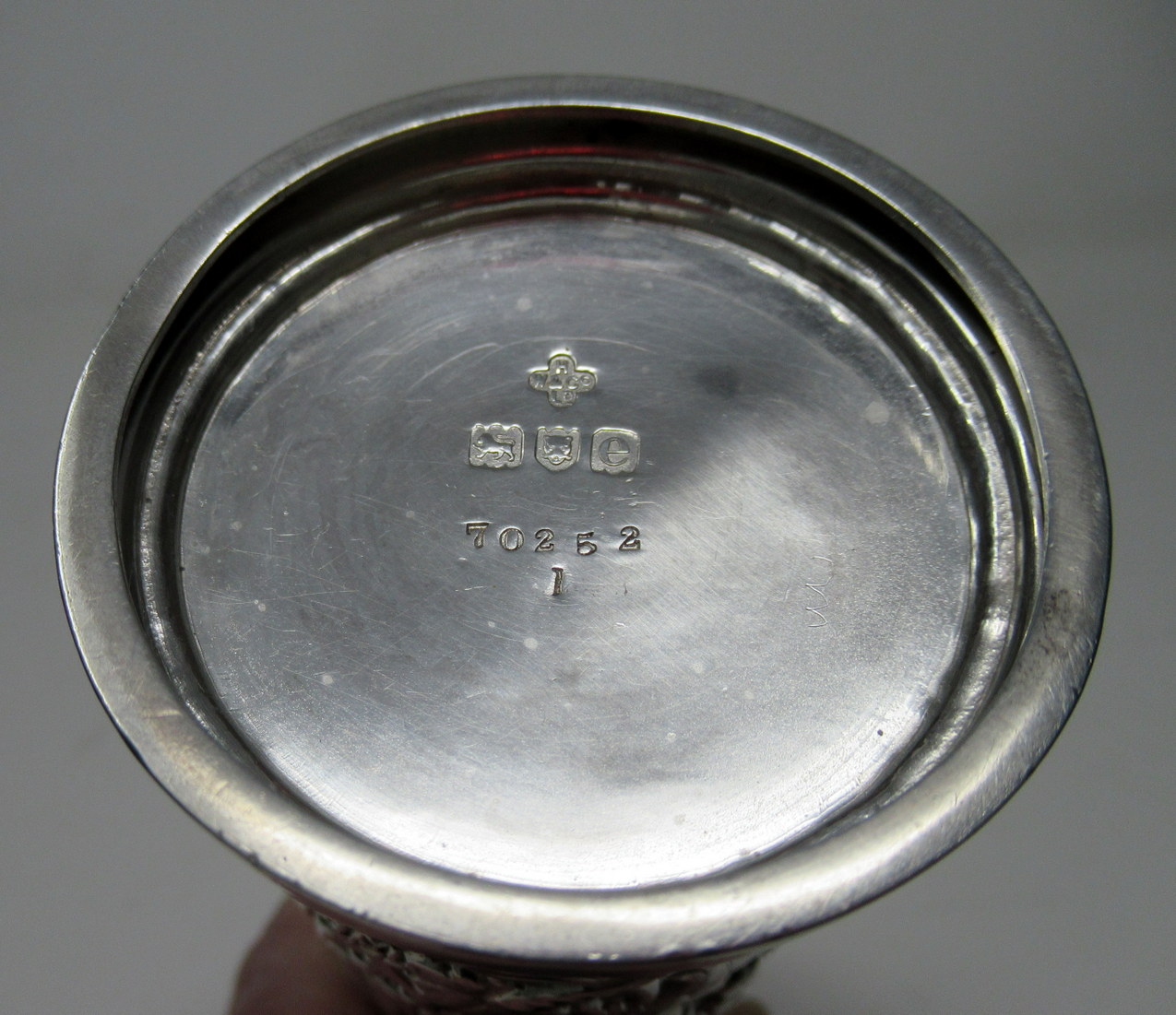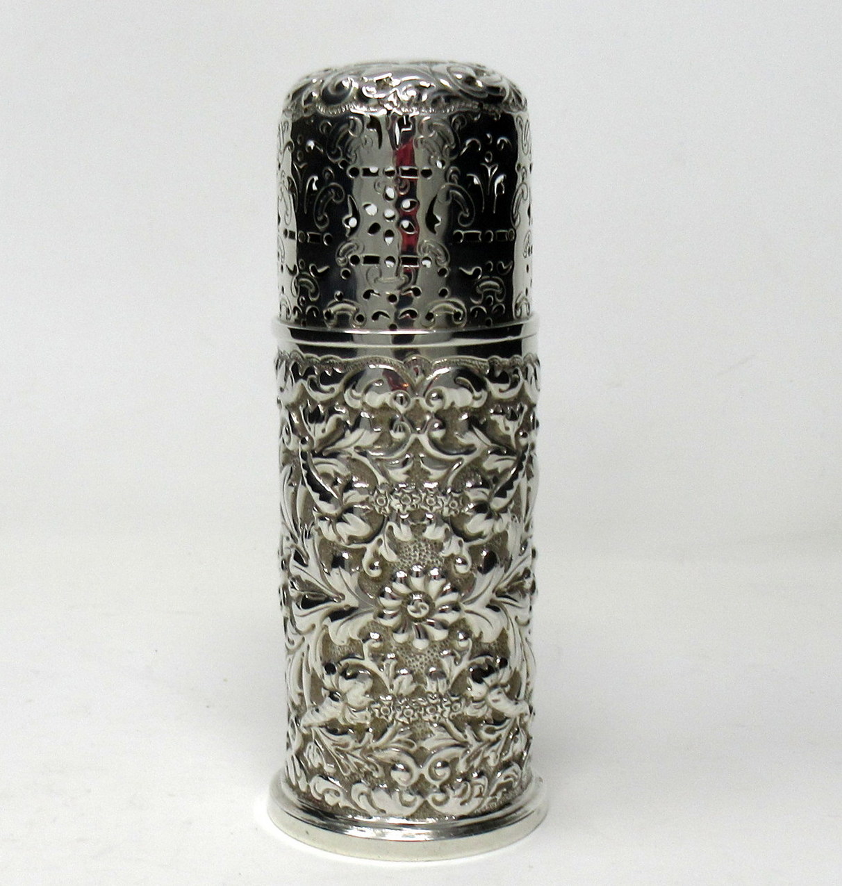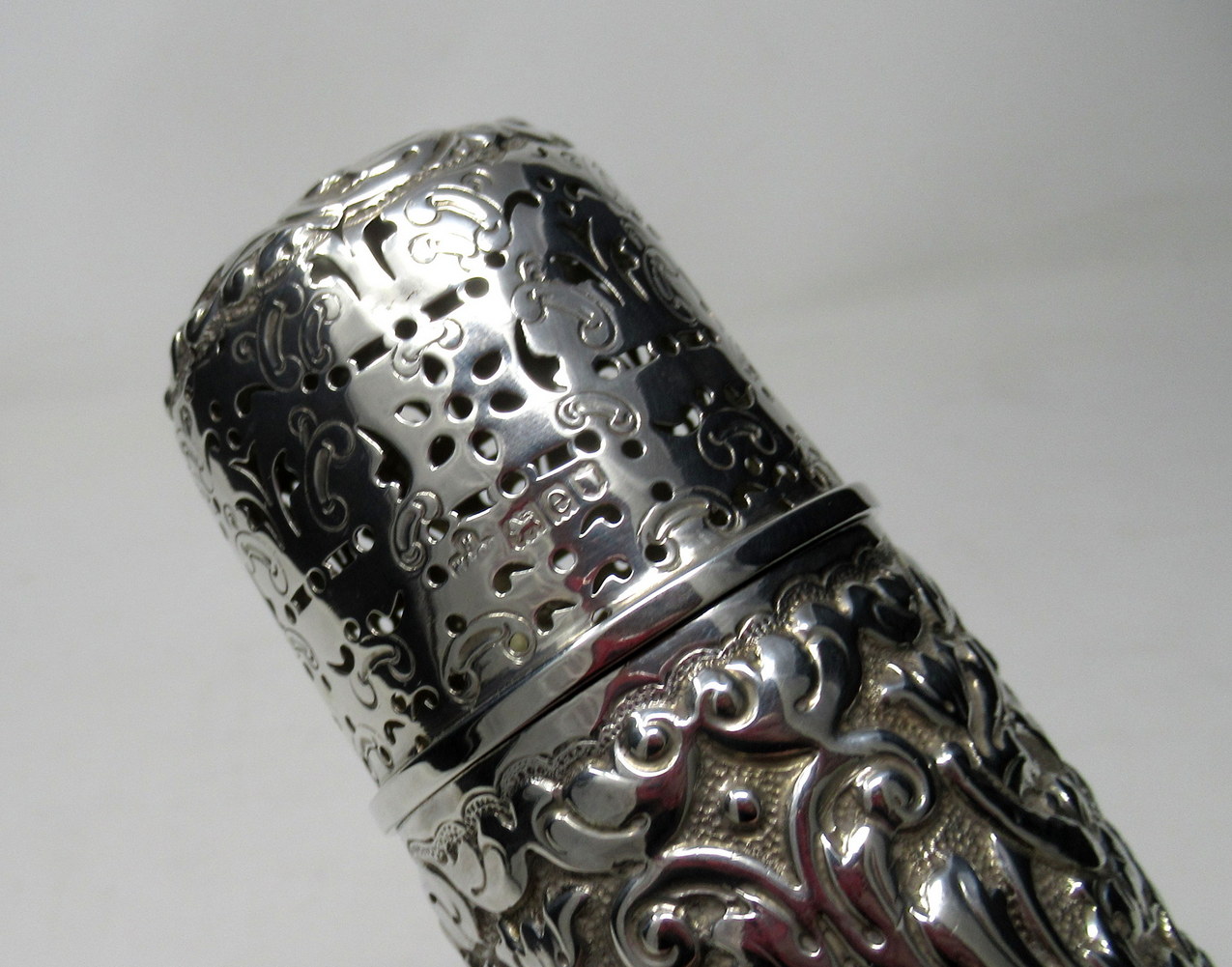 The entire embossed with flowers leaves and scrolls, with elements of Art Nouveau decoration. The original firm fitting screw mechanism cap with pierced star shapes and C scroll detail.