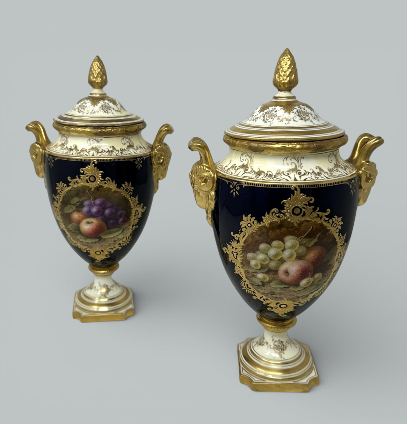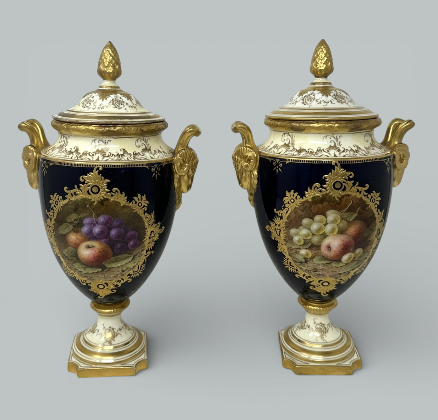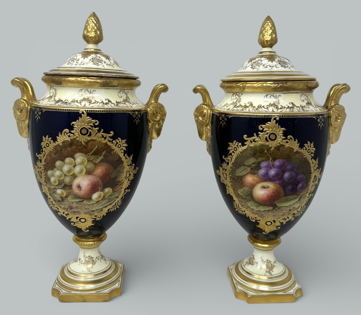 Each central reserve hand painted with a still Life of fruits depicting a large pear, plums, green and black grapes and blackcurrants on a mossy and ivy clad bank, each signed lower left, within a broad cobalt blue ground enriched with lavish 24ct. gilt raised gilt surround, dark green painted crown mark as shown. Complete with striking Pineapple finials on original covers that enhance their grand presence.