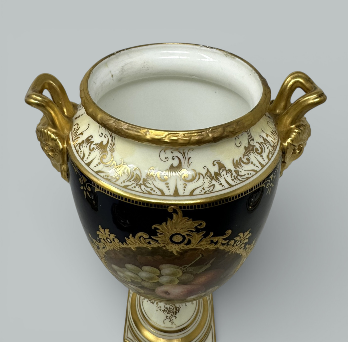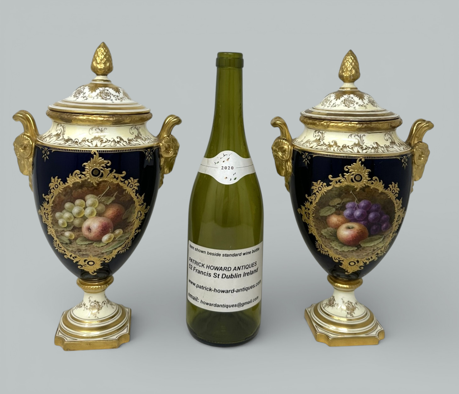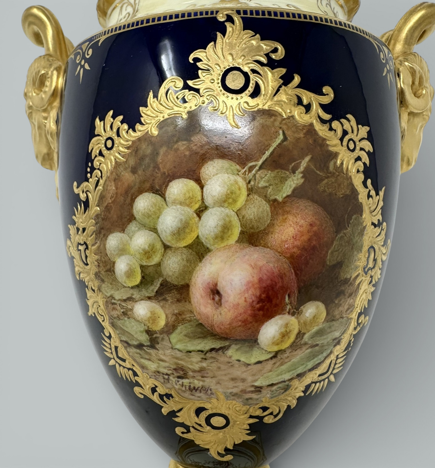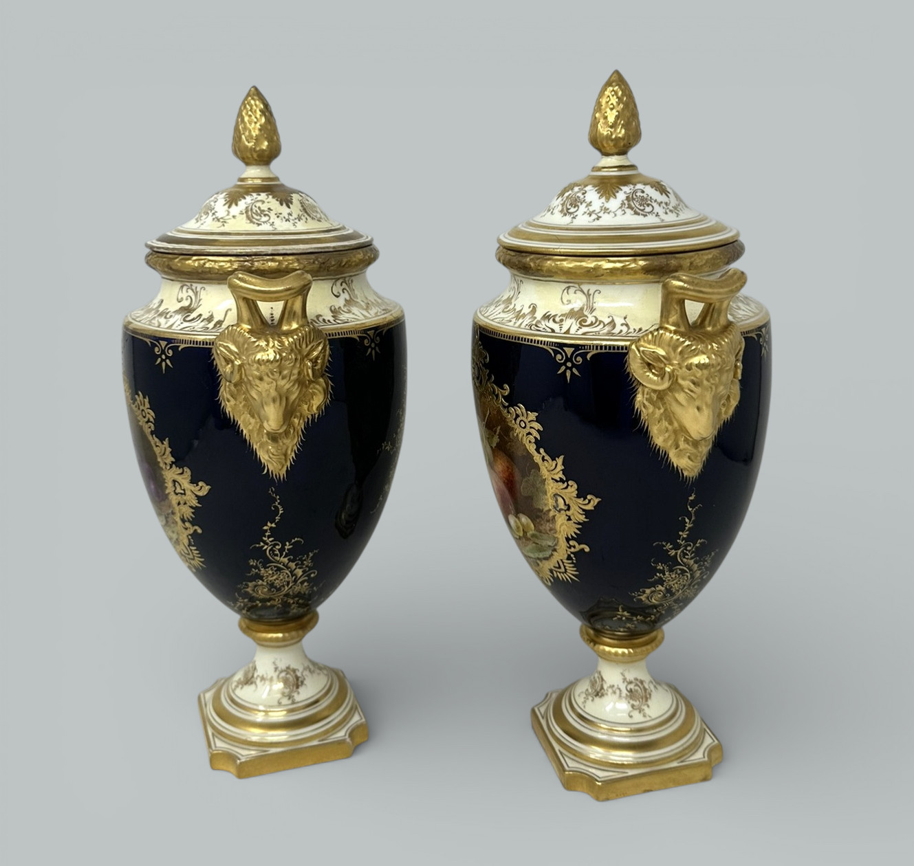 Each central reserve hand painted with a still Life of fruits depicting a large pear, plums, green and black grapes and blackcurrants on a mossy and ivy clad bank, each signed lower left, within a broad cobalt blue ground enriched with lavish 24ct. gilt raised gilt surround, dark green painted crown mark as shown. Complete with striking Pineapple finials on original covers that enhance their grand presence.