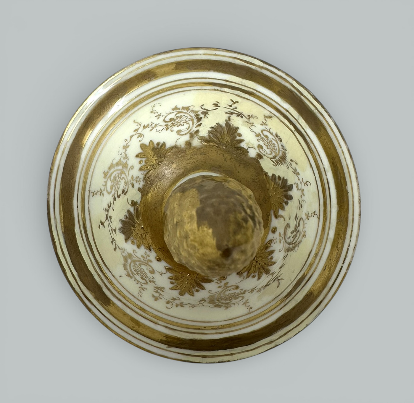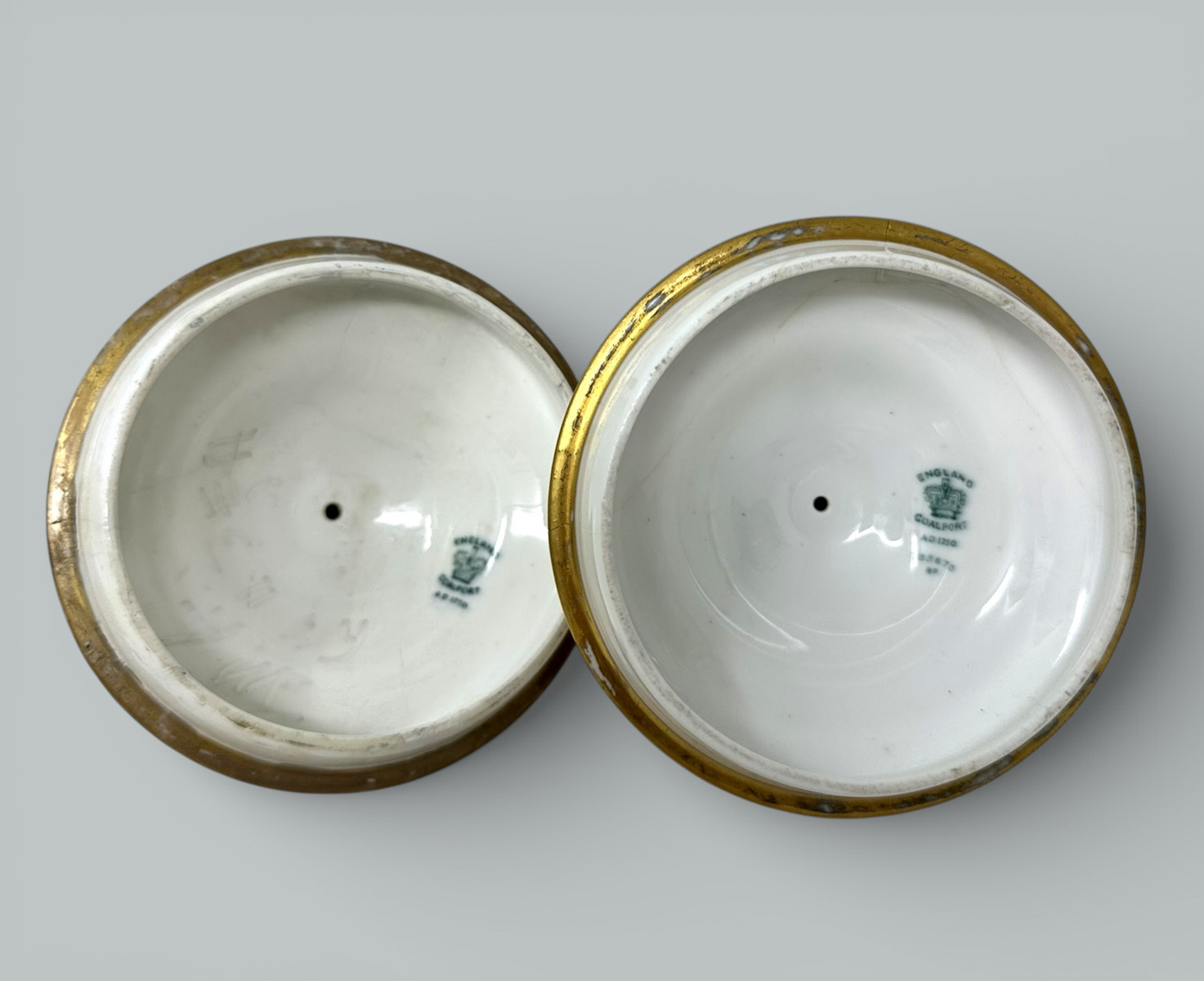 Height: (entire as shown image one) 12″ (30cm). Width: (at widest across gilt handles) 6.75” (17cm). Depth: (upper body) 5.25” (13.5cm).