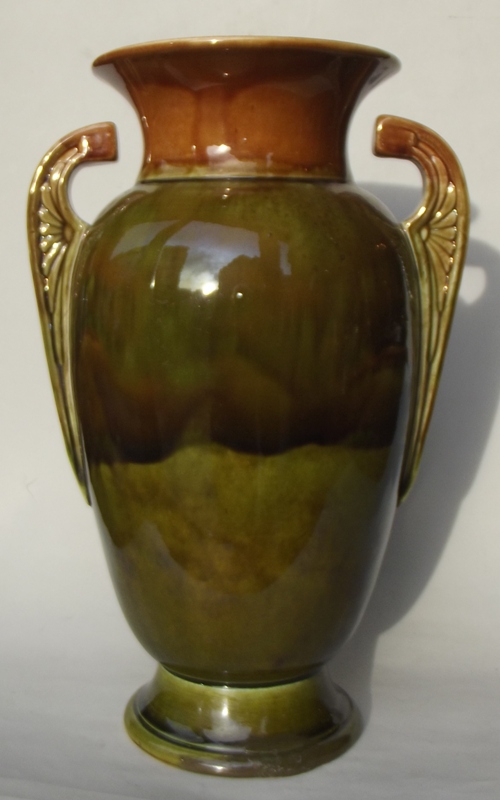An extremely rare Pottery Vase of baluster outline with flared neck and circular spreading base. Twin handles moulded with Celtic stylized leaves in mottled Autumn colours of rustic greens and browns.