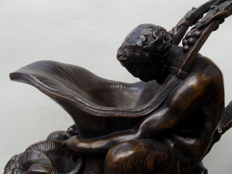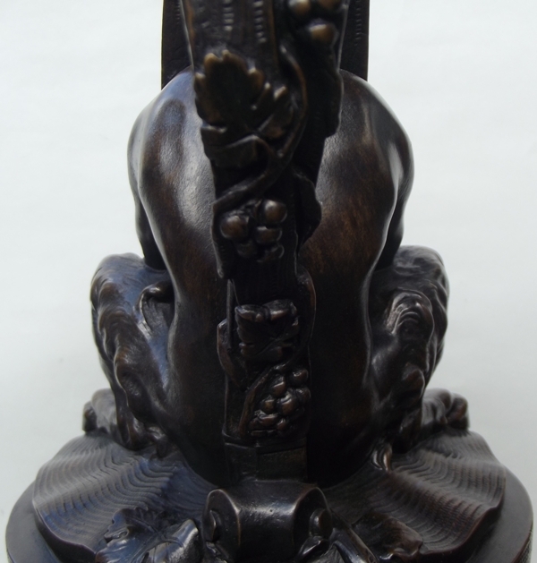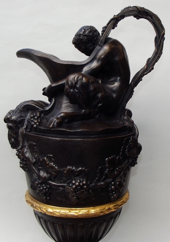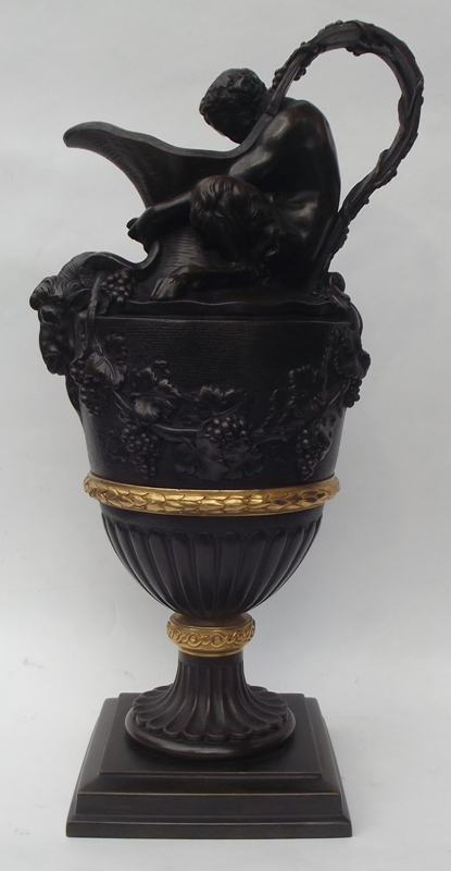 NOTE: In 1774 Sigisbert-Francois Michel exhibited a pair of plaster ewers (possibly derived from a model by Claude Michel Clodion 1738-1814) surmounted by a triton and a satyr (emblematic of water and wine) in the Académie de Saint-Luc, Paris. This prototype was later the basis for a number of subsequent ewers in malachite, biscuit, porcelain and bronze.