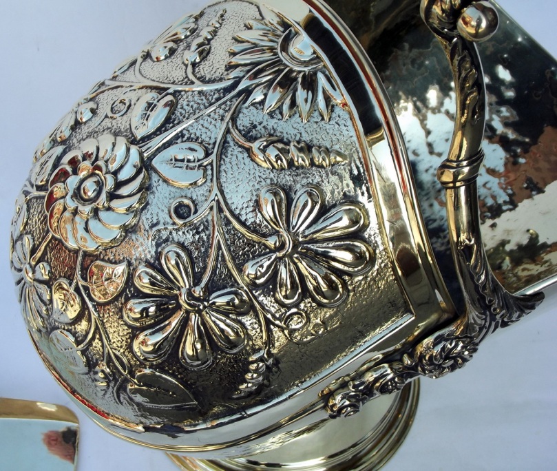 An Exceptionall fine Quality Highly Decorative Coal Scuttle of Traditional Helmet Form, raised on a circular spreading base. Circa 1900, possibly earlier.
