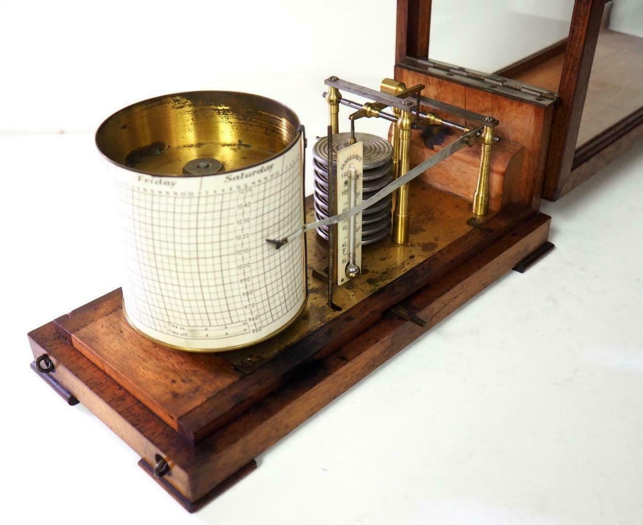 711. Antique English Carved Oak Cased Barograph Scientific Weather Machine