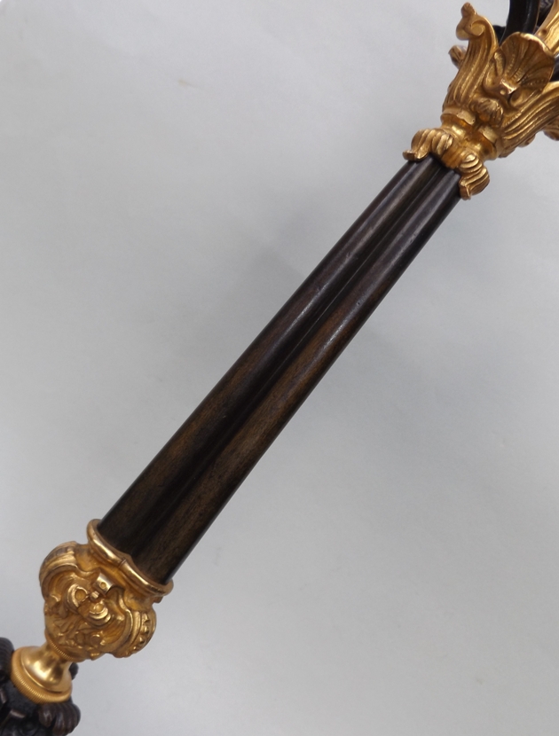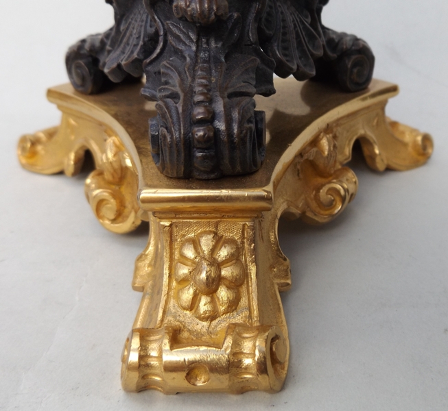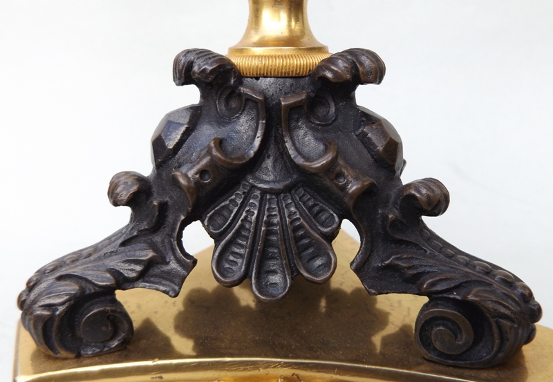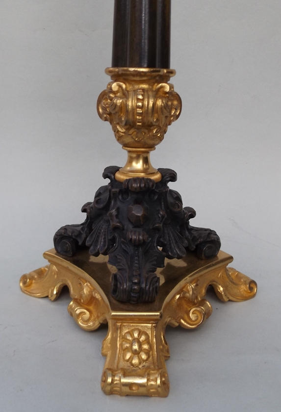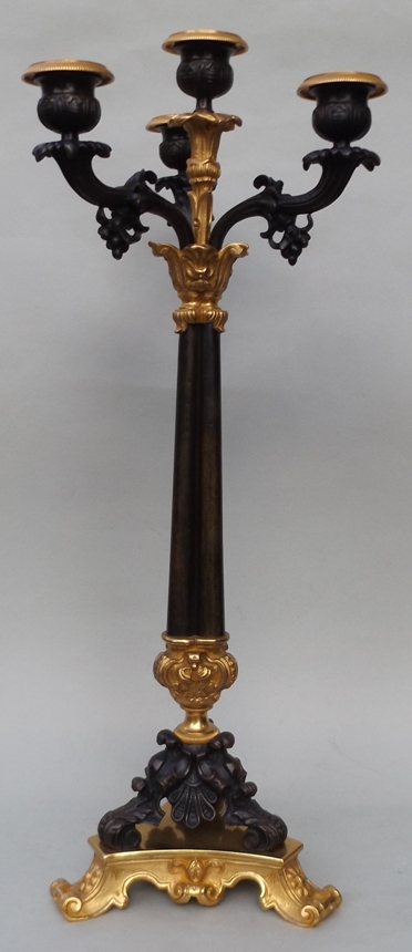 The four ormolu candleholders complete with attached drip pans, on a central plain tapering bronze support terminating on three ornate acanthus bronze monopodia supports, on unusual tri-form concave sided ormolu bases.