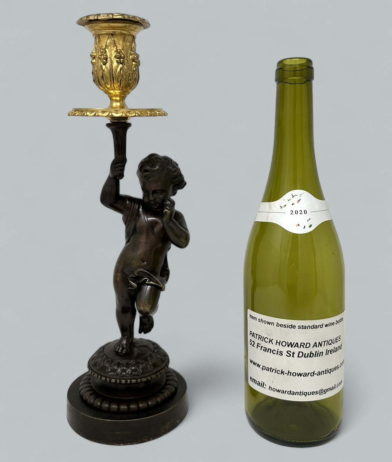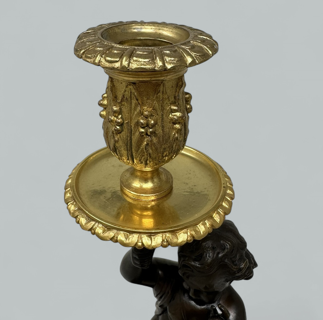 739. Antique Grand Tour Style French Ormolu Bronze Dore Cherub Putti Candlestick 19Ct
