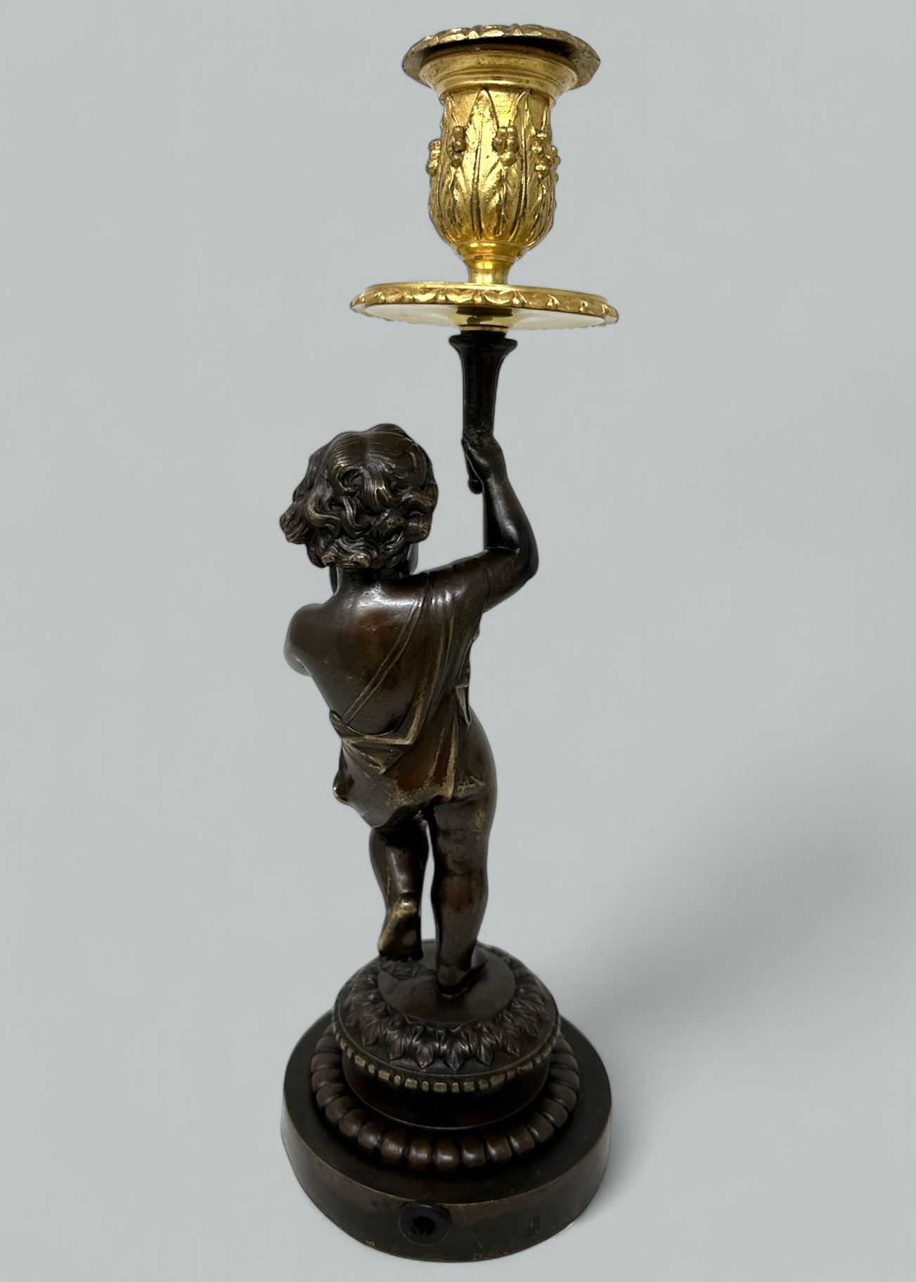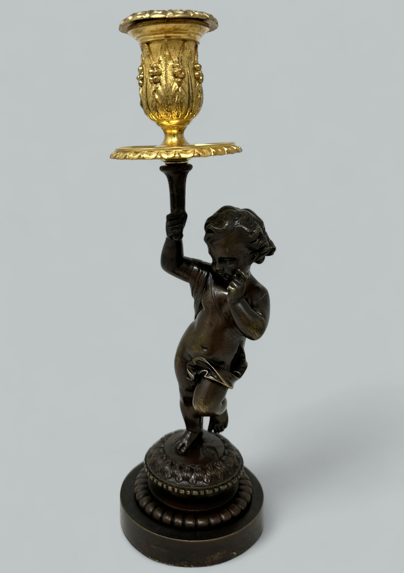 Holding aloft a single ormolu candlestick holder, complete with its original firm fitting drip pan, ending on a very decorative circular bronze base above a socle, ending on a plain bronze support.