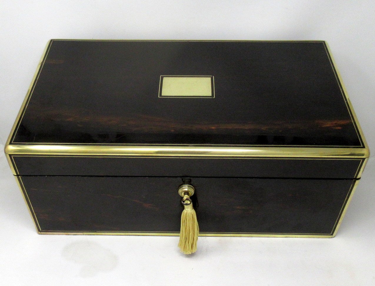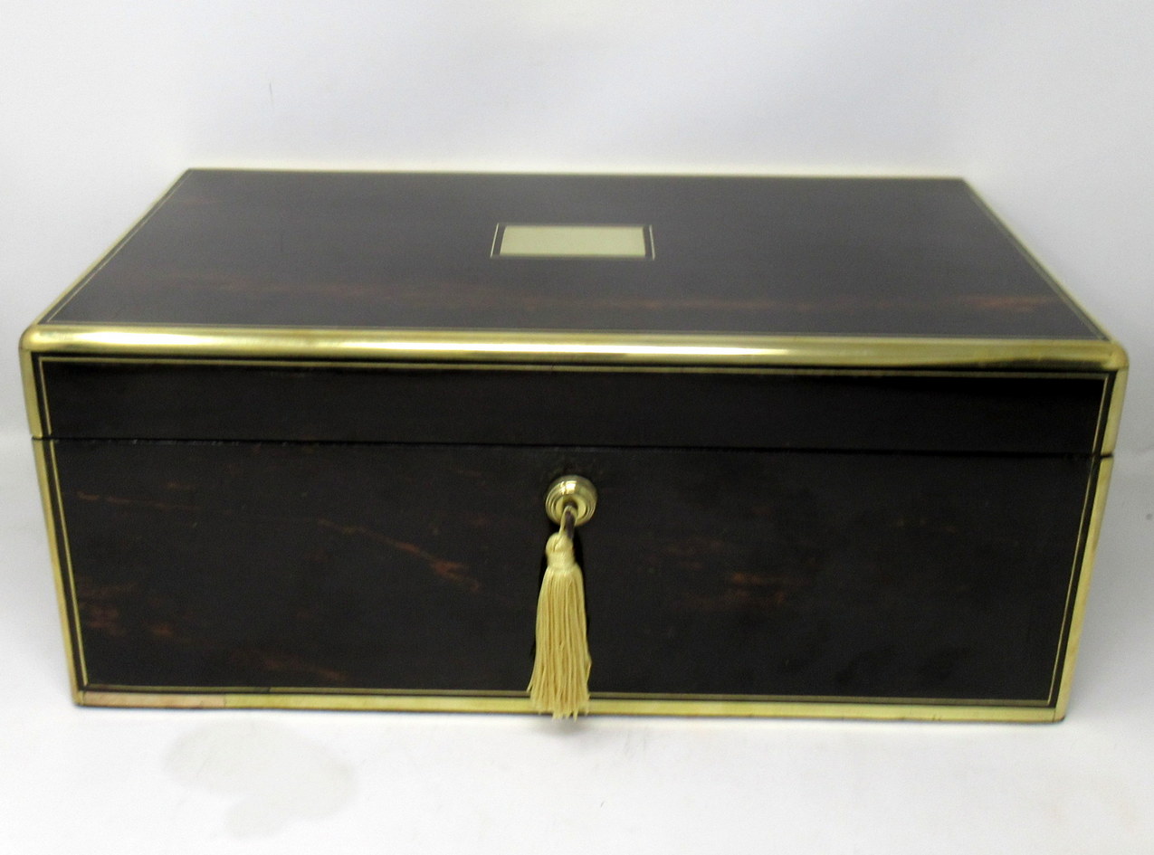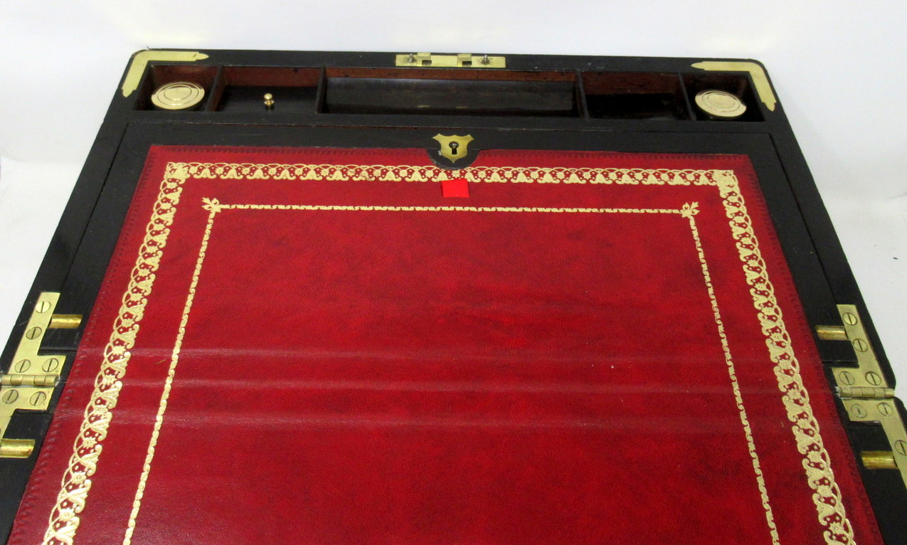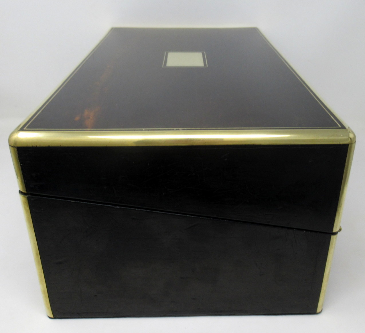 The hinged lid opening to reveal a fitted interior with a seldom seen polished brass feature surround to corners, a later rich red leather writing surface with actual gold leaf tooled decoration, one half of which can be locked using the second key, this is a rare and unusual feature, see image area, also features three secret drawers, see images. The rectangular flat top lid with central brass inlaid plaque, the top and side edges of the hinged lid with quadrant polished brass moldings, the main carcass with similar detailing.