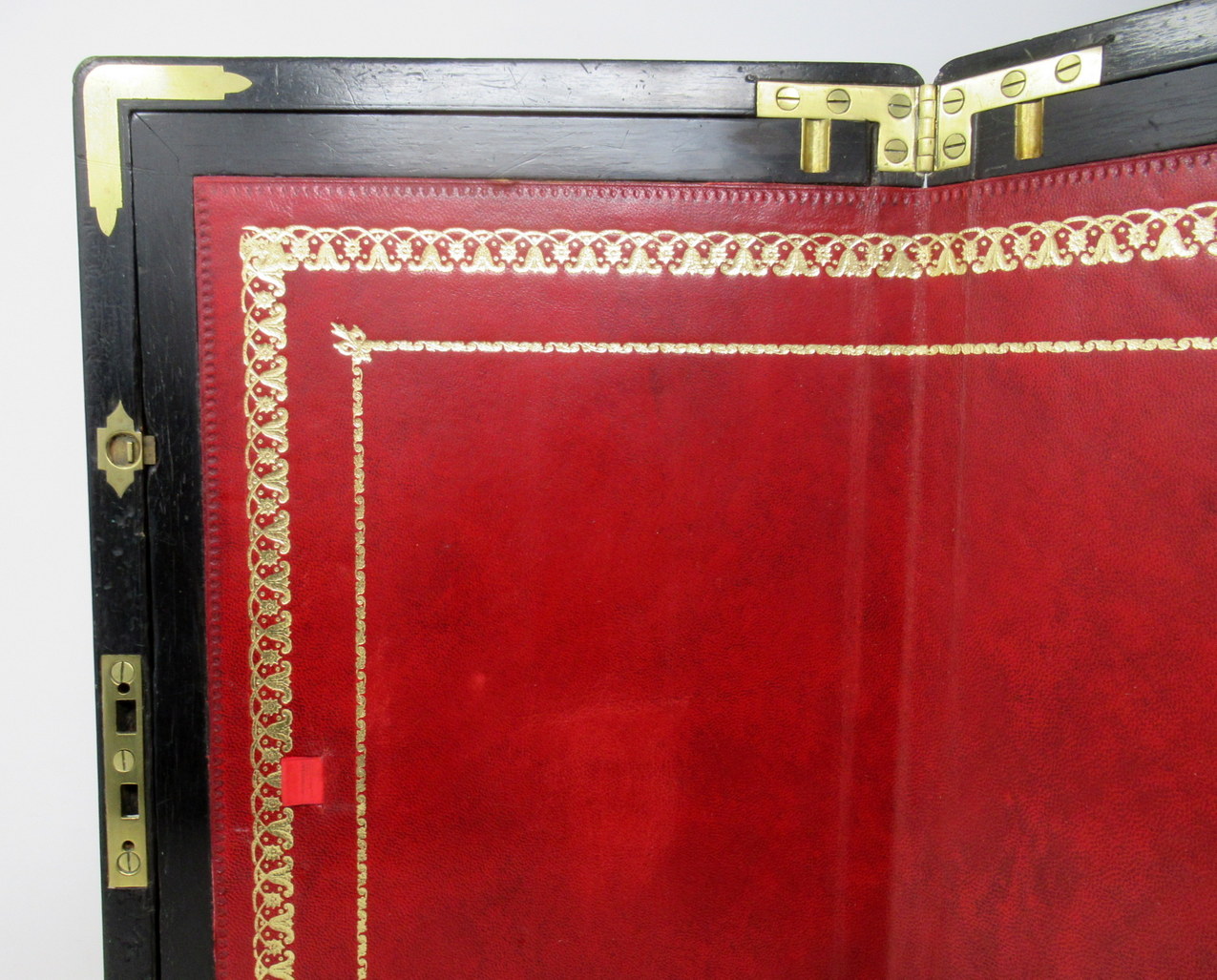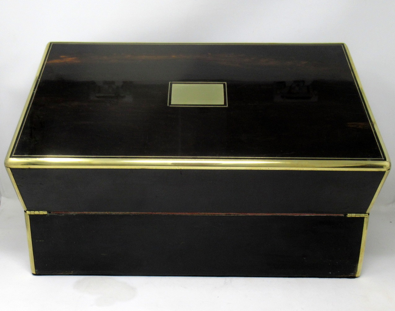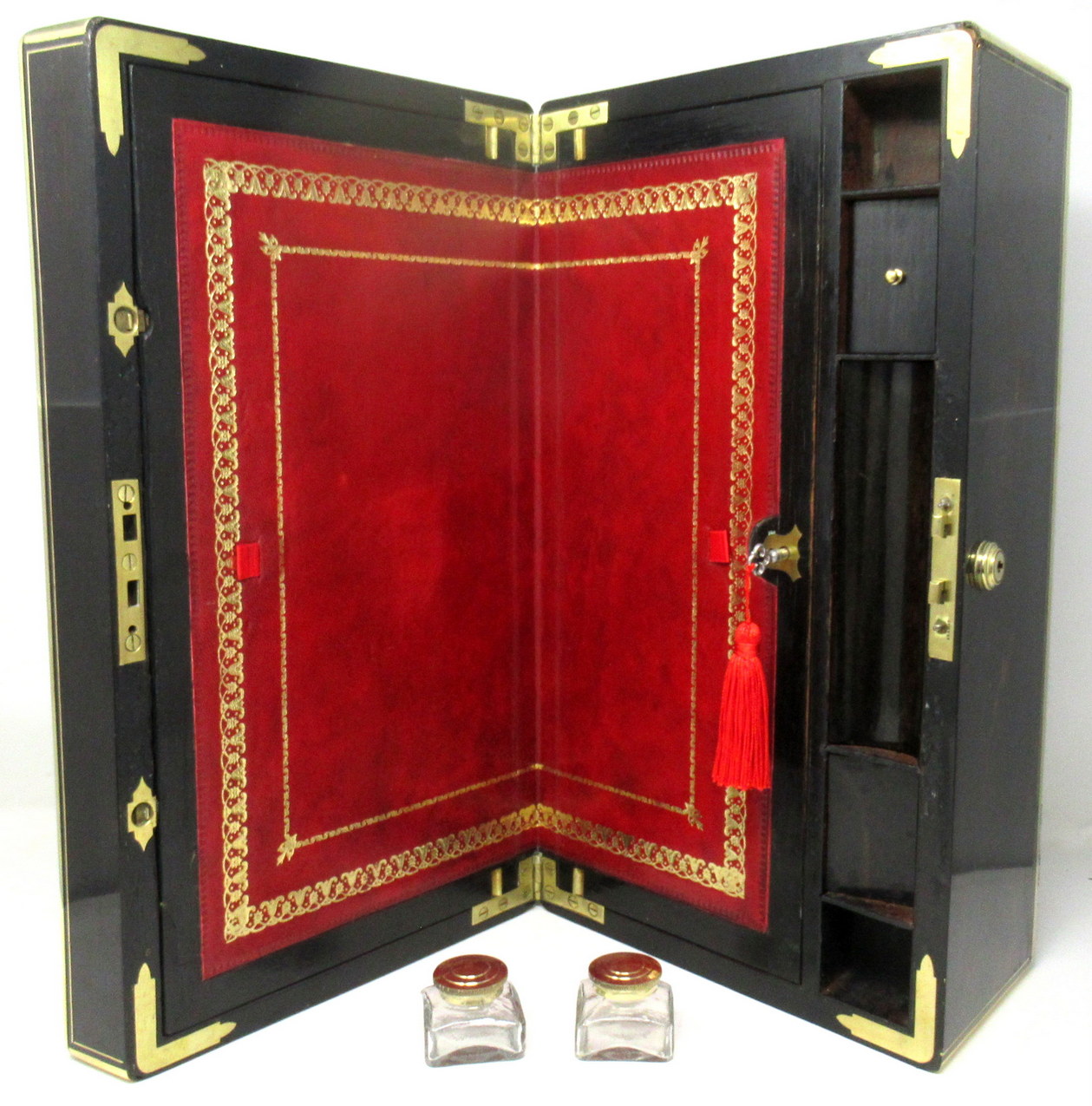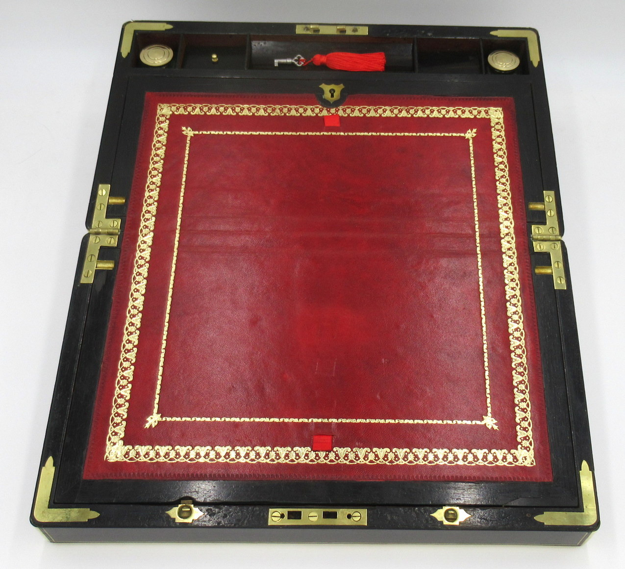 The hinged lid opening to reveal a fitted interior with a seldom seen polished brass feature surround to corners, a later rich red leather writing surface with actual gold leaf tooled decoration, one half of which can be locked using the second key, this is a rare and unusual feature, see image area, also features three secret drawers, see images. The rectangular flat top lid with central brass inlaid plaque, the top and side edges of the hinged lid with quadrant polished brass moldings, the main carcass with similar detailing.