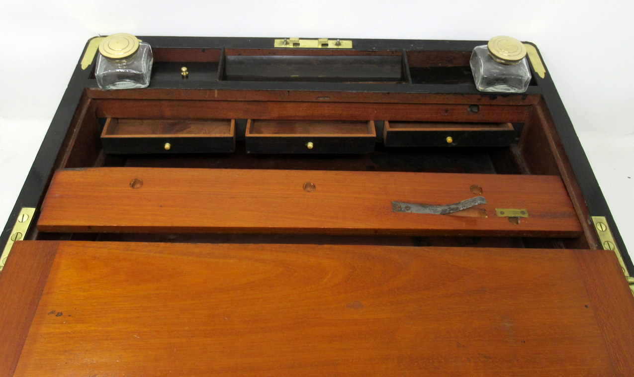 Condition: Professionally restored retaining its wonderful rich dark colour, with a replaced leather in writing area which is nicely done. Box closes firmly with no gaps. Lock and keys are present and are working, crystal ink bottles are of a later period, nice original firm hinges.