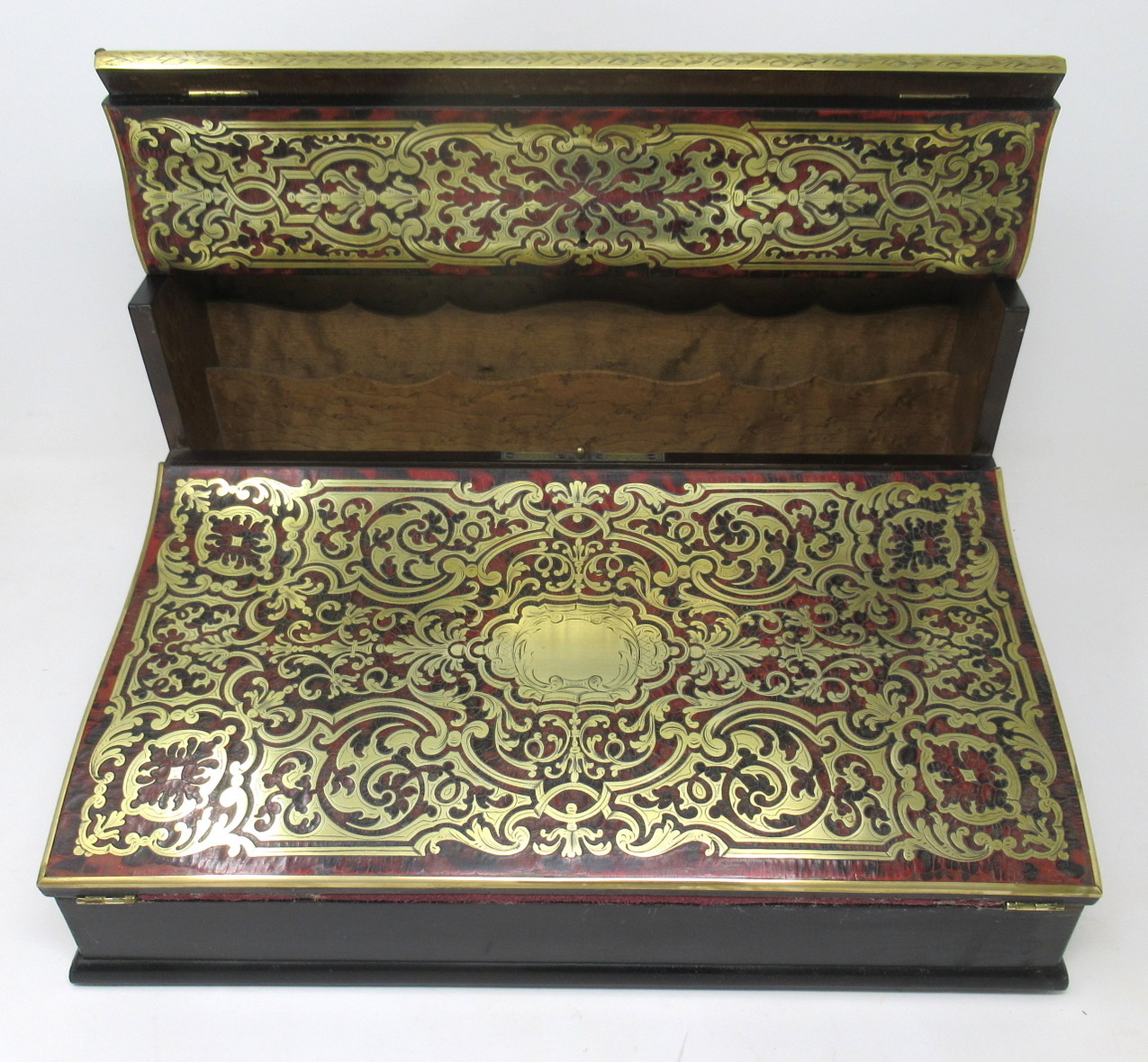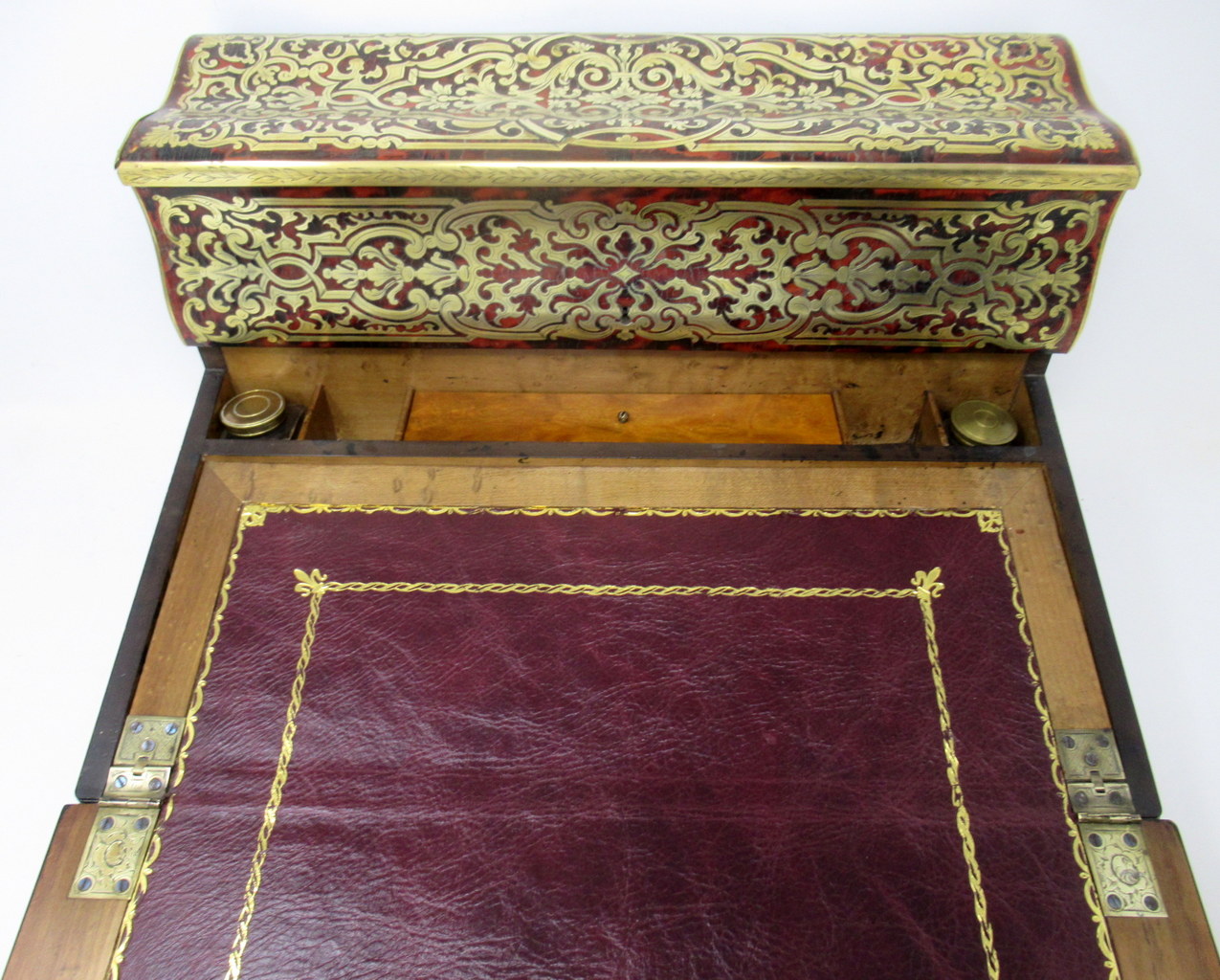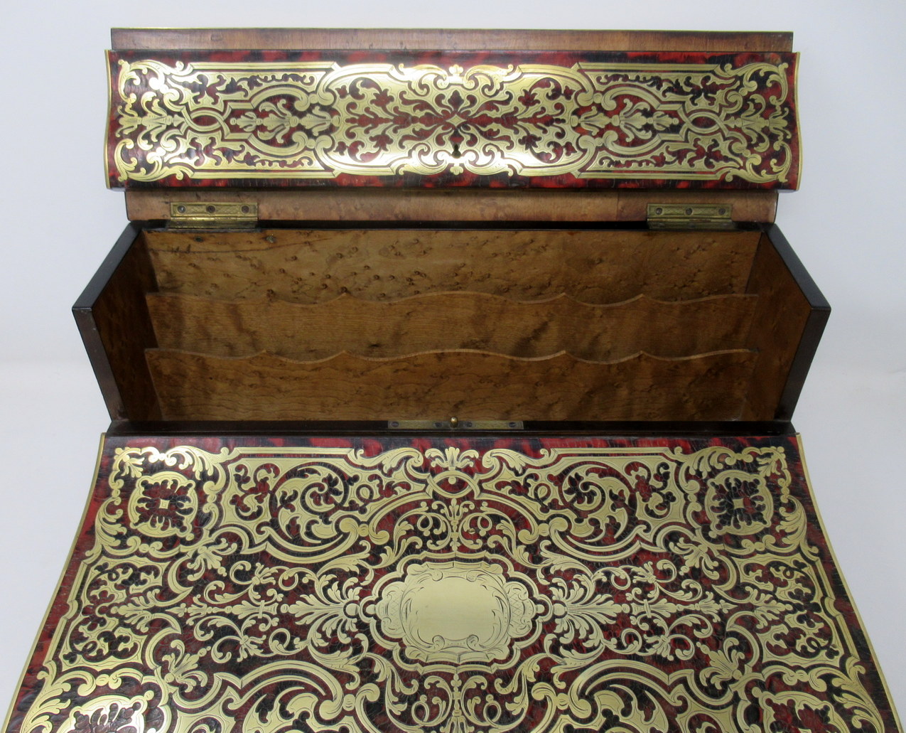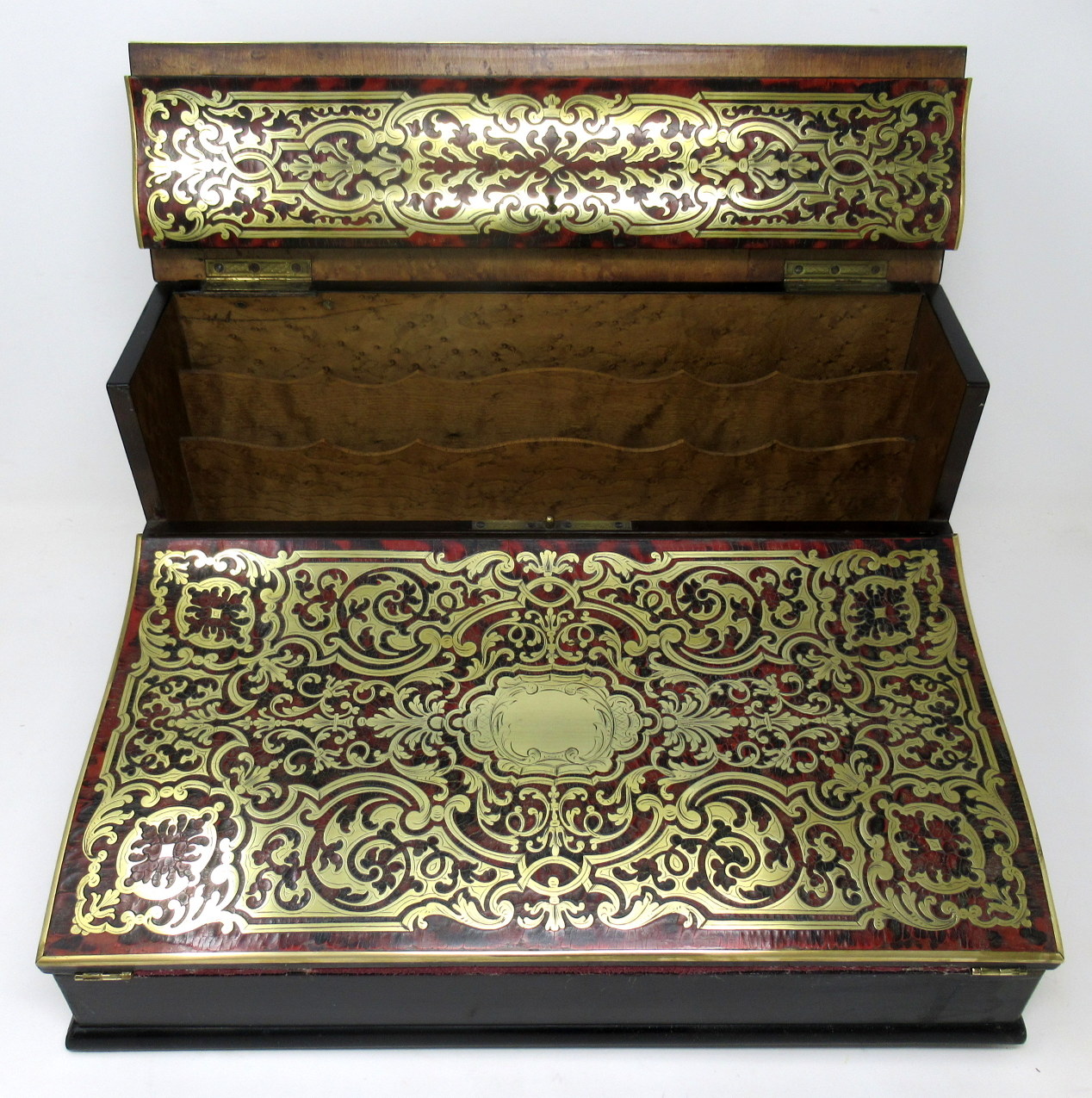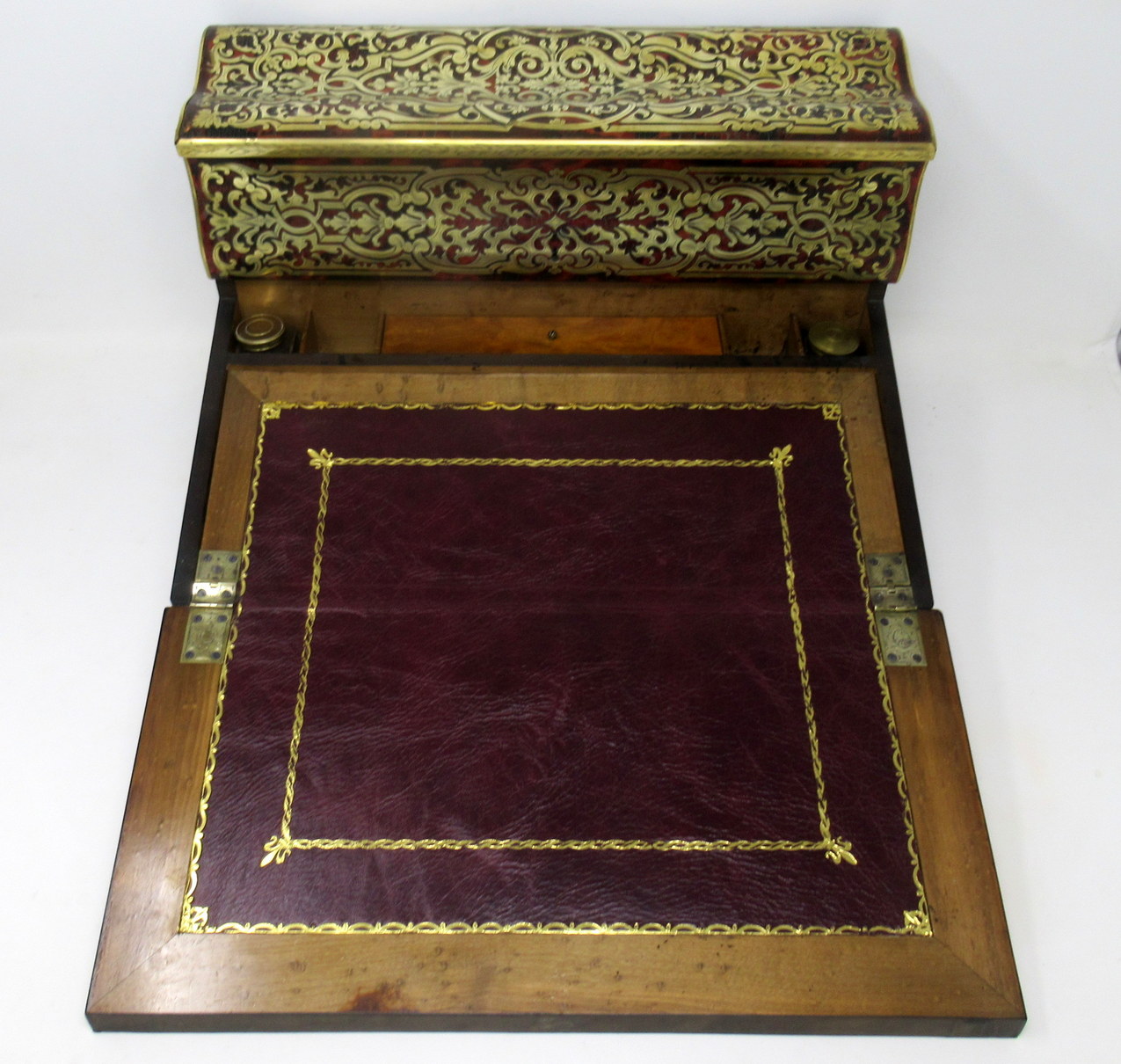 The entire top area decorated with premier and contra-partie inlaid scrolling arabesques depicting intricacy, opulence and masterful craftsmanship, opening to reveal a burr maple fitted interior, complete with original brass capped ink bottles. Central cartouche of lid vacant.