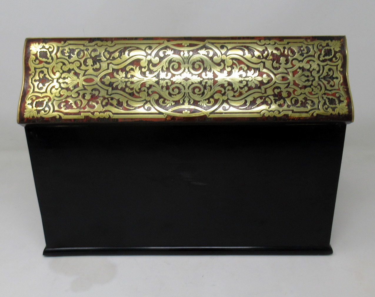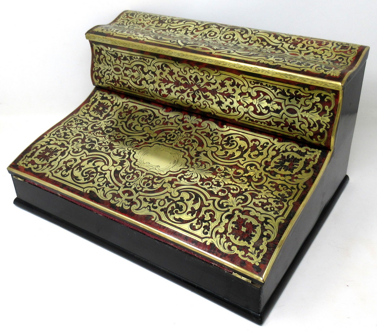 An Exceptionally Fine Quality Example of a Polished Brass, Ebony and Tortoiseshell Inlaid Boulle Style Travelling Writing Slope made during the first half of the Nineteenth Century, of French origin.