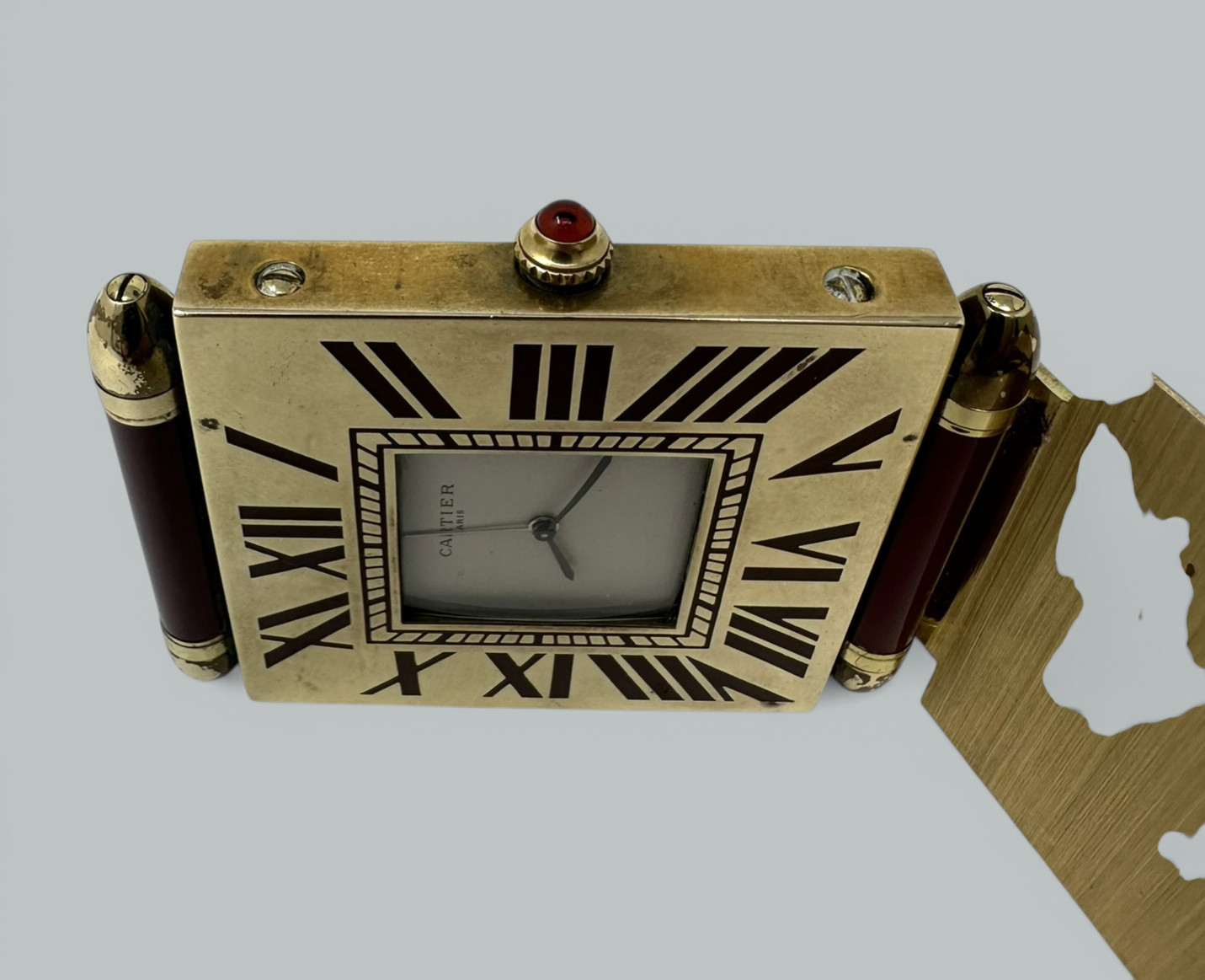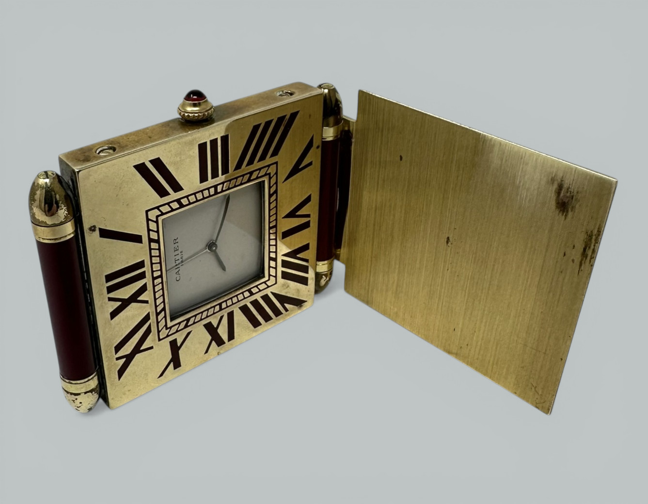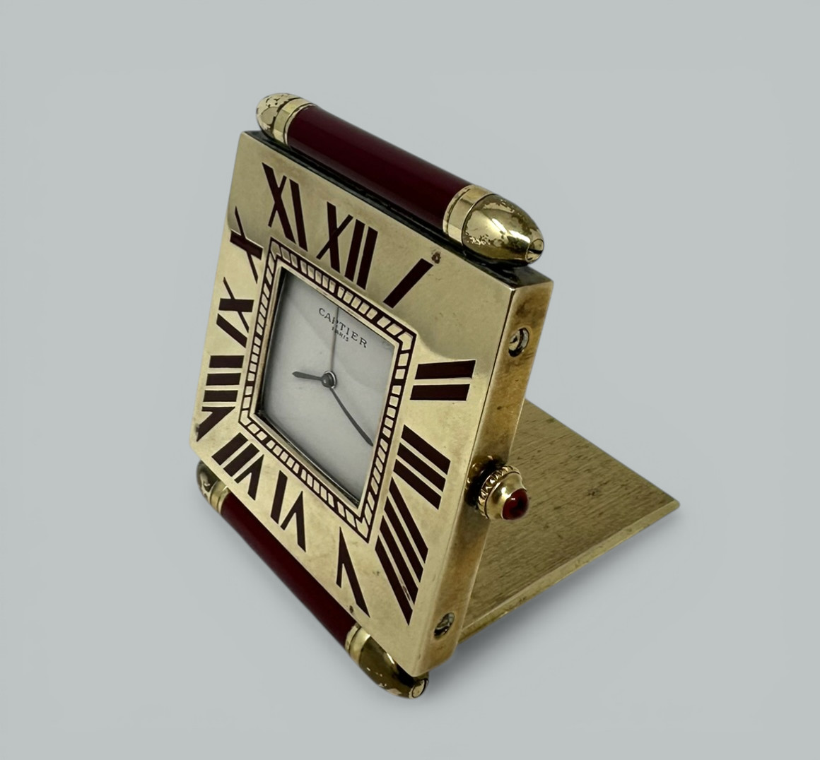The attractive white dial with Roman Numerals in burgundy dark red colored enamel on the outer bezel. Displays on its flip-over hinged base stand. Classical same color cabochon for adjusting time and alarm. The spear shaped hands are possibly gold.