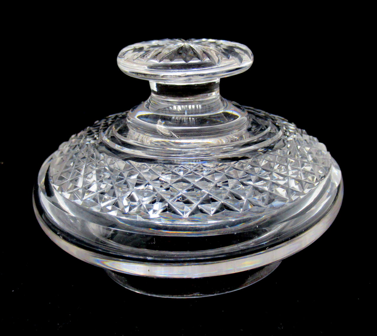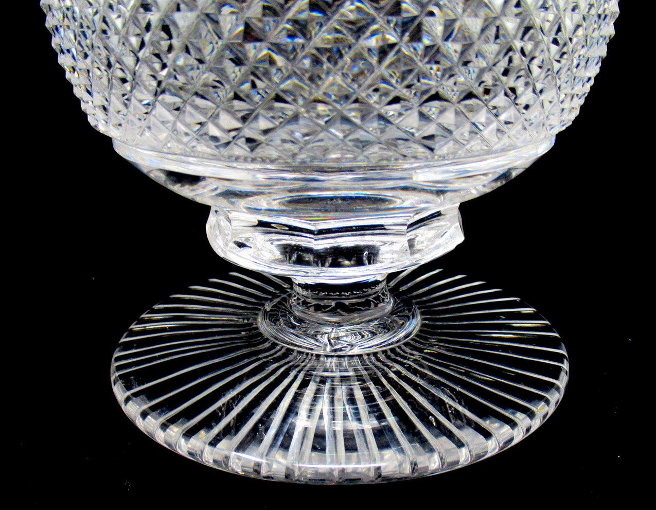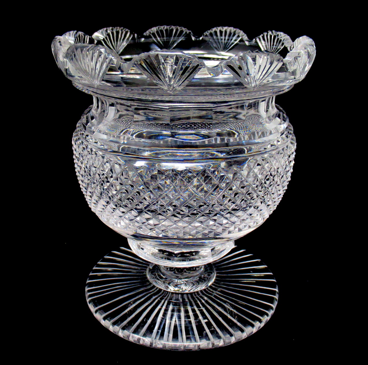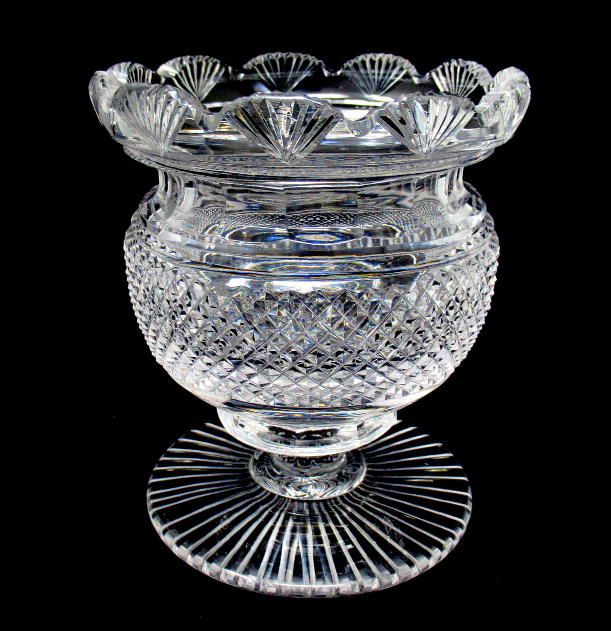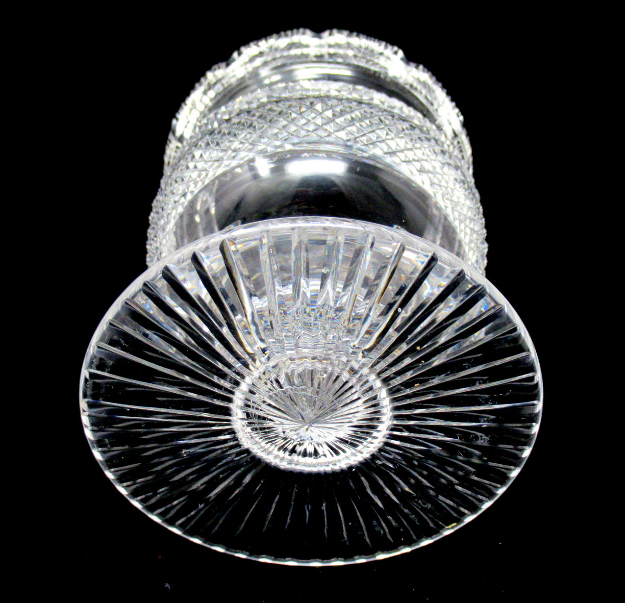 The unusual fan-cut decorative rim above an all-round panel of deep cut diamond pattern all-round body ending on a lower circular base with star cut pattern underneath. Made in Ireland in either Waterford or Belfast. This piece is unmarked, early pieces were not usually.