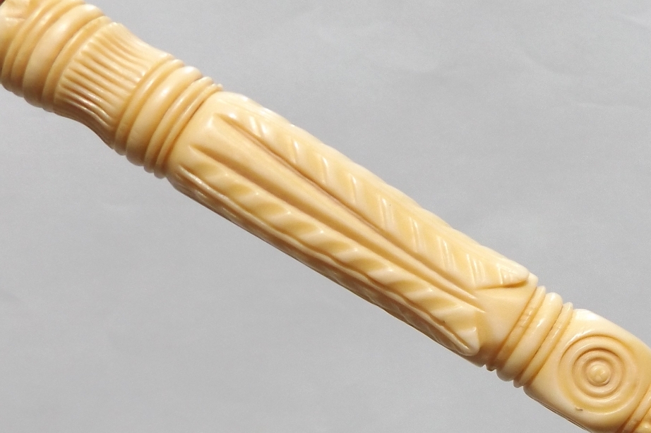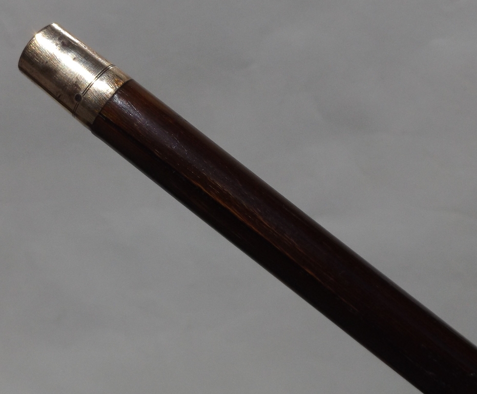 Stunning Malacca Ladies or Gentleman’s Walking Cane with an unusual and exquisite hand carved Ivory Long Grip, and a white metal collar, original bi-metal ferrule.