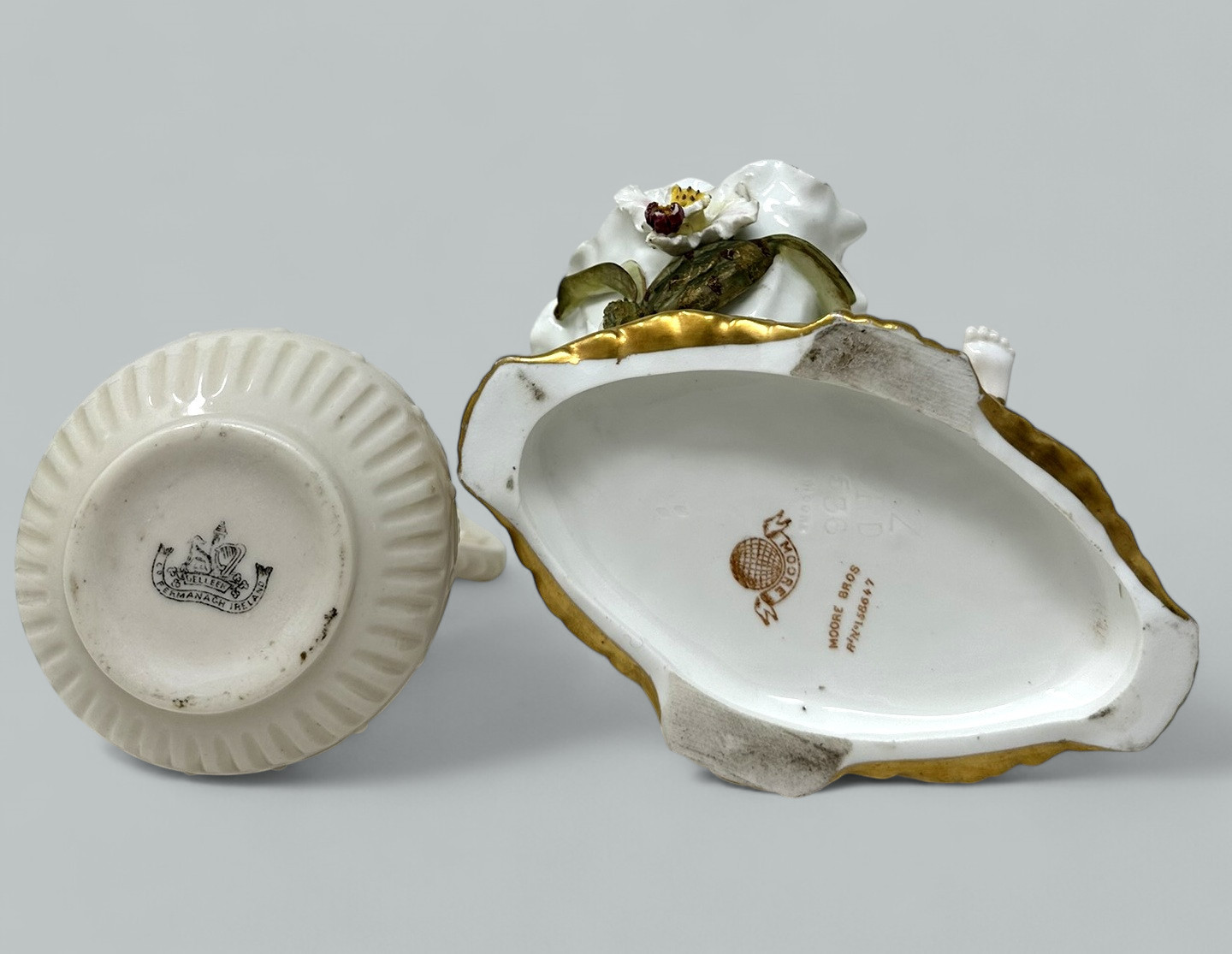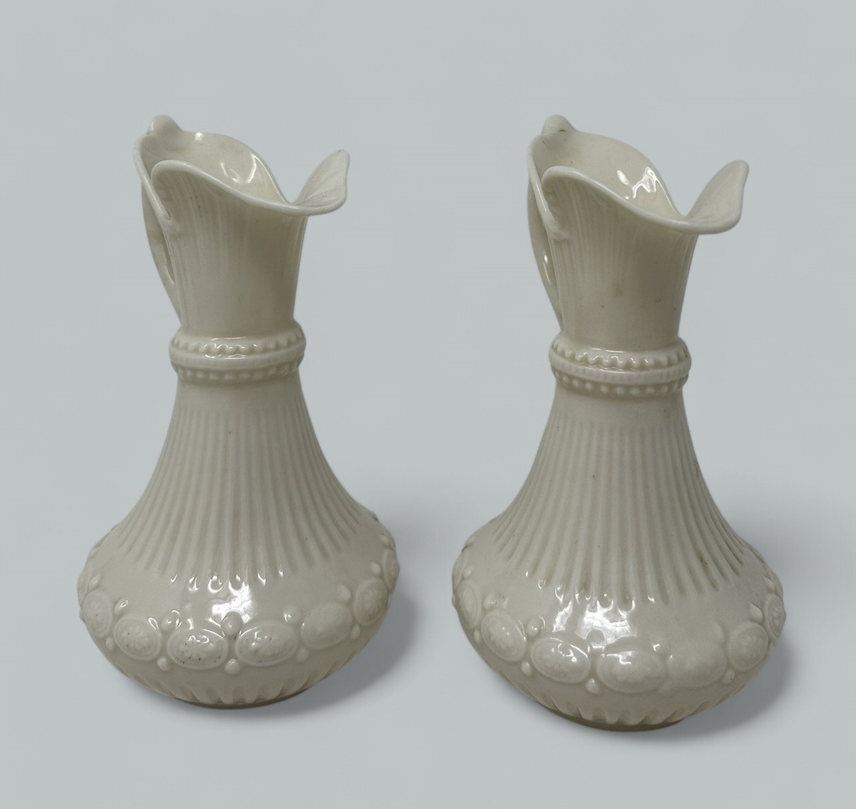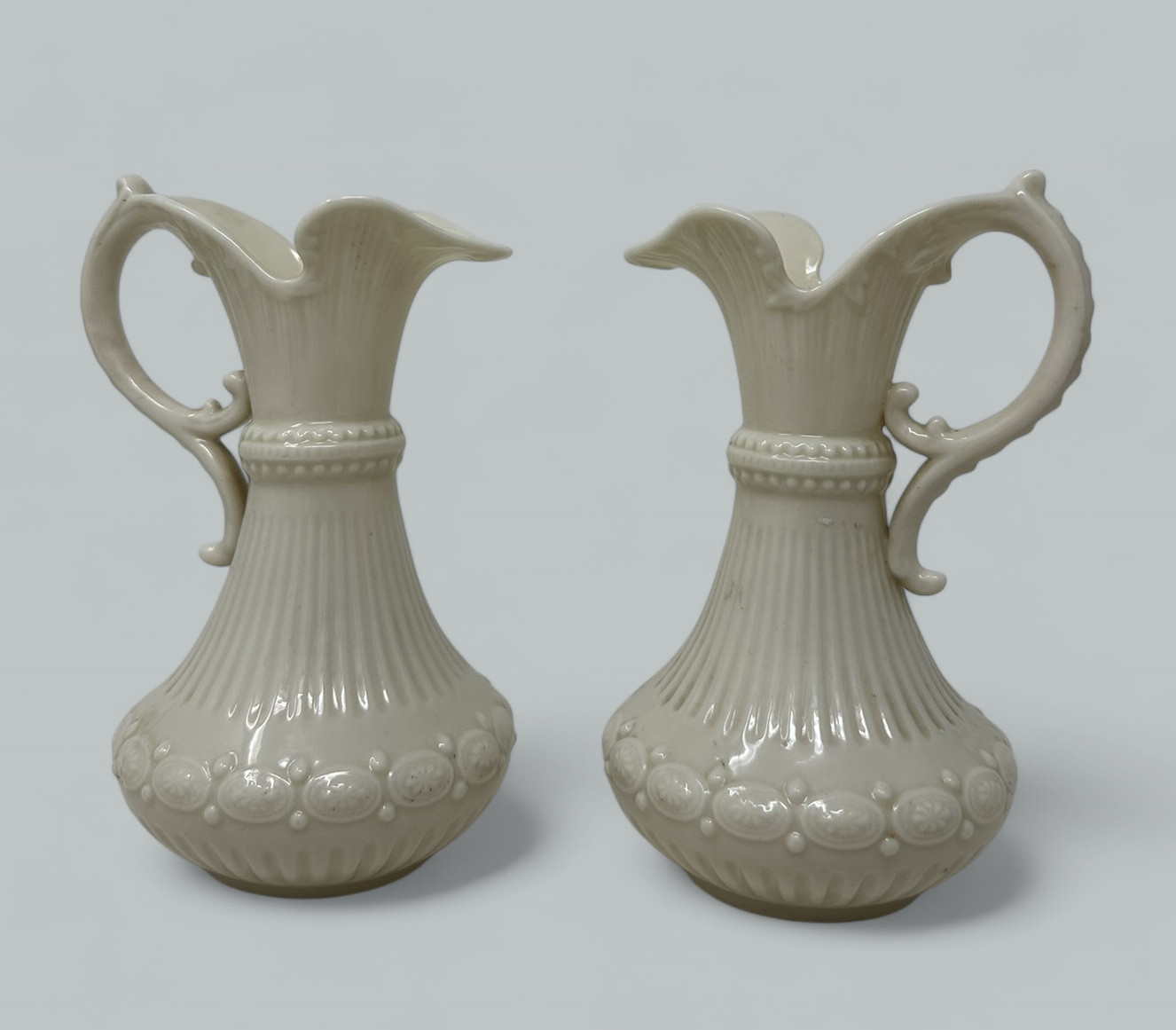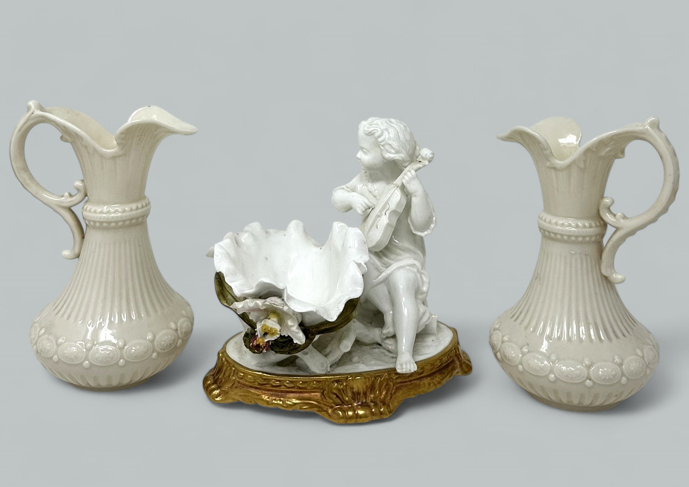 Stunning assembled Collection of three wonderful Decorative Porcelain Items comprising of a Pair of Irish Belleek Aberdeen Ewers or Pitchers and an exquisite English Moore’s Brothers Porcelain Blanc de Chene Centerpiece depicting a Cherub playing a musical instrument.