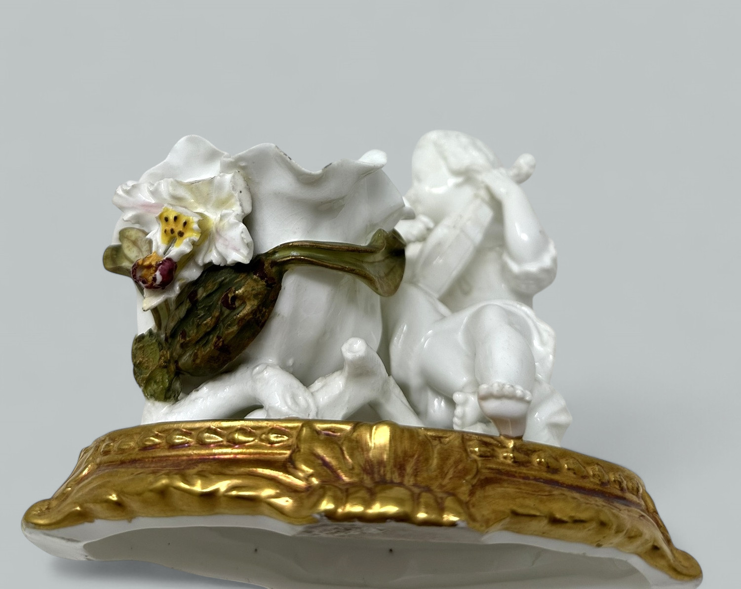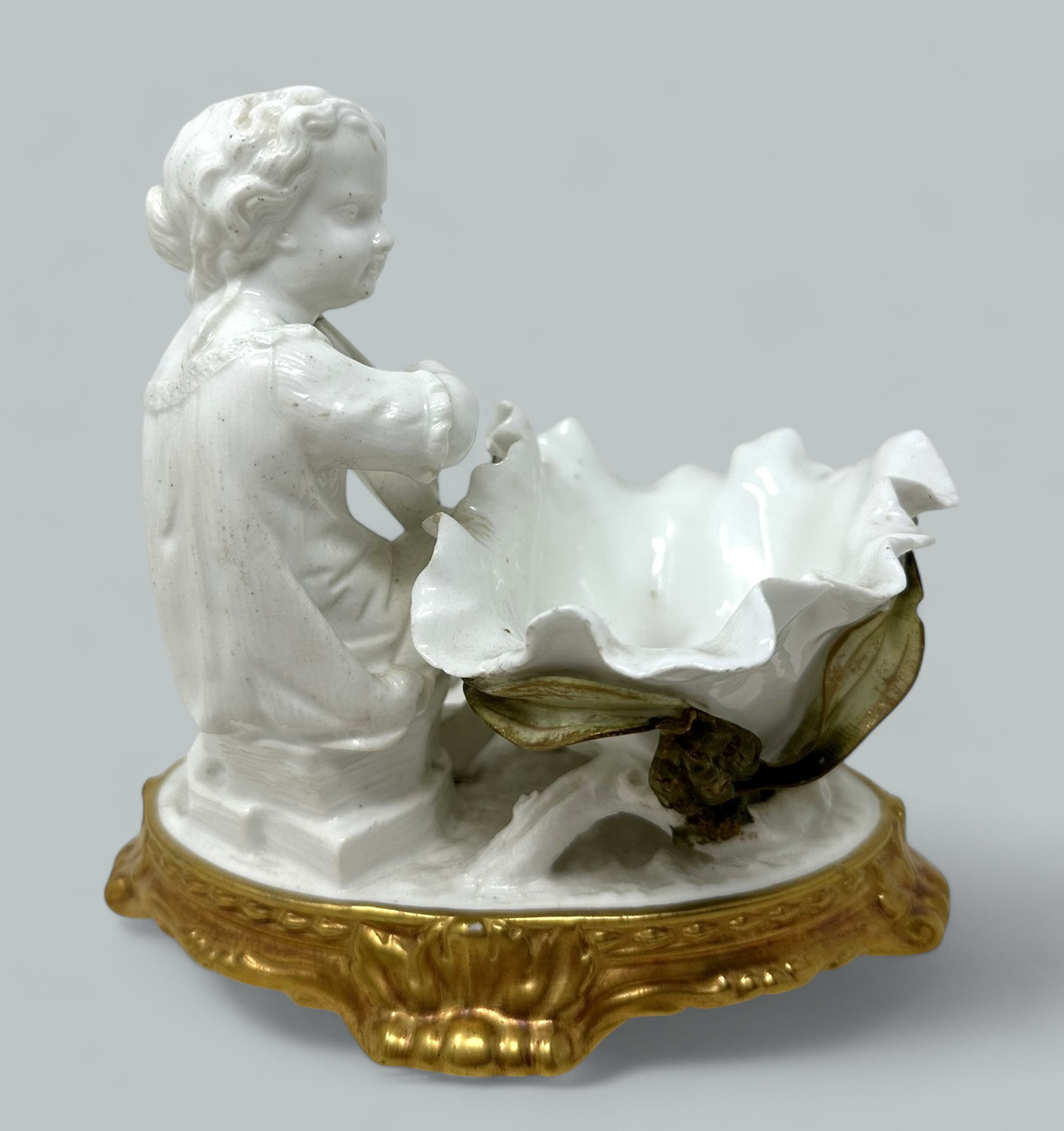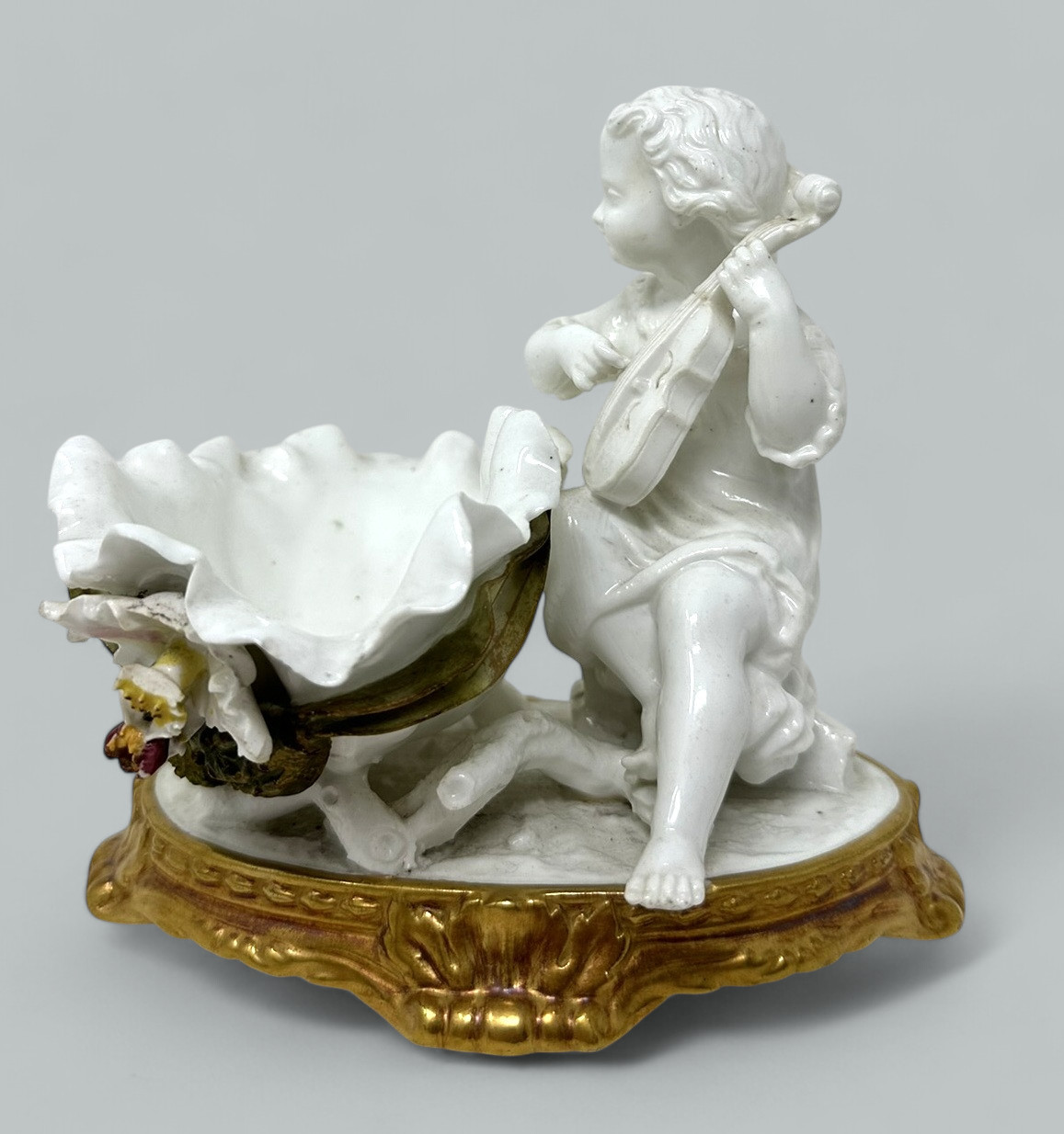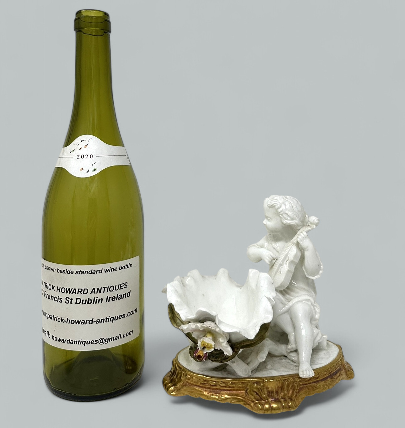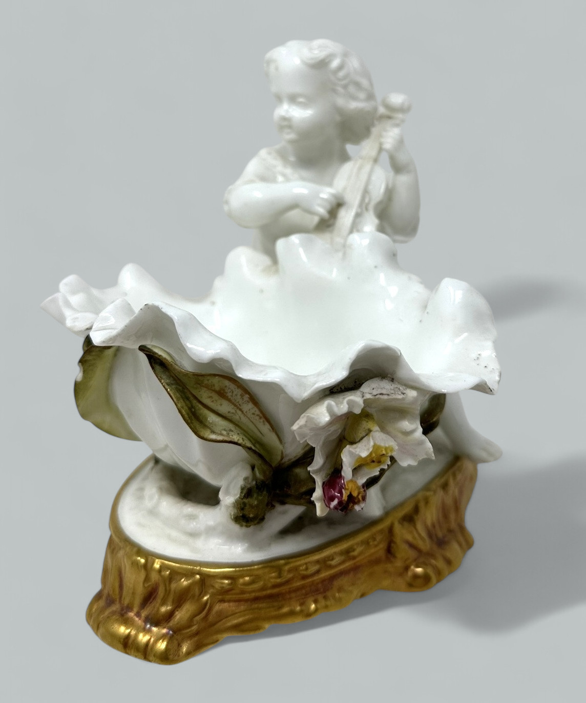 Stunning assembled Collection of three wonderful Decorative Porcelain Items comprising of a Pair of Irish Belleek Aberdeen Ewers or Pitchers and an exquisite English Moore’s Brothers Porcelain Blanc de Chene Centerpiece depicting a Cherub playing a musical instrument.