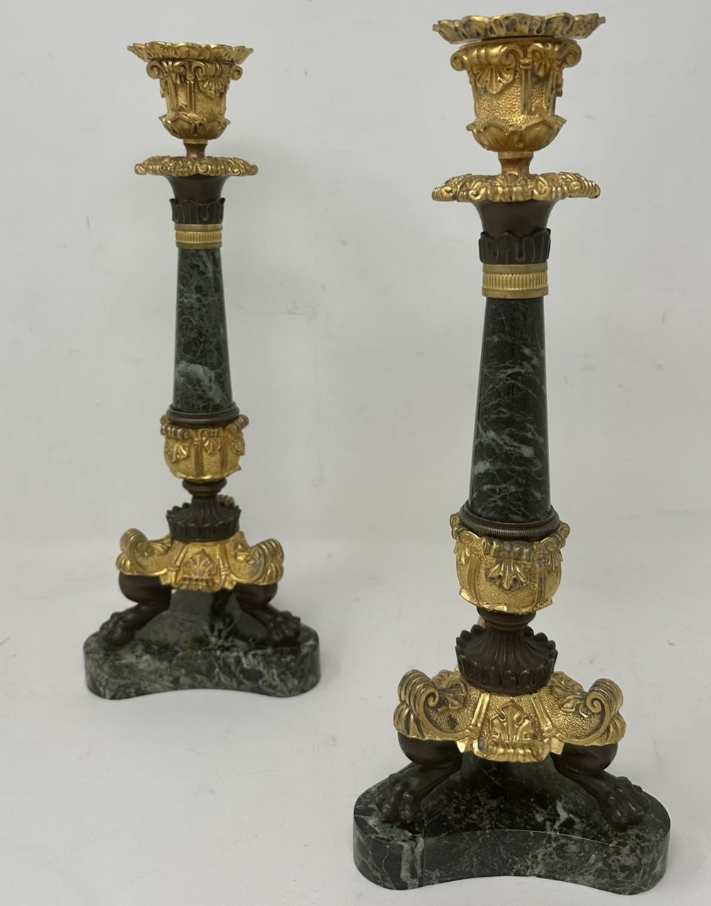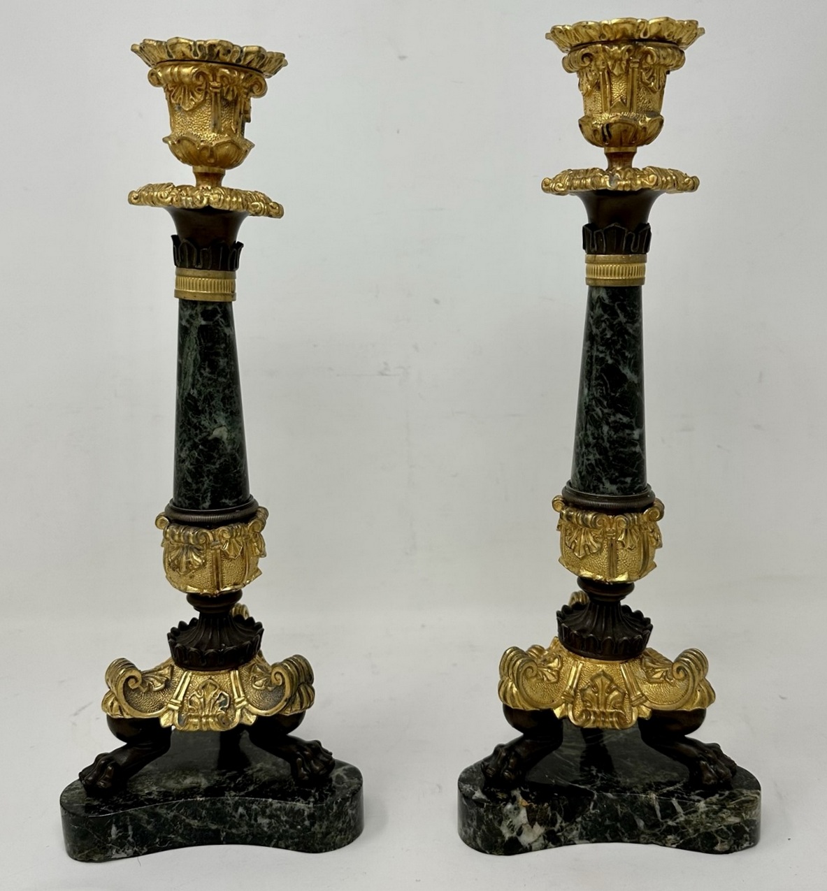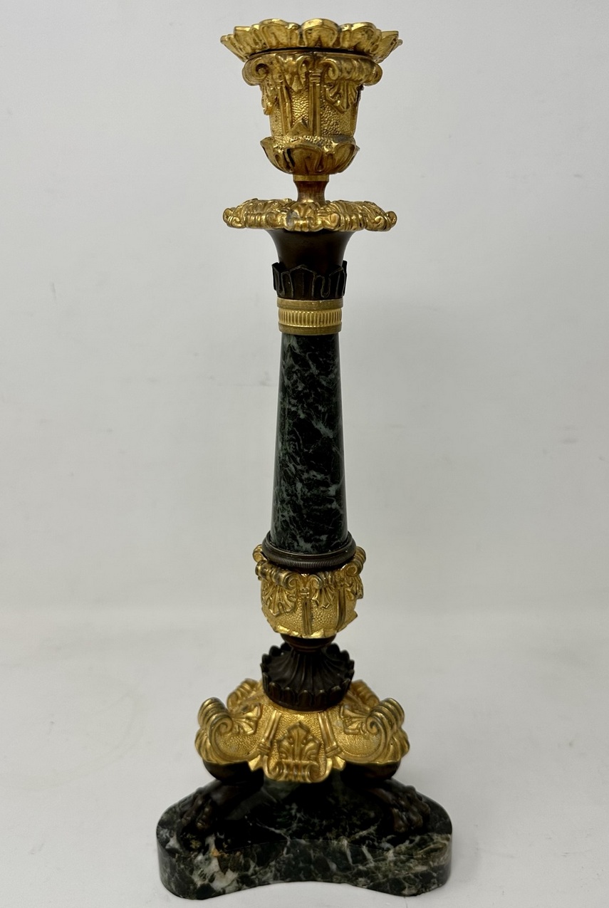 An Exceptionally Fine Pair French Bronze, Ormolu and French Verde Antico Marble Early Victorian Single Light Candlesticks of tall slender proportions, offered in exceptional condition, each with central tapering circular marble columns above a chisel cast Acanthus leaf support, ending with three monopodia supports with claw cast feet, on tri-form concave marble plain base, complete with original decorative firm fitting drip pans. Third quarter of the Nineteenth Century.