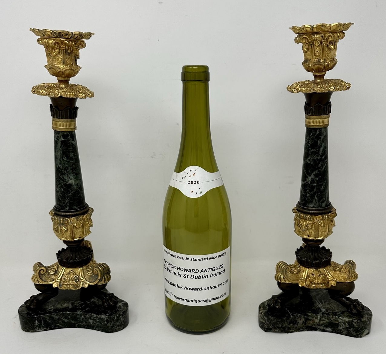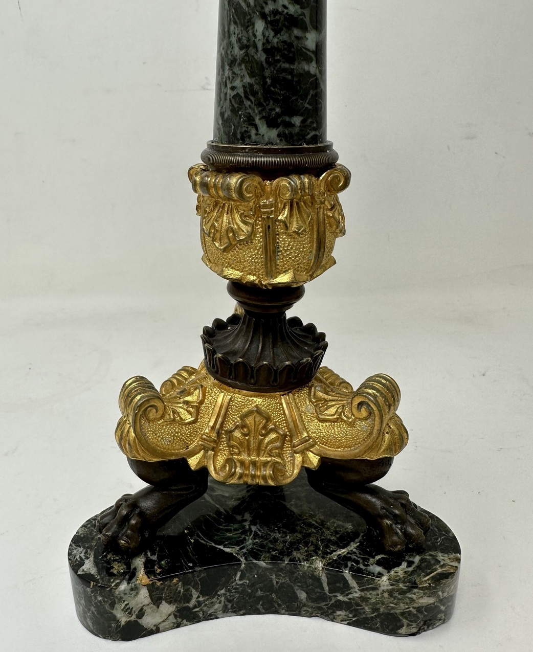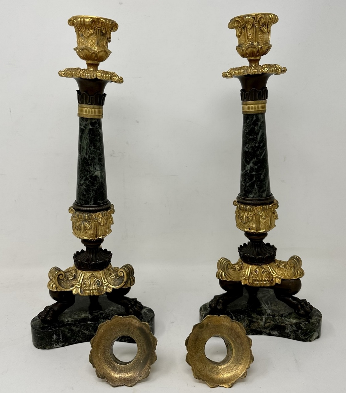 An Exceptionally Fine Pair French Bronze, Ormolu and French Verde Antico Marble Early Victorian Single Light Candlesticks of tall slender proportions, offered in exceptional condition, each with central tapering circular marble columns above a chisel cast Acanthus leaf support, ending with three monopodia supports with claw cast feet, on tri-form concave marble plain base, complete with original decorative firm fitting drip pans. Third quarter of the Nineteenth Century.