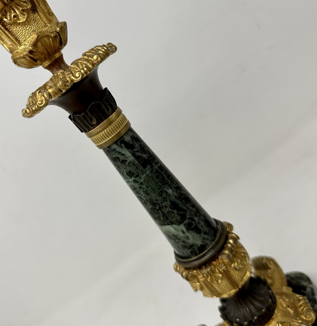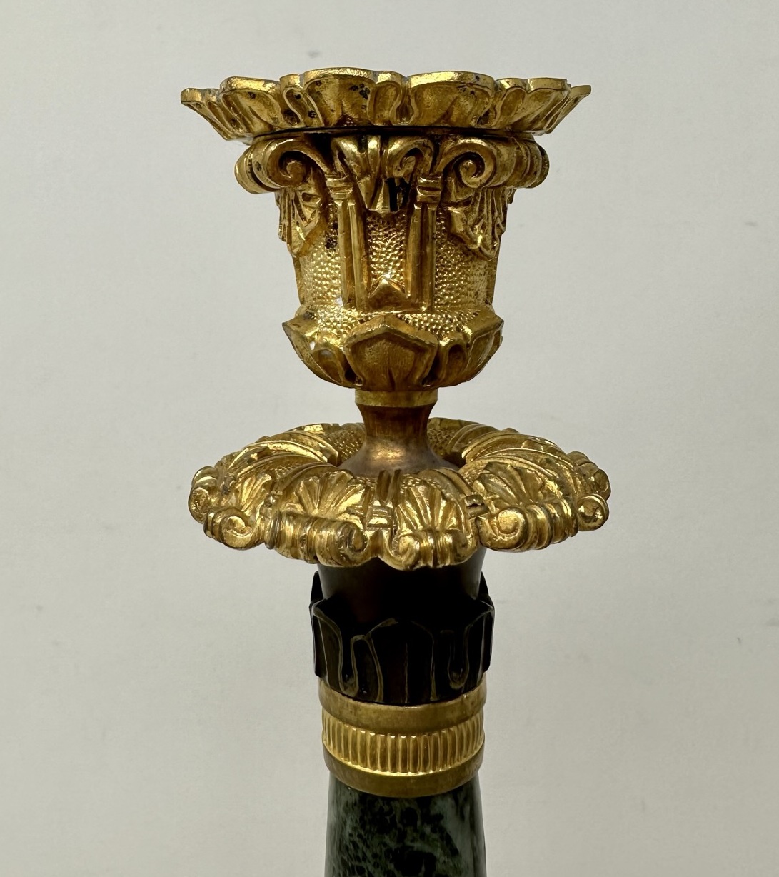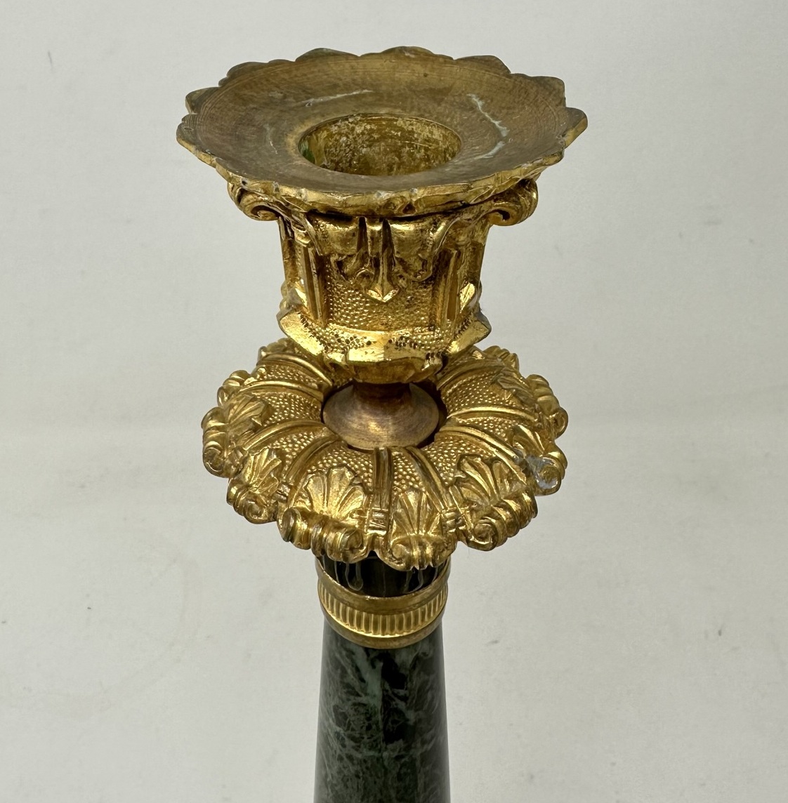 Beautiful Pair of Ormolu and French Green Marble Candlesticks, this marble is sometimes confused with the very familiar Connemara Marble from Ireland which is quite similar in appearance.