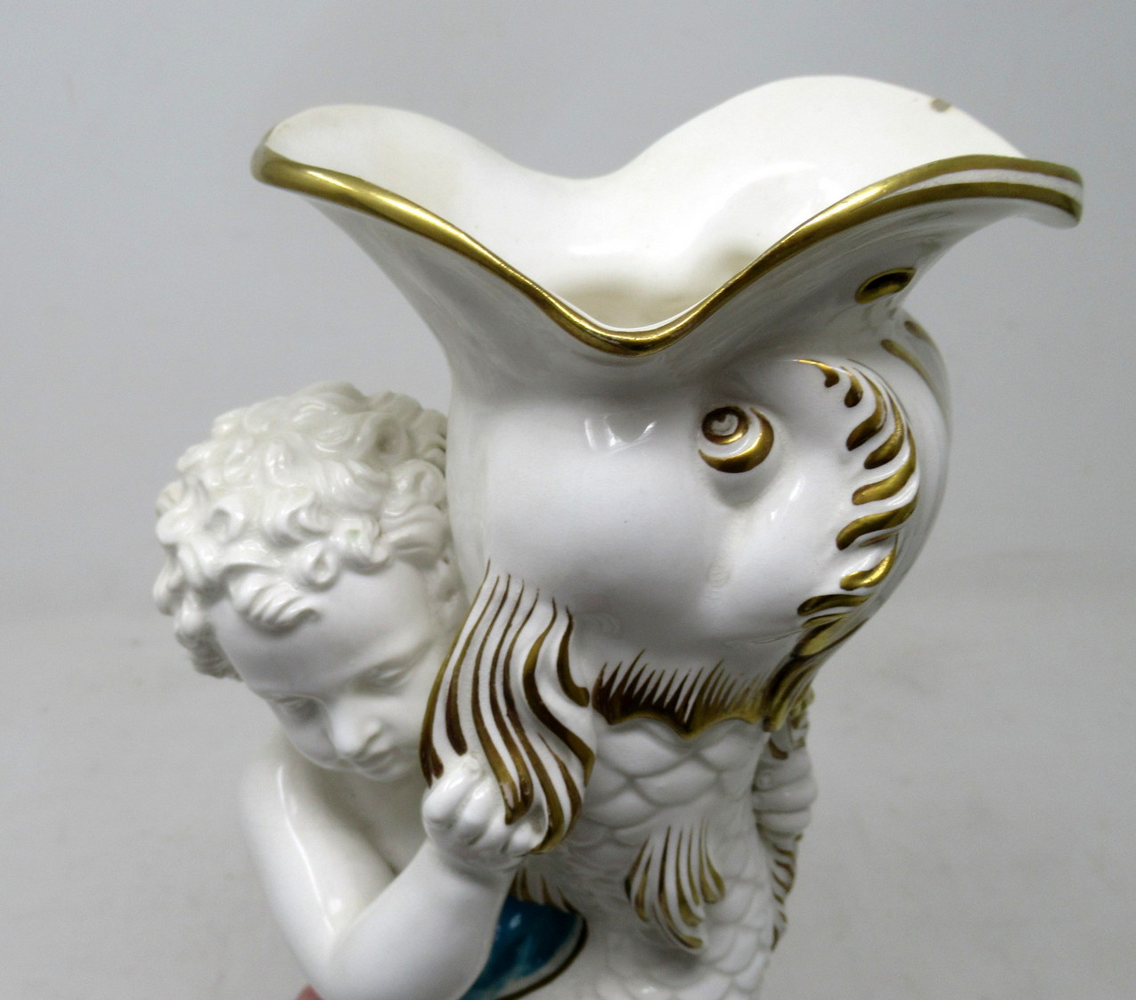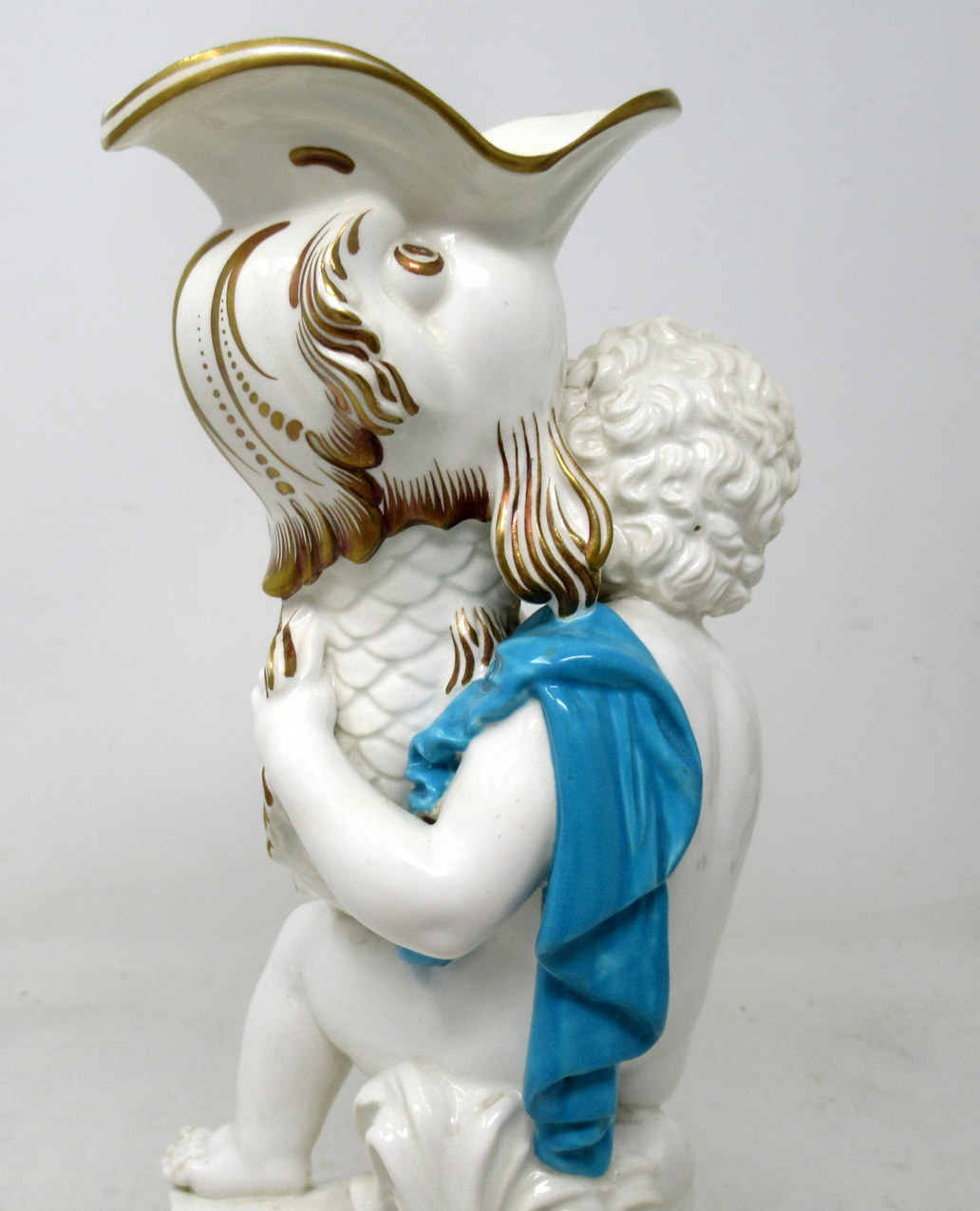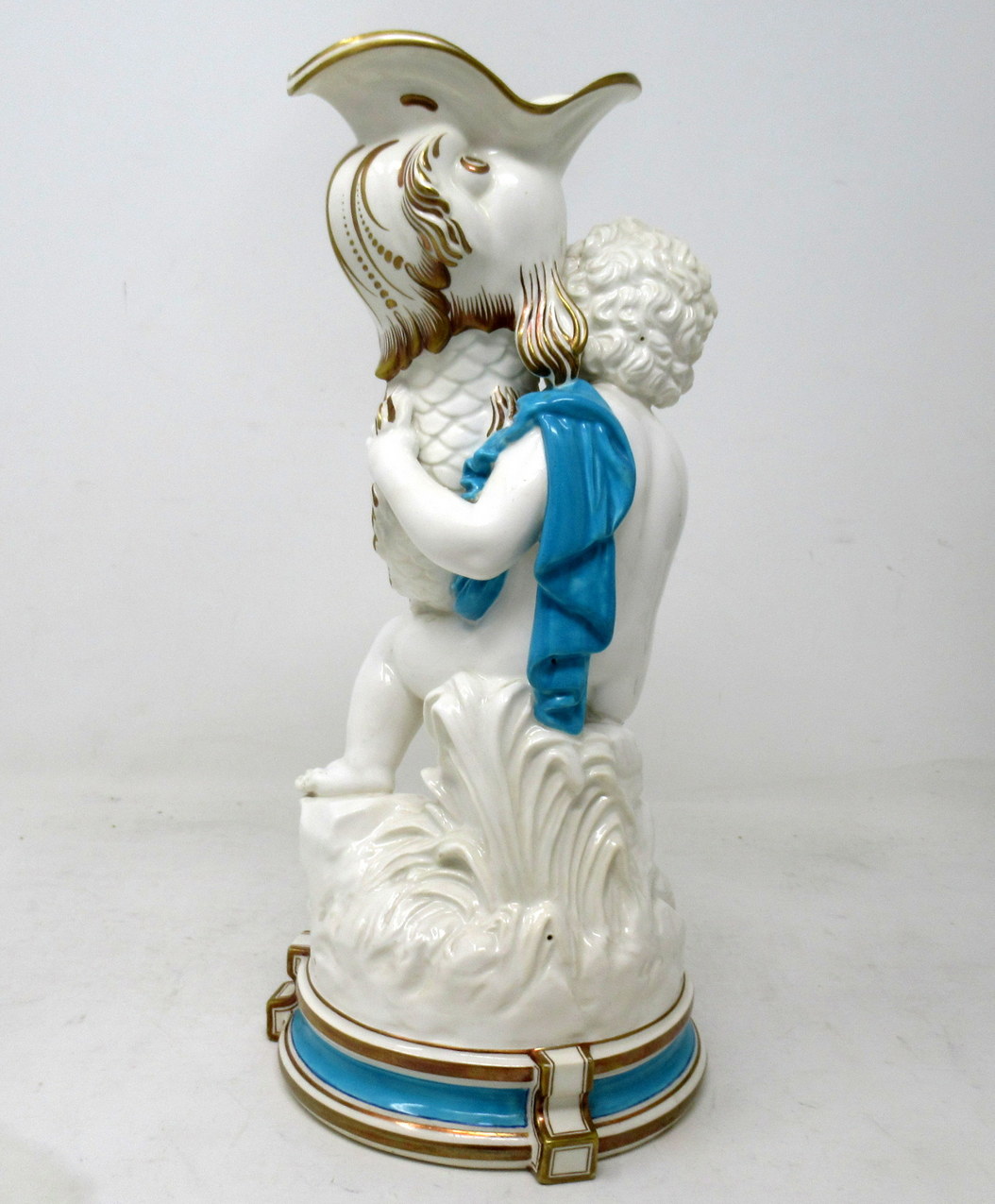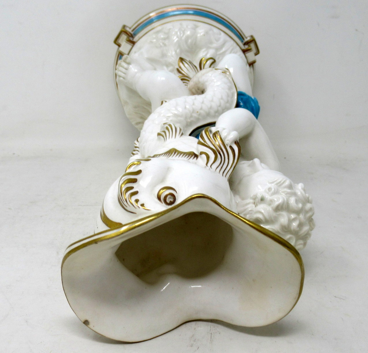 Stunning Example of an English Minton Porcelain Centerpiece or Flower Vase, depicting an entwined upright Dolphin been help by a scantily clad Female standing on a naturalistic circular base. Circa third quarter of the Nineteenth Century.