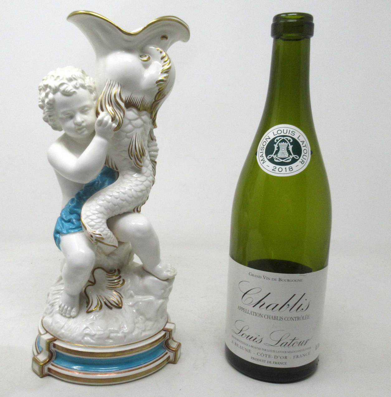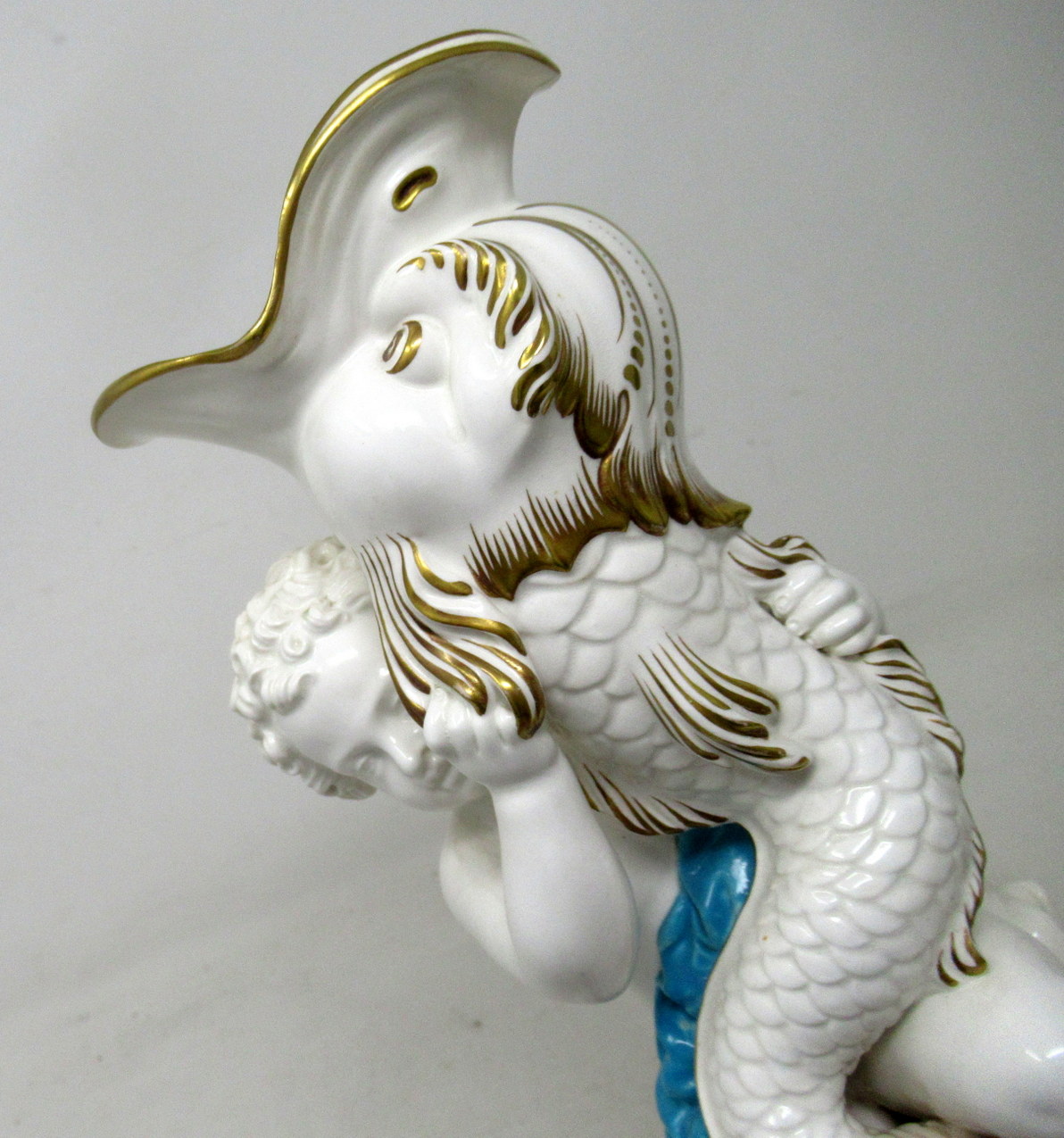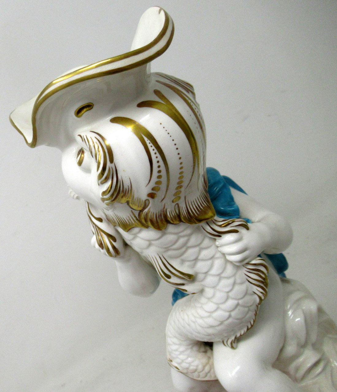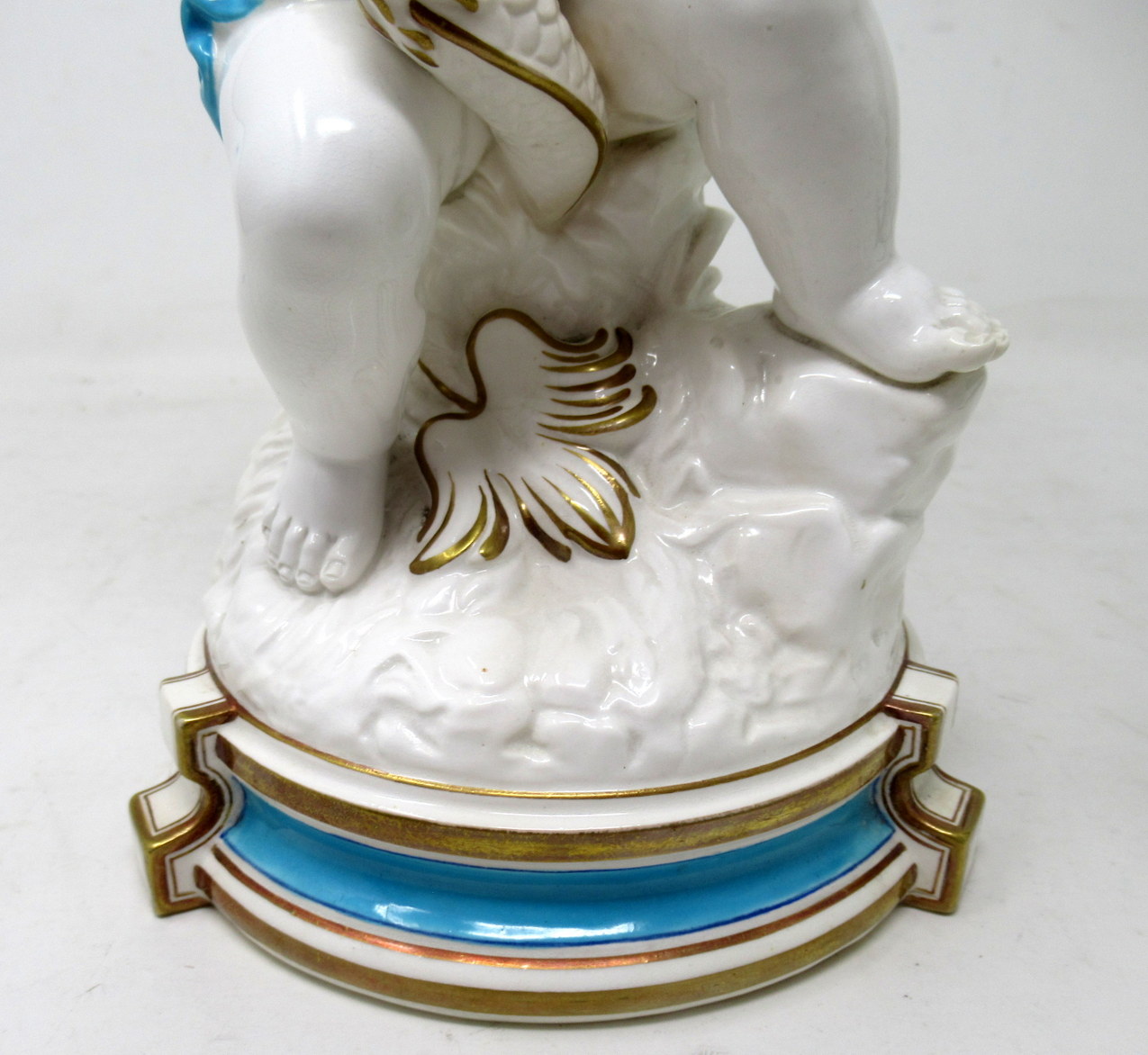 Stunning Example of an English Minton Porcelain Centerpiece or Flower Vase, depicting an entwined upright Dolphin been help by a scantily clad Female standing on a naturalistic circular base. Circa third quarter of the Nineteenth Century.
