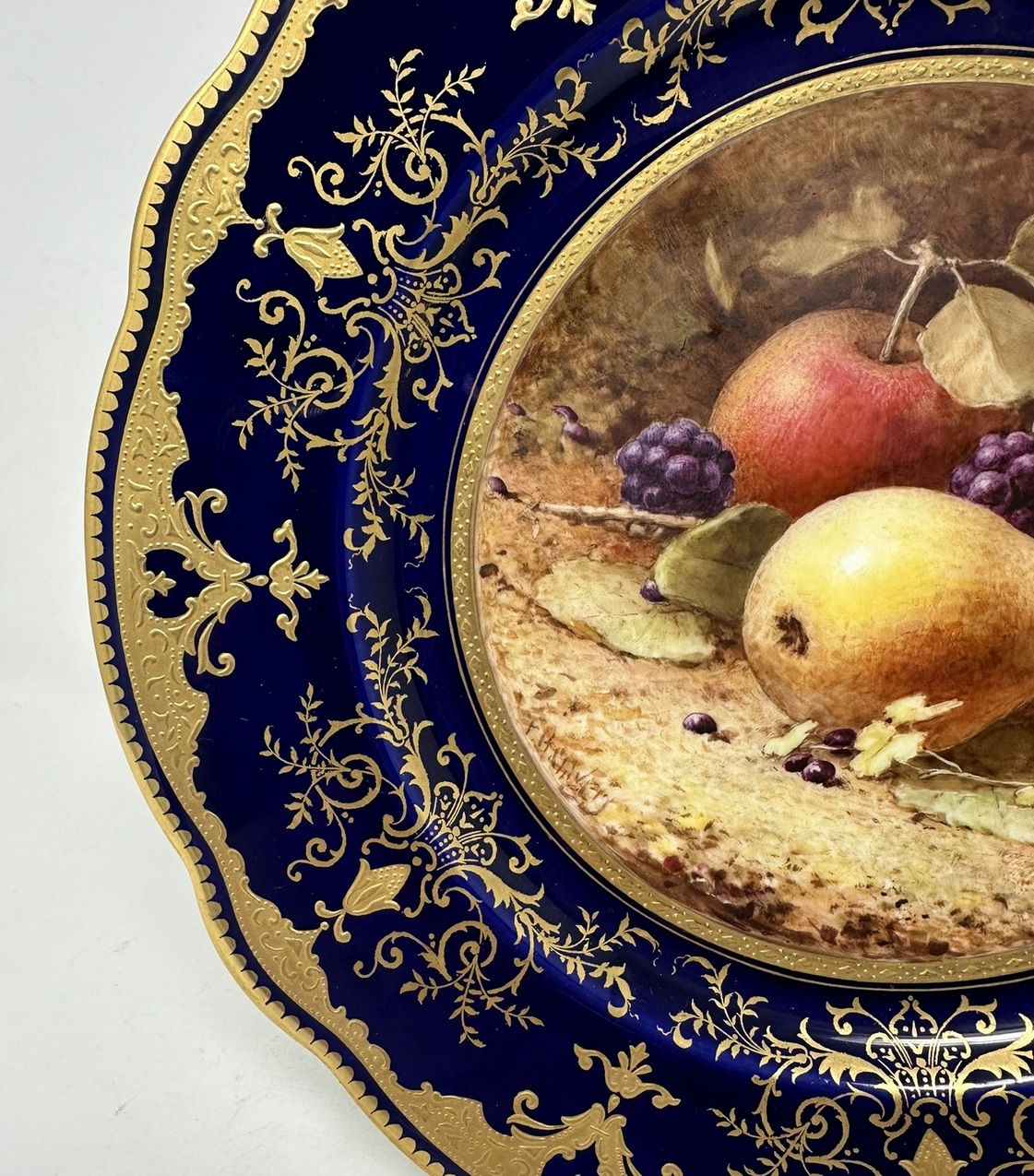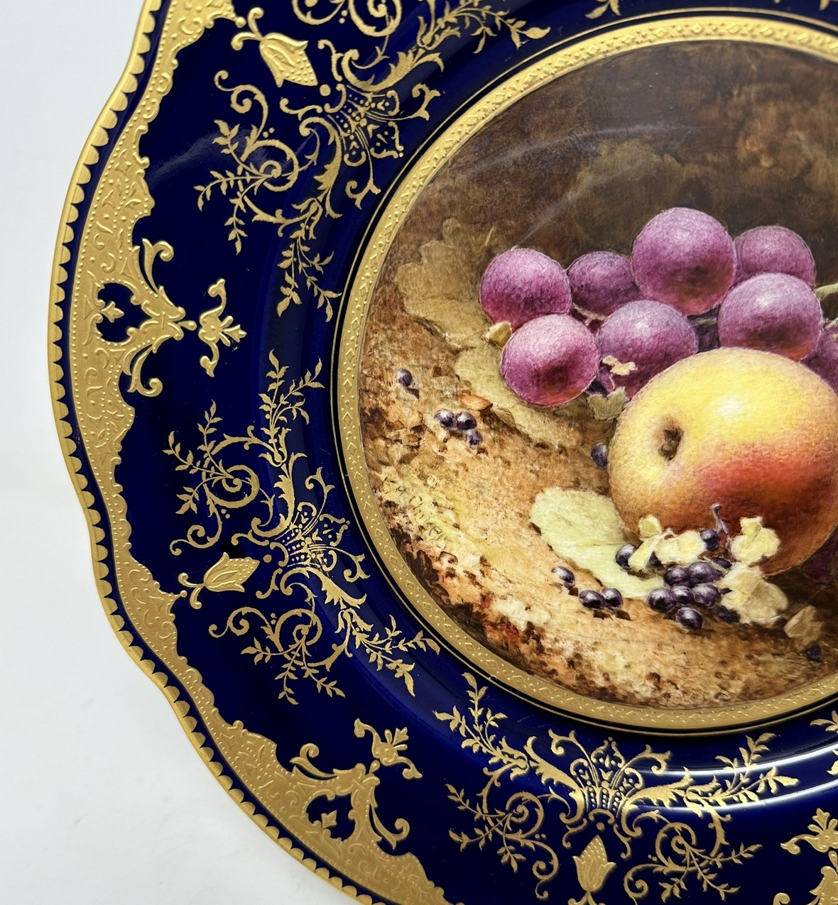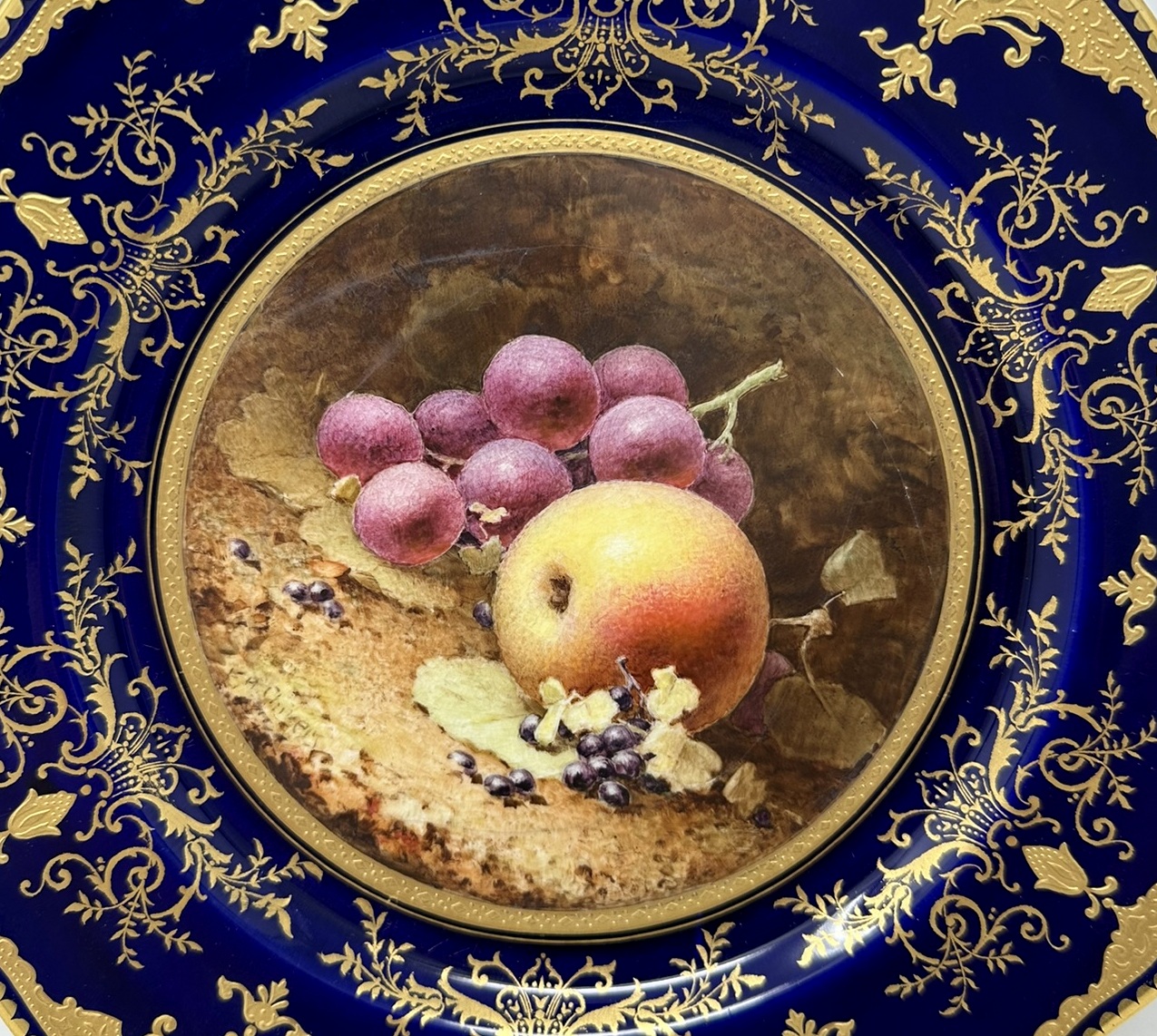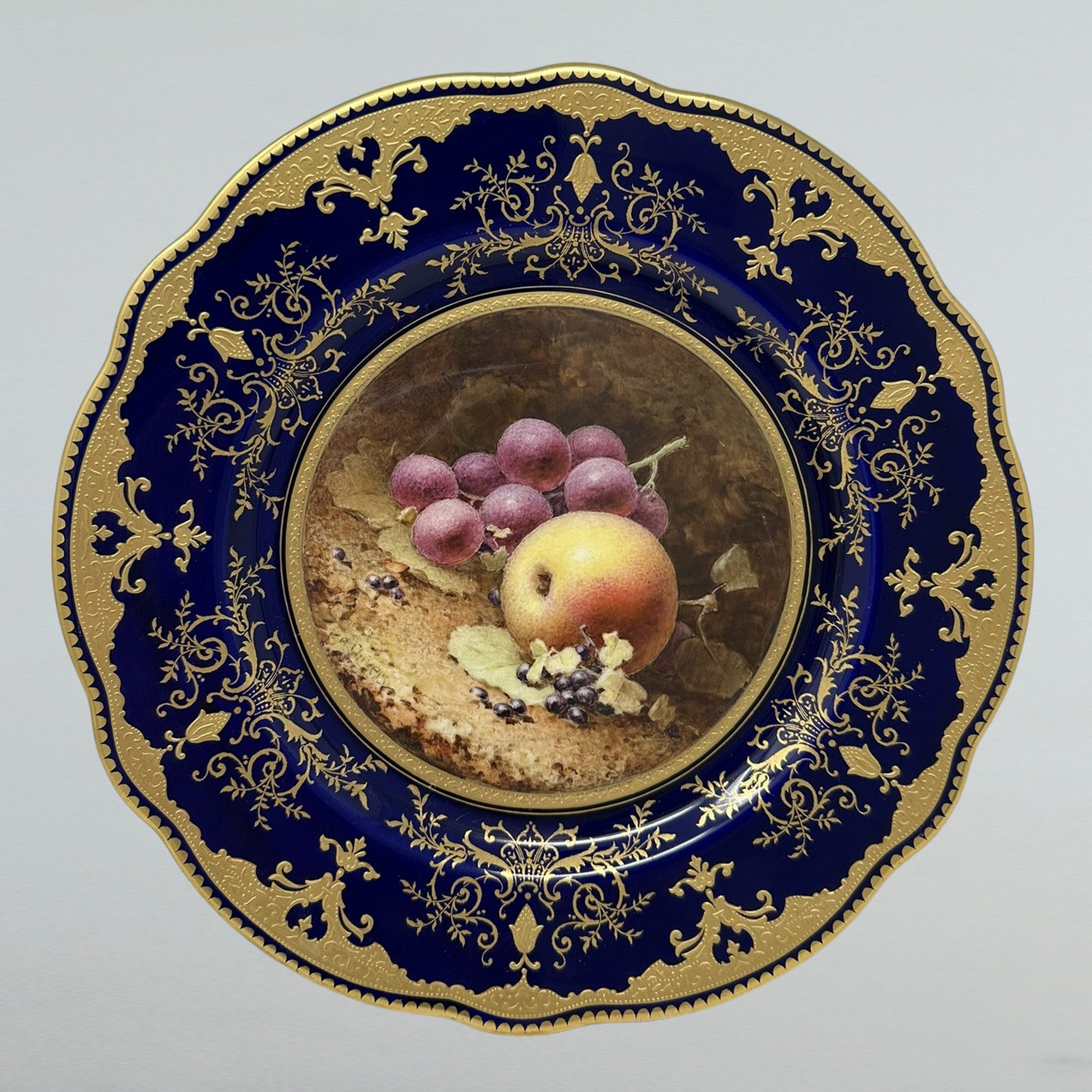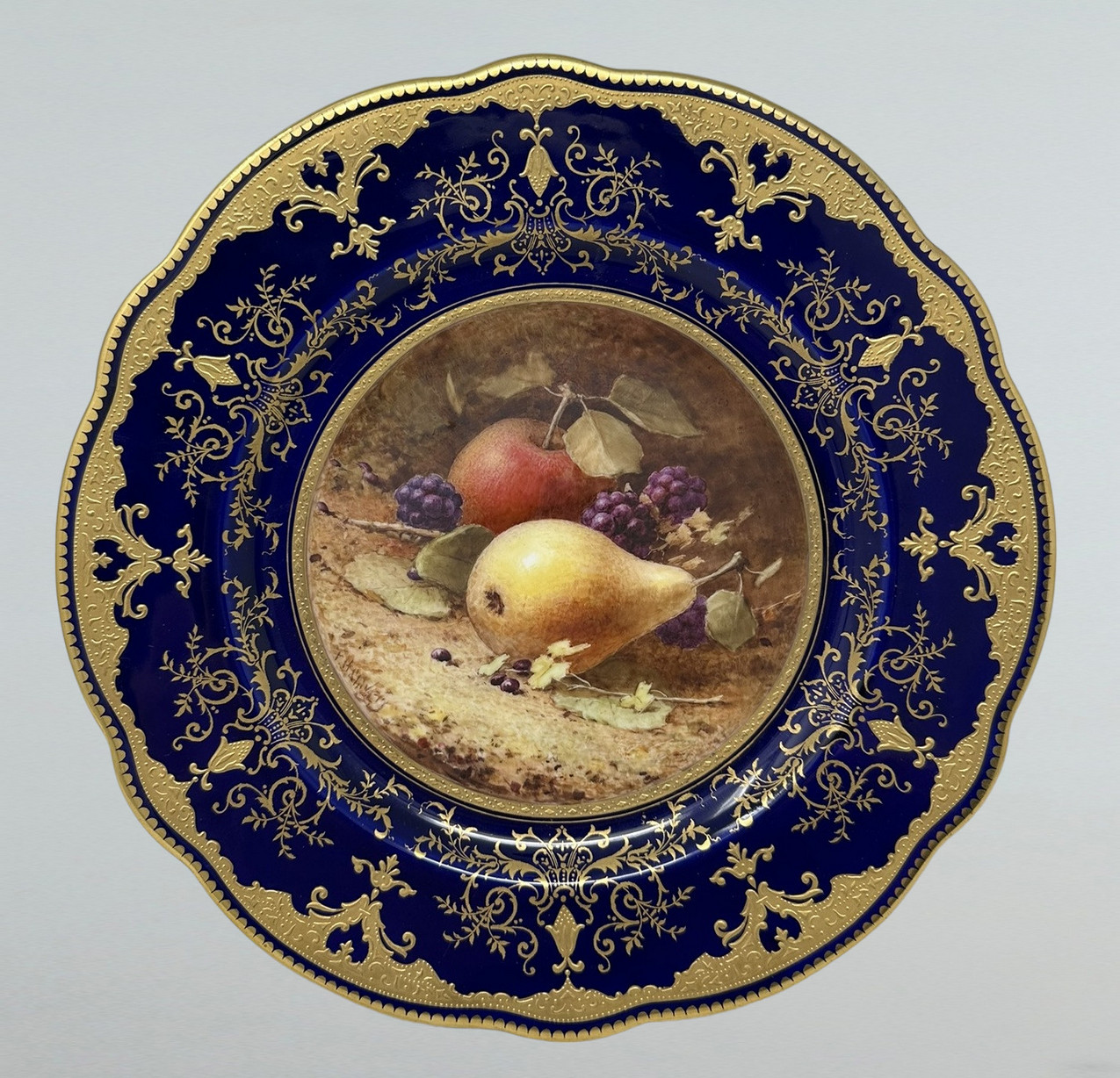 Painted with a still Life of fruits depicting a large pear, apple, a peach, grapes and blackcurrants on a mossy and ivy clad bank, each signed lower left, within a broad cobalt blue wavy border enriched with lavish tooled 24ct. gilt scrolls, dentil rim, dark cobalt blue borders, painted crown mark as shown.