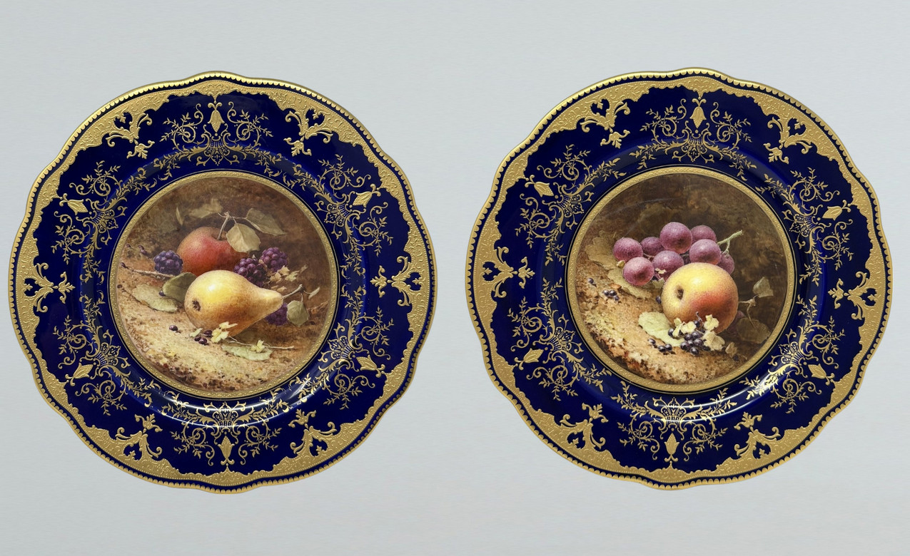 Frederick H Chivers 1881-1965 Fruit & Flower Painter: Worked for the Royal Worcester Porcelain Company, but by 1906 worked at Coalport Pottery specialising in Fruit Studies. The background on his exceptional work was achieved by working the ceramic colour with a matchstick, giving a stippled effect.