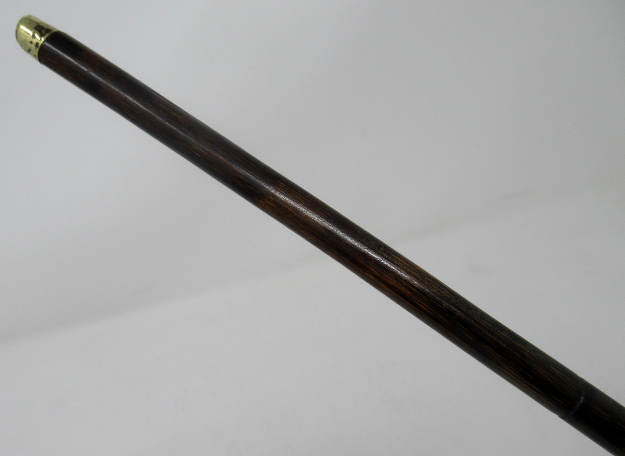 The "hammer" style grip is an actual silver mounted small wild Boar ivory tusk above a twin silver collar with a hand carved ivory inset with chevron style detail, the stylish banded partridgewood shaft ending on a bi-metal ferrule which is a little worn down.
