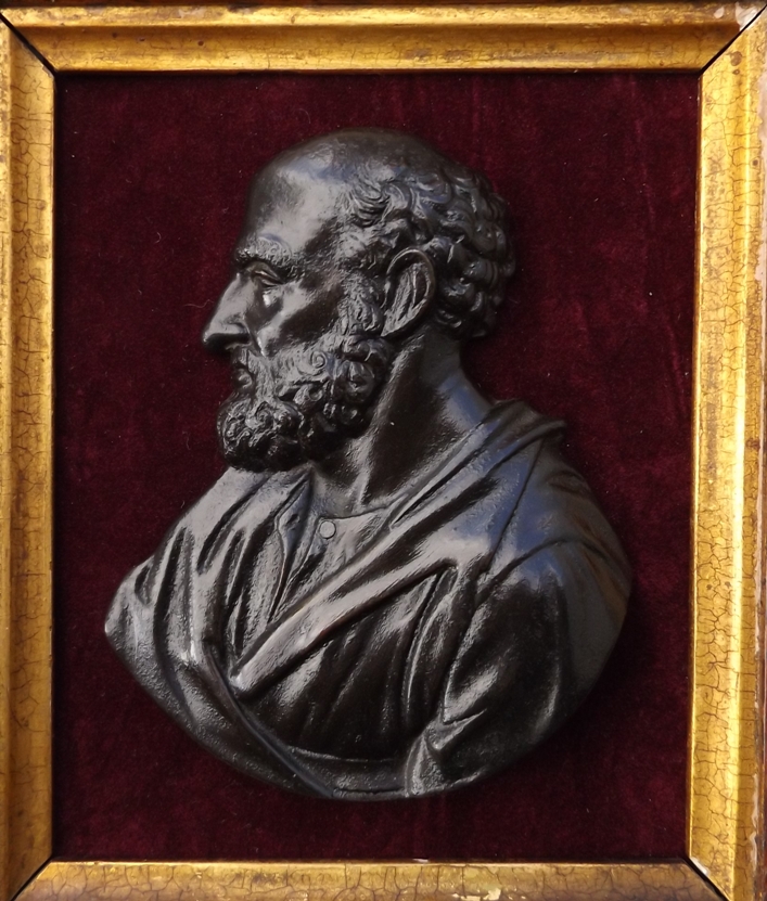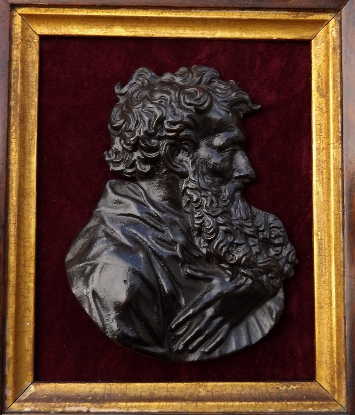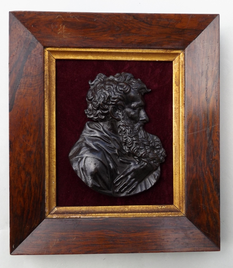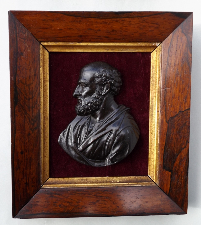 Superb Early Examples of a Pair of Grand Tour Style Framed Bronze Portraits depicting the Apostles Saint Peter and Saint Paul, superbly cast in crisp high relief, complete with their original well figured Rosewood frames. Circa first quarter of the Nineteenth Century, of Continental origin possibly France.