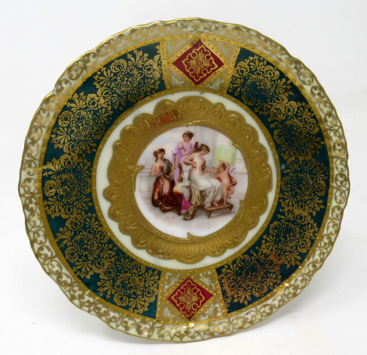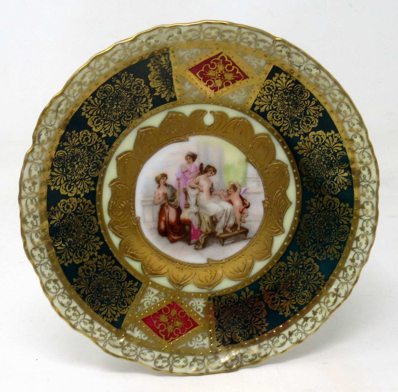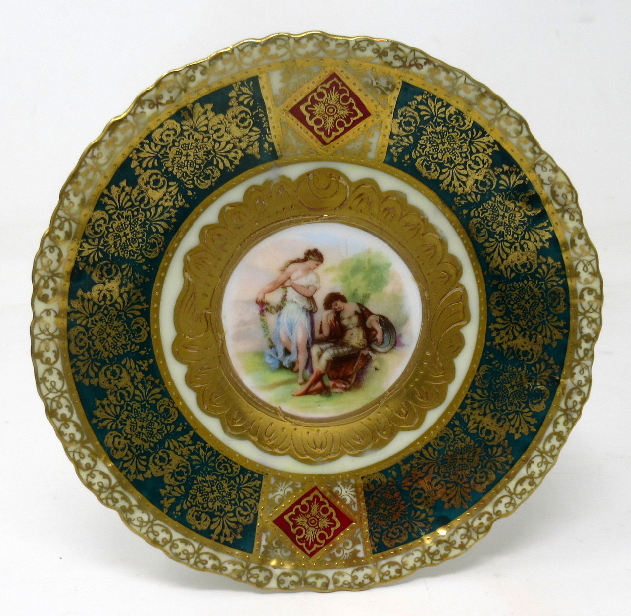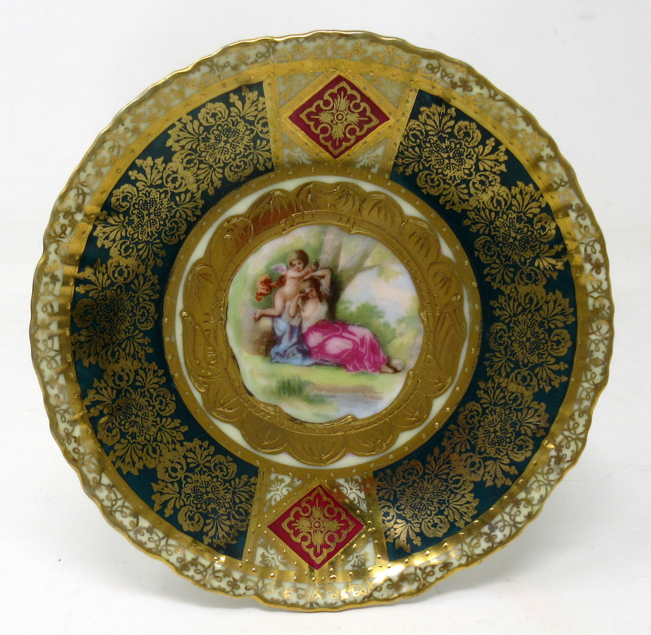 Each item with an exquisite all round frieze of hand painted highly detailed decorations on gilt "jeweled" like ground in colours of dark green and iron red, each central reserve depicting classical mythological scenes.