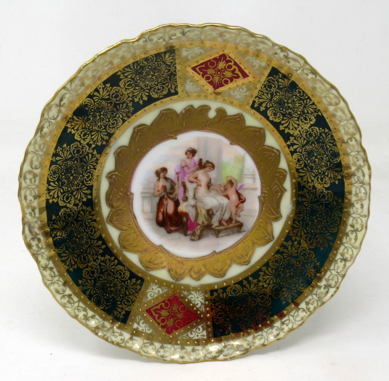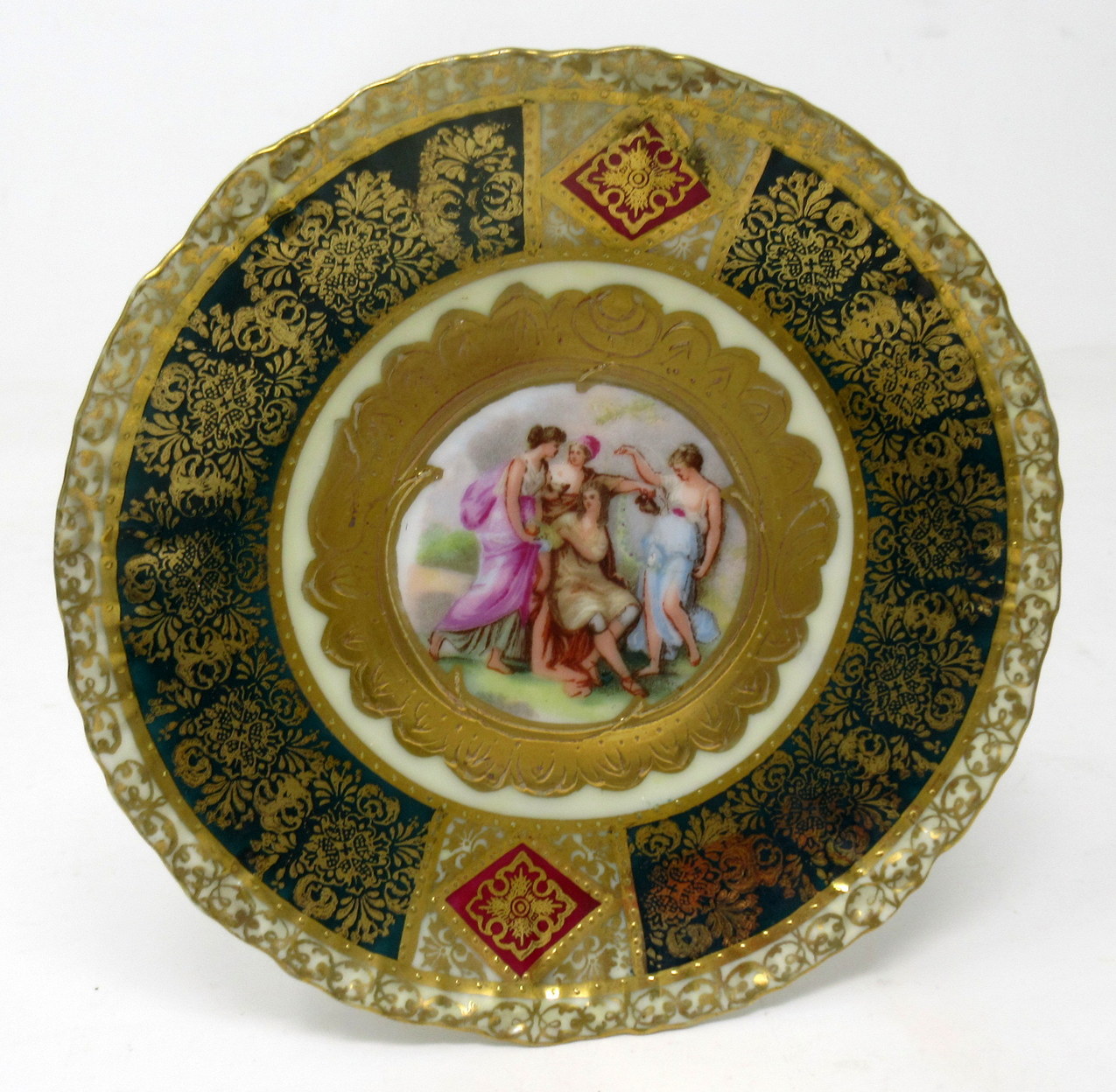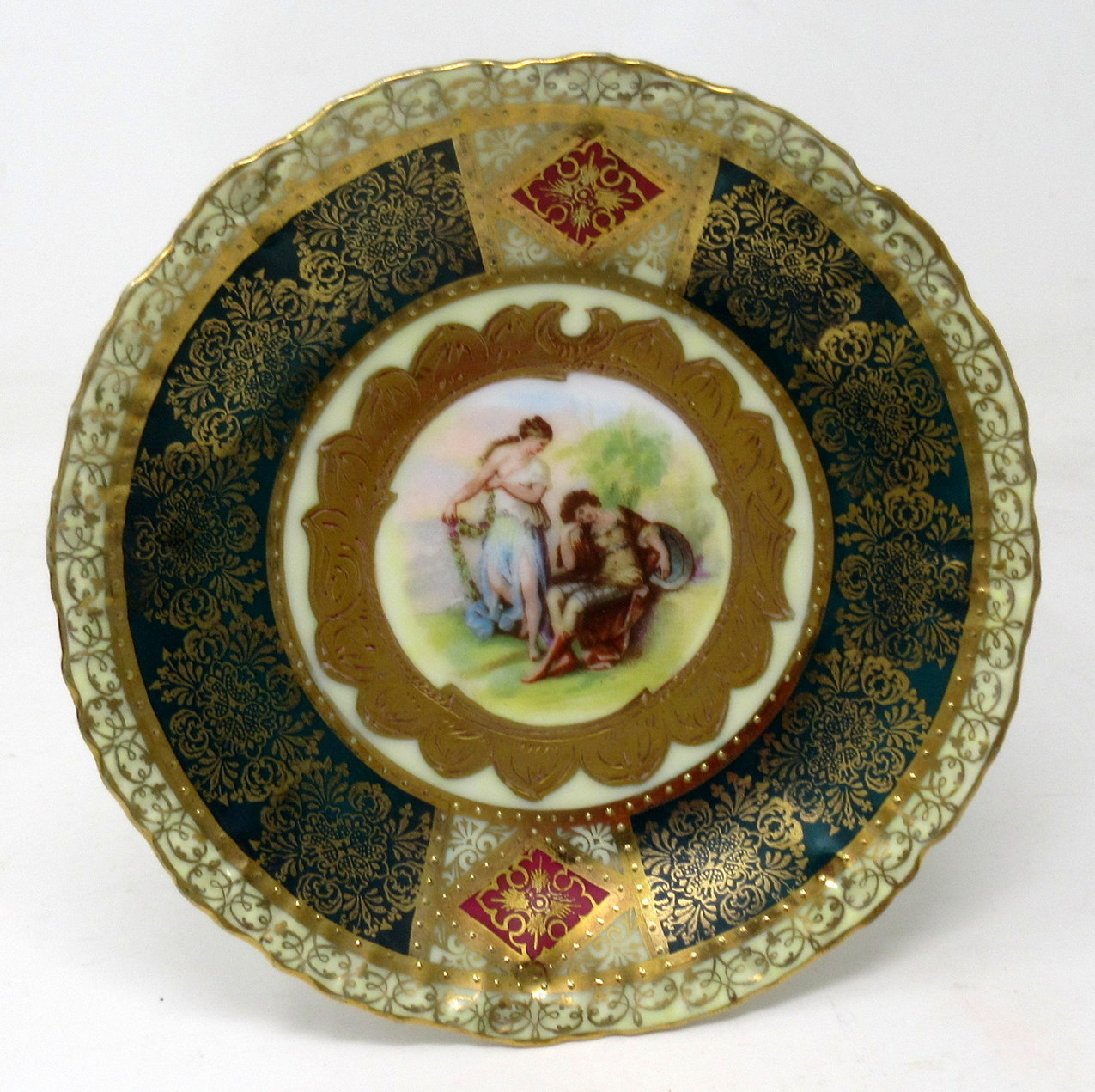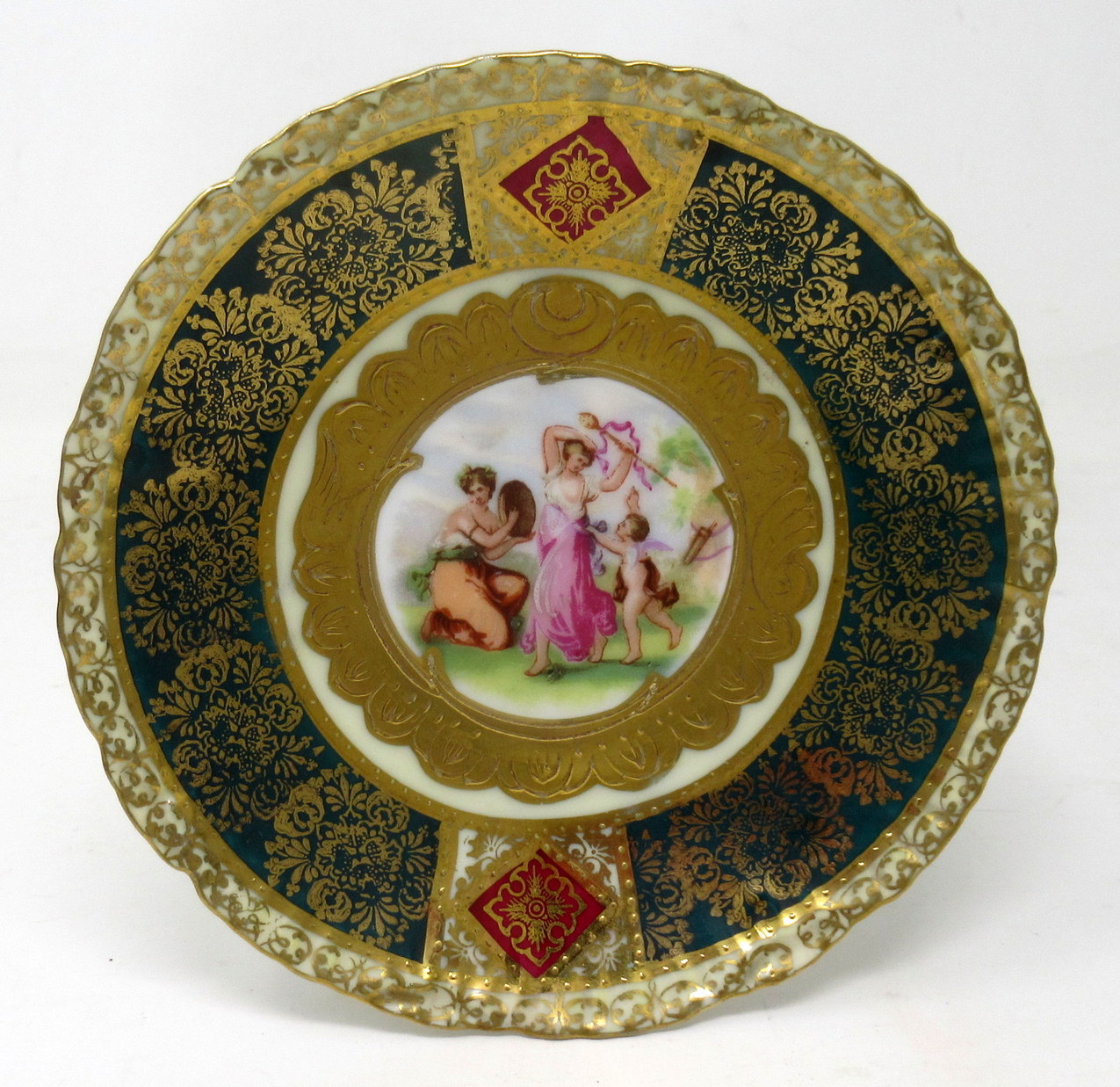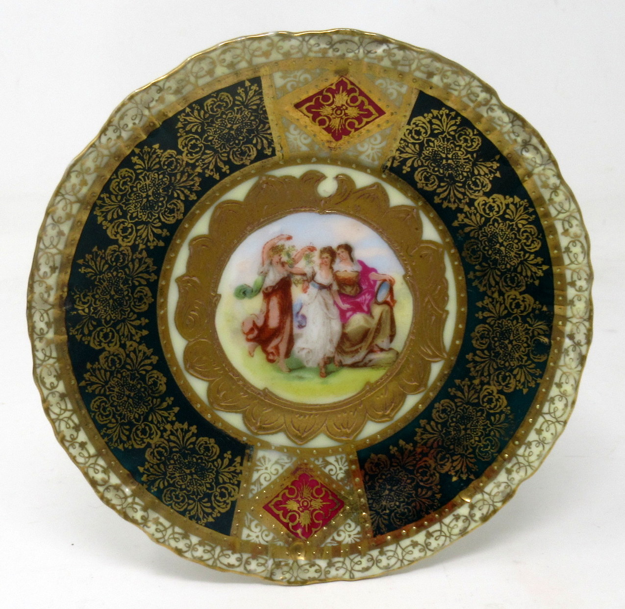 Each item with an exquisite all round frieze of hand painted highly detailed decorations on gilt "jeweled" like ground in colours of dark green and iron red, each central reserve depicting classical mythological scenes.