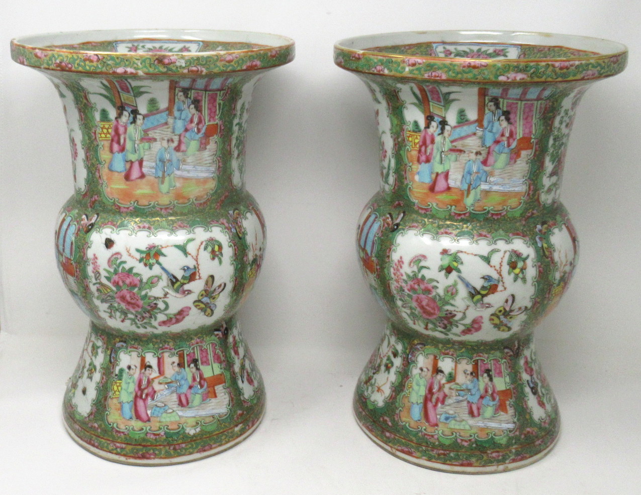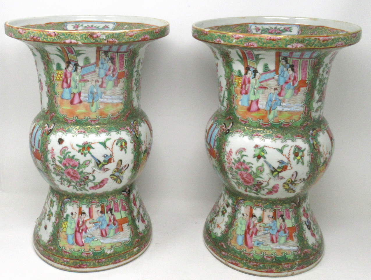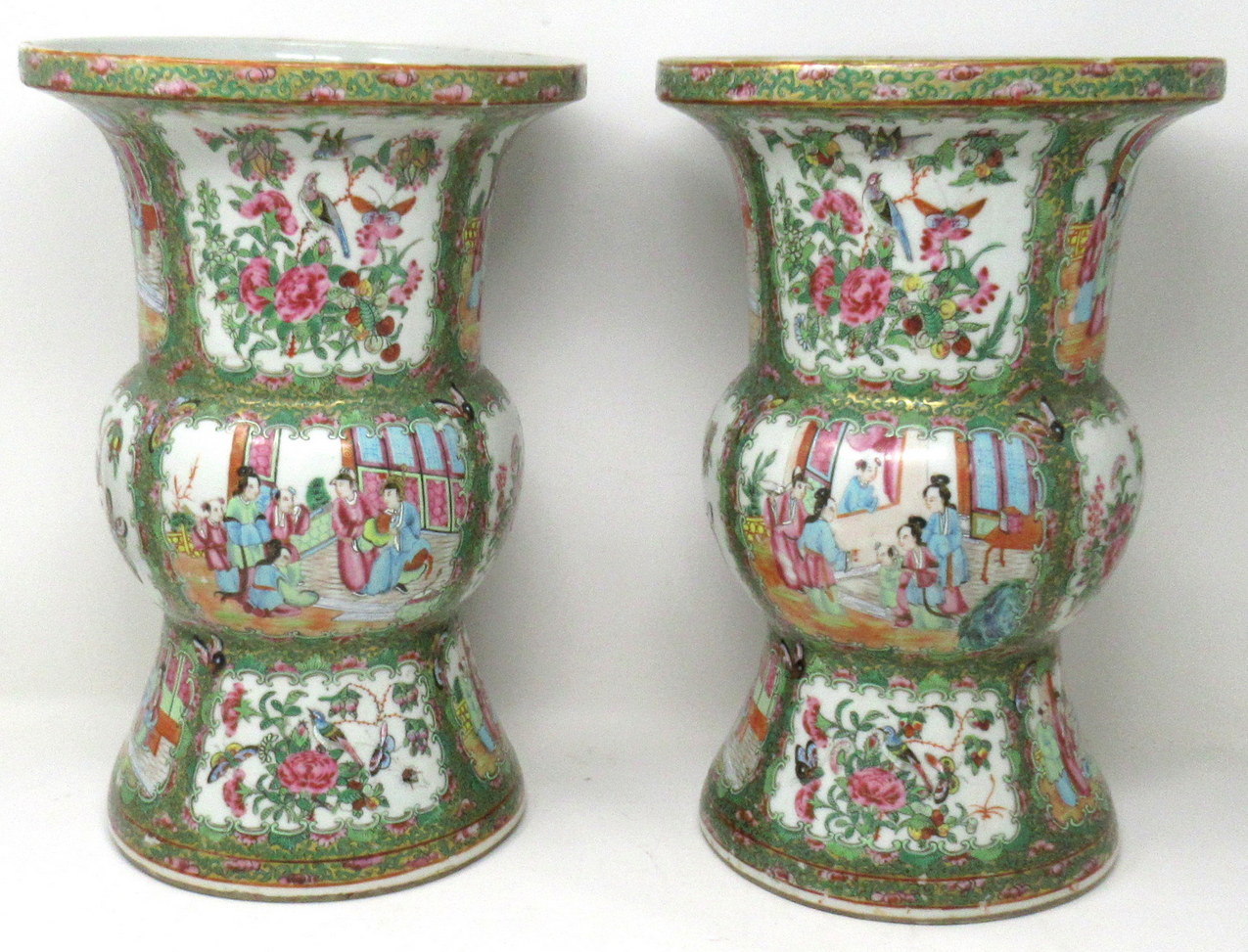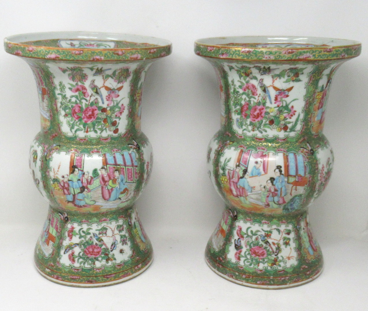 An Exceptionally Fine Pair of Chinese Cantonese Hand Decorated Porcelain Vases of rare outline Gu form, of quite good size proportions, (see last image in situ) mid Nineteenth Century, possibly earlier.