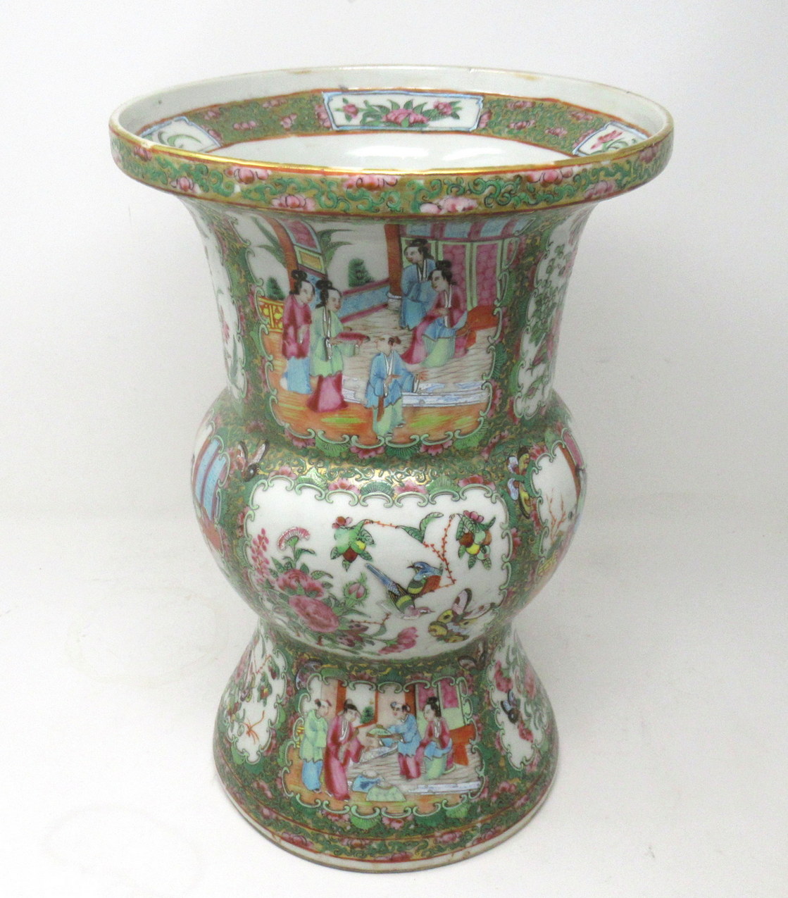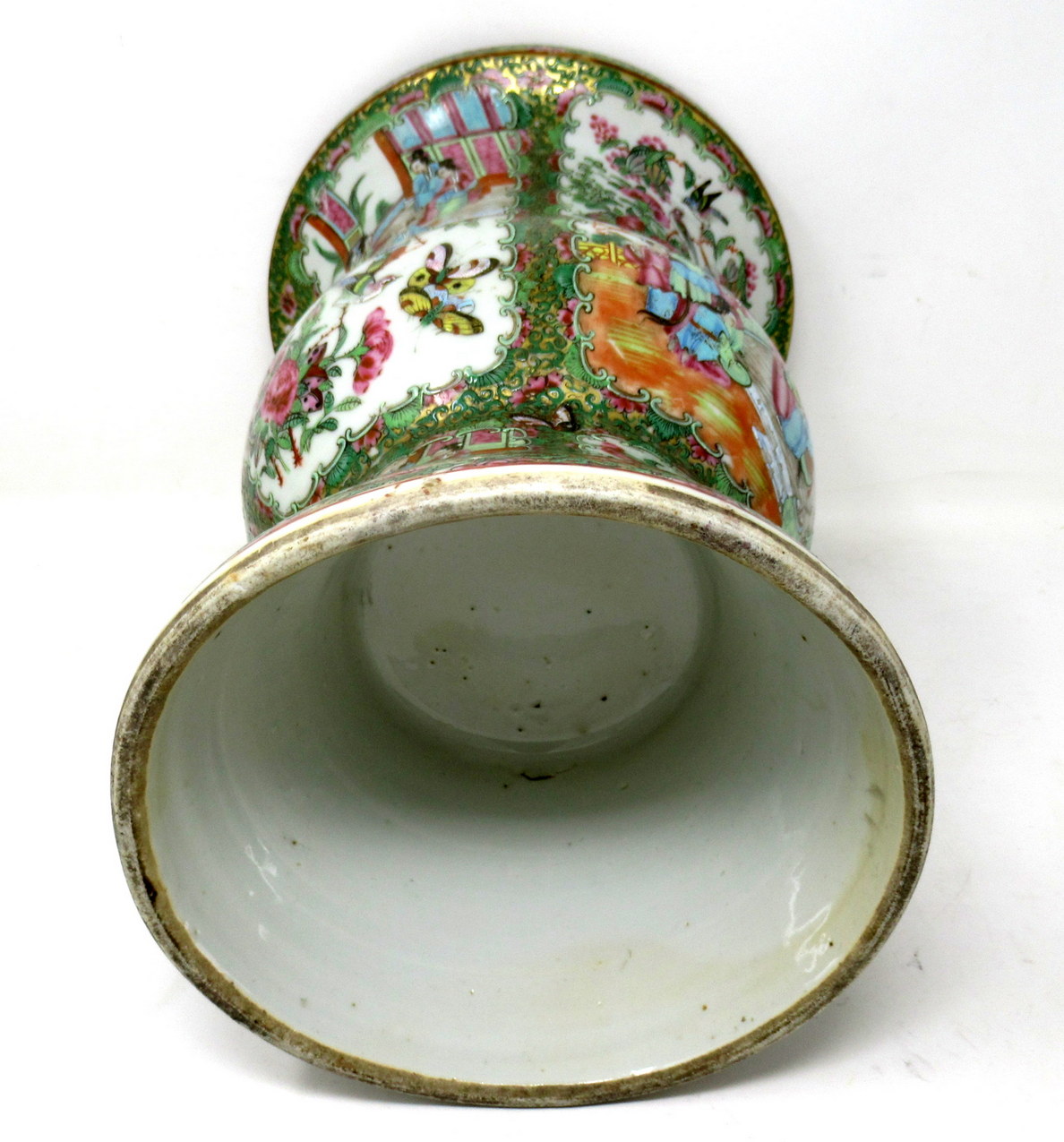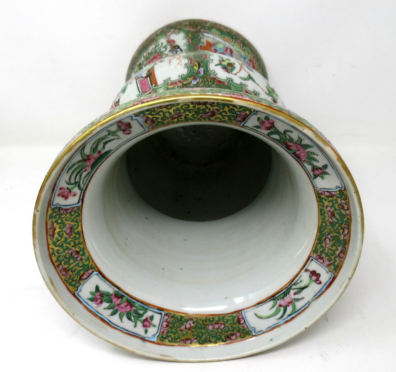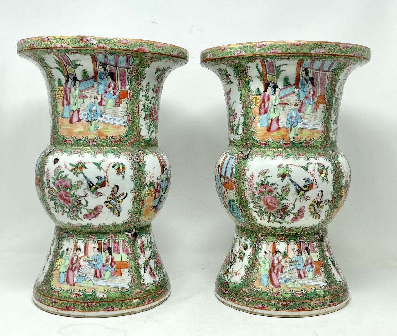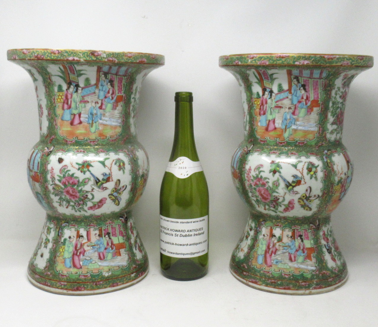 An Exceptionally Fine Pair of Chinese Cantonese Hand Decorated Porcelain Vases of rare outline Gu form, of quite good size proportions, (see last image in situ) mid Nineteenth Century, possibly earlier.