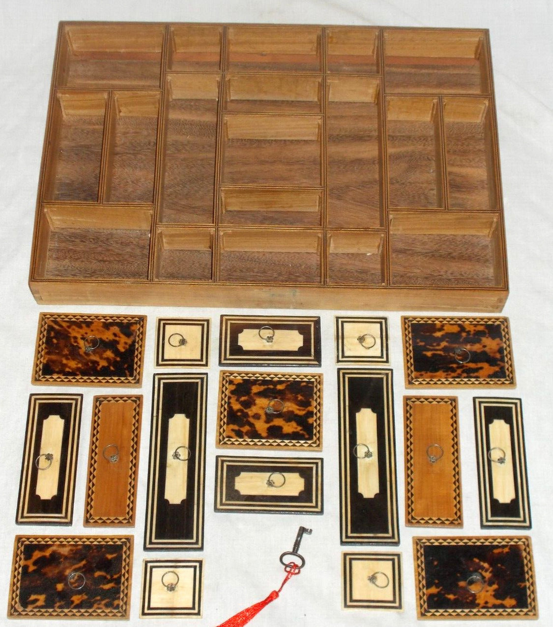The rectangular hinged lidded box opening to reveal a large amount of fitted lidded compartments, with stunning decorative covers using fruit woods and other decorative materials, the entire outer main area constructed with lavish grained Coromandel. The front complete with lower full width and depth pull out lockable drawer