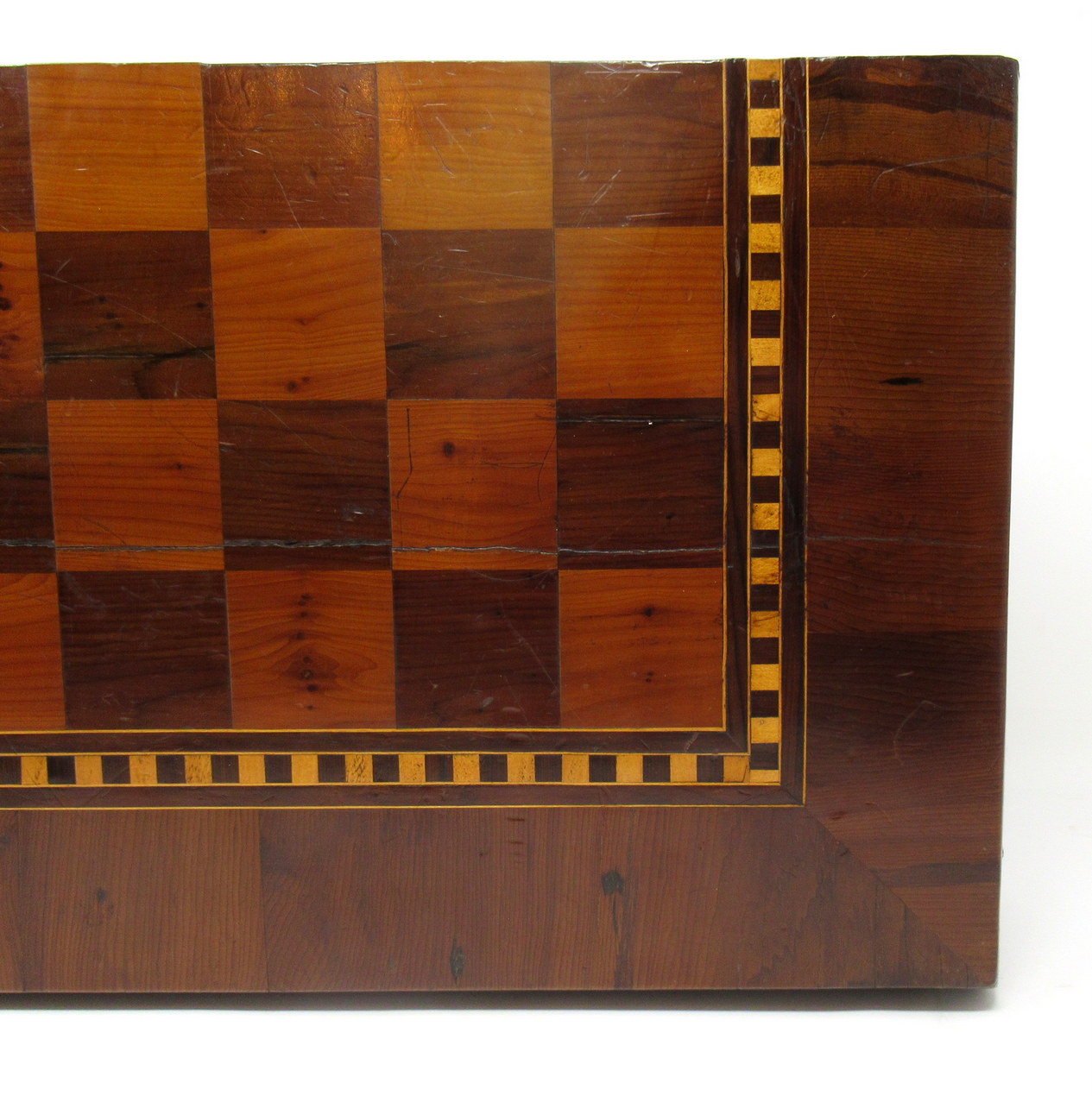 The main parquetry chess game area enclosed by an alternating border inside a plain wider border opening to reveal a traditional backgammon board.