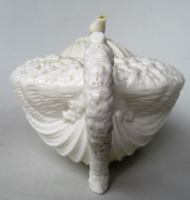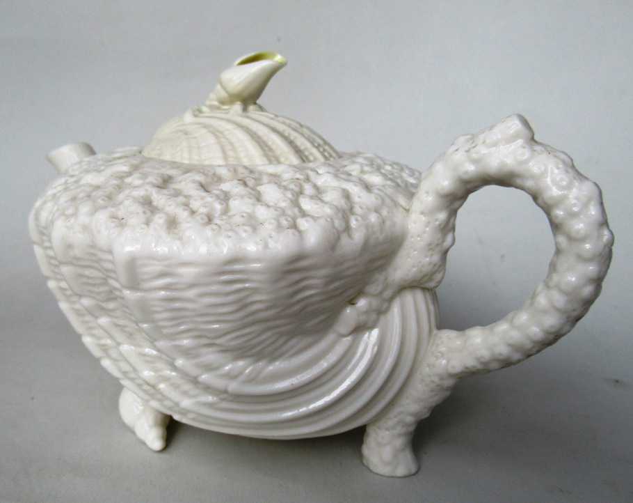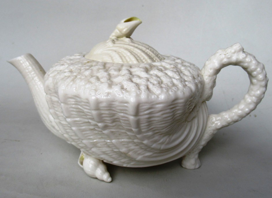 Early Irish Belleek Neptune Tea Pot with textured body raised on two periwinkle shell feet, complete with original cover with a finial moulded as a periwinkle shell also.